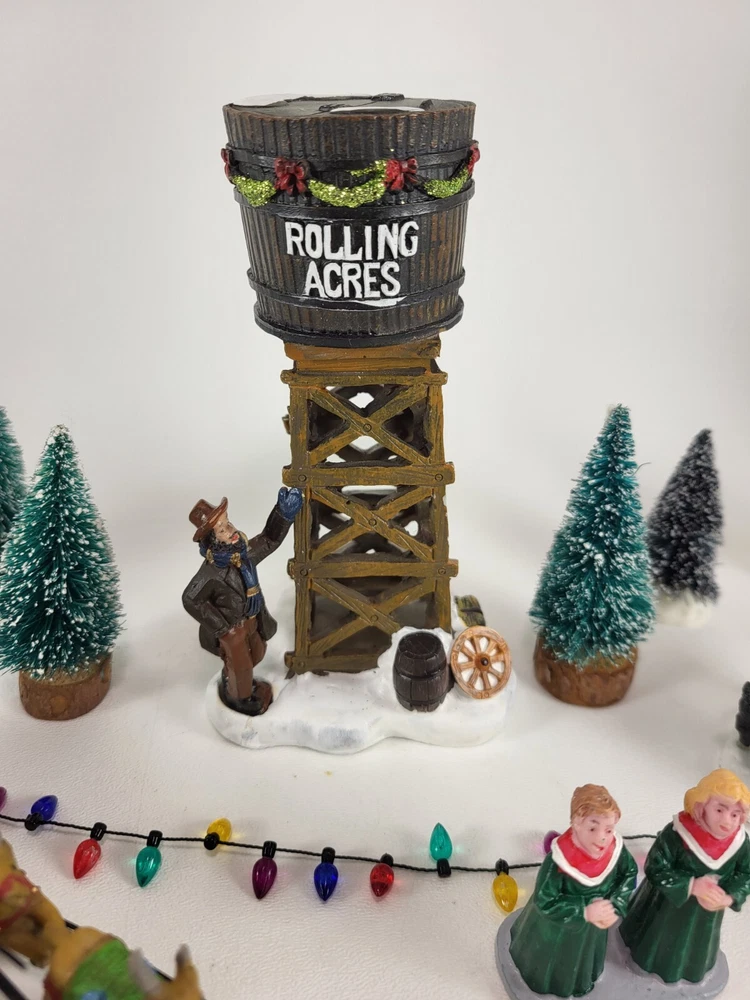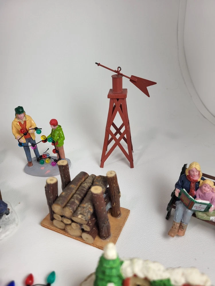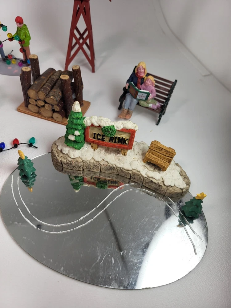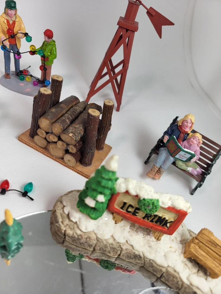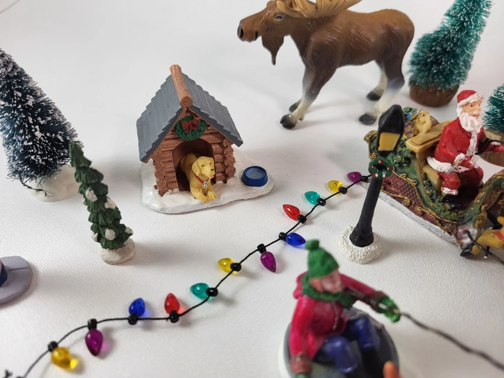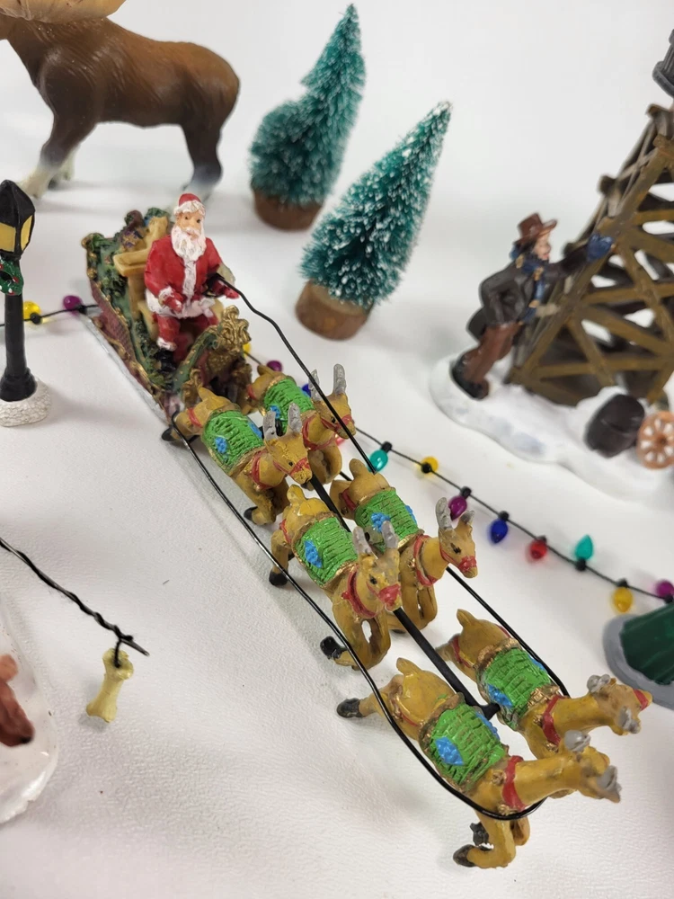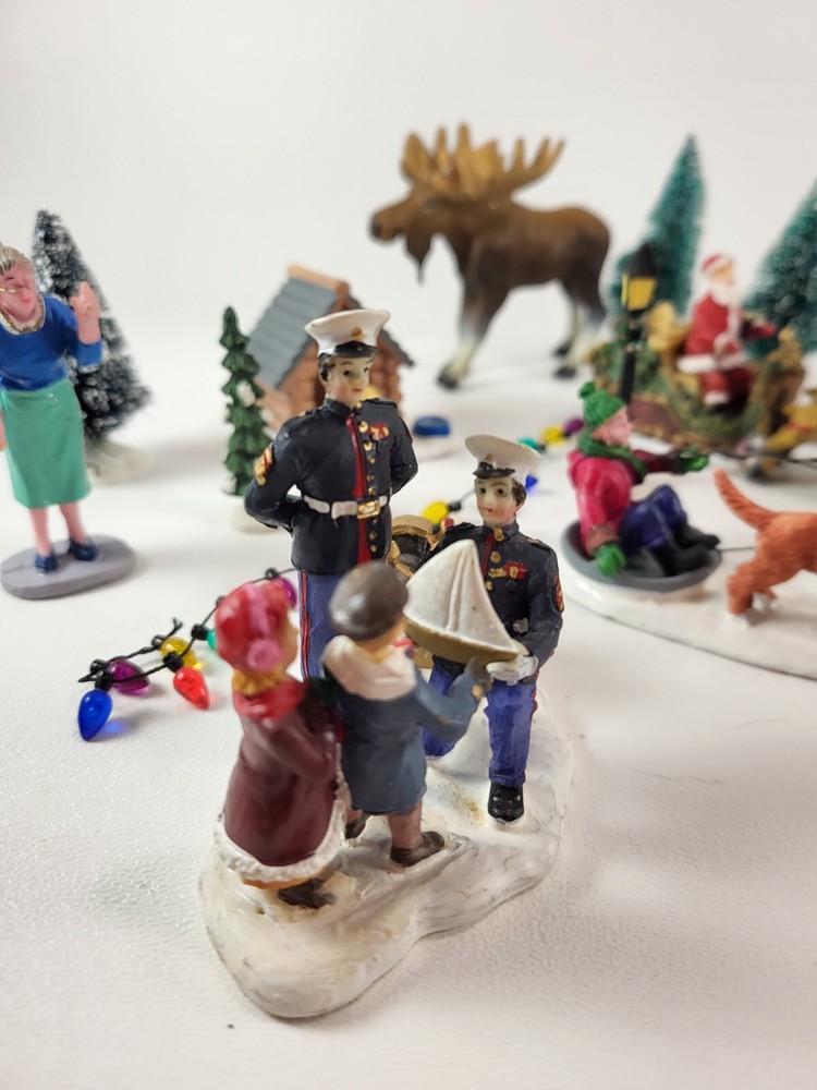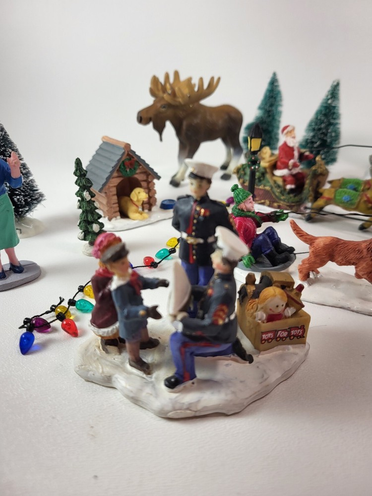 The product is a xlarge lot of 32 assorted pieces for a Christmas village display. The pieces include various village people, trees, a mailbox, a dog, Santa Claus, and an ice ring etc. This collection is ideal for creating a festive and lively Christmas village scene.