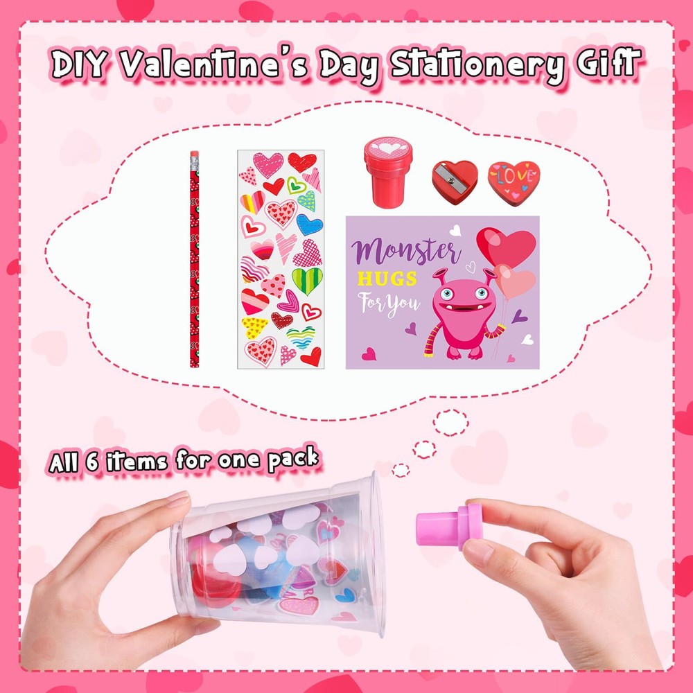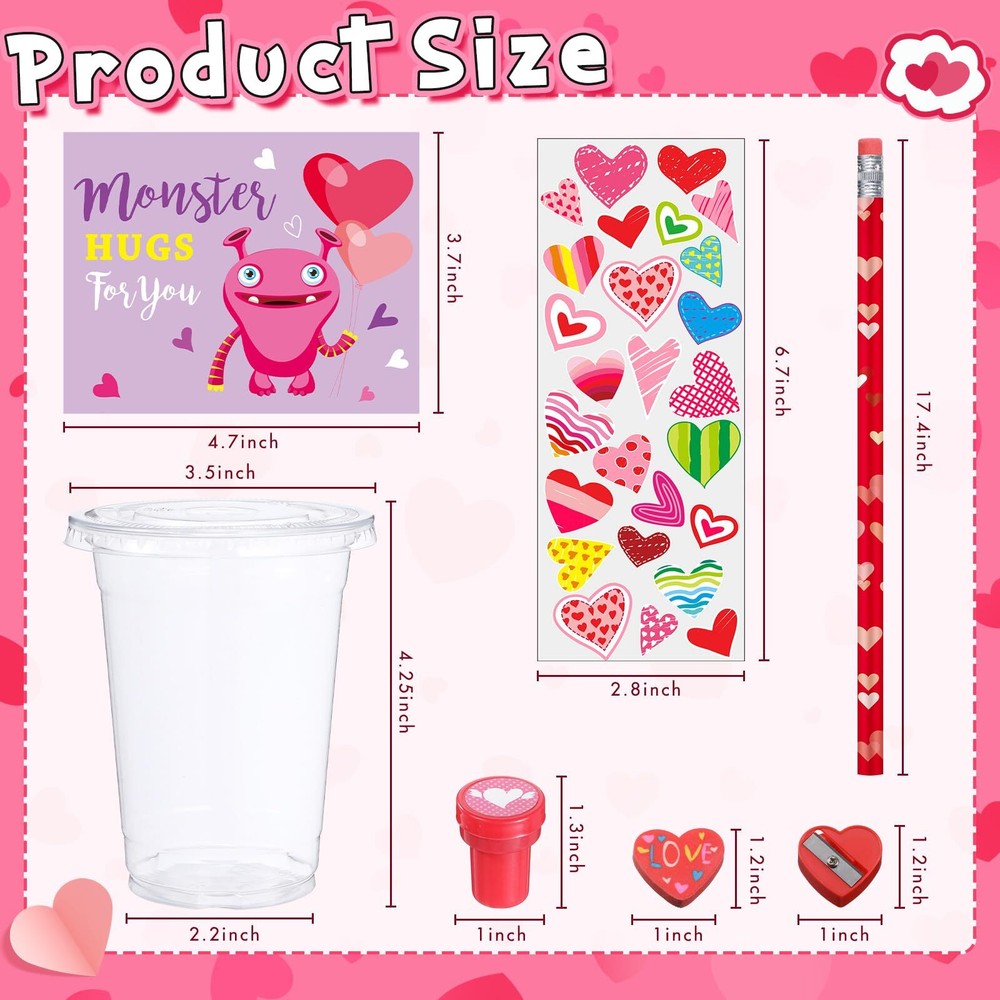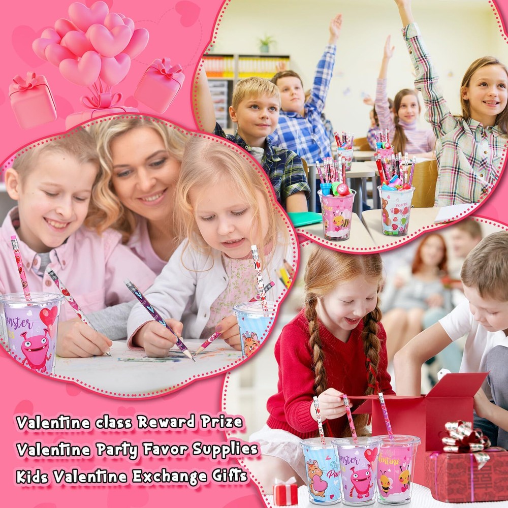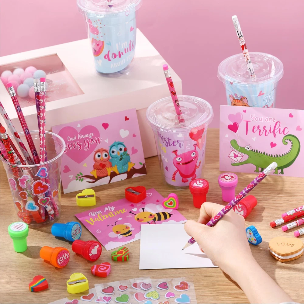 Features: Meaningful gifts: This Valentine's Day stationery gift set encourages your boys and girls to write for their friends or a special someone creatively. This is a fun way to store memories, write down their dreams and memories, and add photos, cards, ticket stubs and more to revisit their fun time over and over again. More occasions: Suitable for use as Valentine party gifts for class from teachers, as goodie bag fillers for Valentine's Day parties, or as candy Valentines treat for classroom students to exchange. Specifications: Material: quality and reliable materials Color: multicolor Size: easy to hold in hands Package includes: 32 x Valentine plastic cups 32 x Valentine pencils 32 x Valentine cards 32 x Valentine stickers 32 x Valentine erasers 32 x Valentine sharpeners Notes: Manual measurement, please allow slight errors on size. Due to the screen display, the color of the item may differ slightly from the picture. Valentines Day Stationery Kids Gift Set: you will get 32 cups with lids, 32 Valentine pencils and 32 erasers, 32 valentines cards for kids classroom, 32 sweet stickers, 32 heart shaped sharpeners, 224 pcs in total, which will attract boys and girls attentions, can serve as Valentine's Day gifts for kids classroom Valentines Theme Design: these Valentine s Day gifts for kids class have been designed with patterns like Valentines bear, dinosaur, cat, owl, bee, monster, hearts, etc.; The vibrant colors and romantic printings add charm to your space, immersing your boys and girls in the sweet of the season DIY Gift Time: these Valentine cup stationery set is nice for DIY Valentines Day gifts for kids cups, write the names of kids in Valentine's Day cards for kids classroom and make creative plastic cups, ideal as Valentines gift exchange class prizes or rewards to encourage kids to socialize and express gratitude Quality Material: our Valentine party favors for kids classroom are made of reliable materials, like wood, plastic, paper, ensuring they maintain the appeal and quality even after rigorous use; Our priority is to provide your boys and girls with Valentine cup stationery favors that are both fun and long-lasting Wide Application: the Valentines assorted stationery set Valentines Day gifts for kids cups can be applied as Valentine party favors for kids, Valentines Day classroom gifts, Valentine stationery set, Valentines Day prizes for kids, goody bag fillers, suitable for Valentine parties, birthdays, showers, to be packed into Valentine's Day gift bags for kids classroom