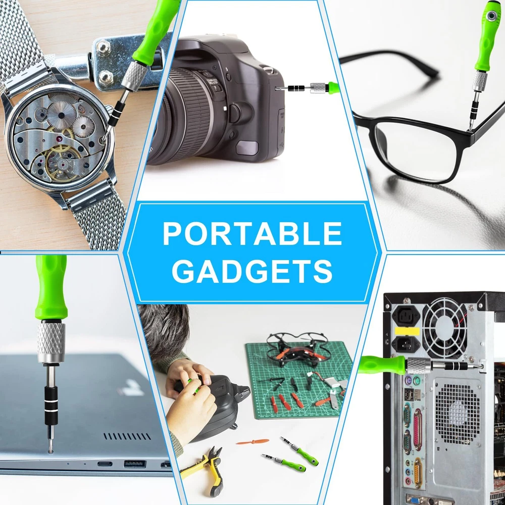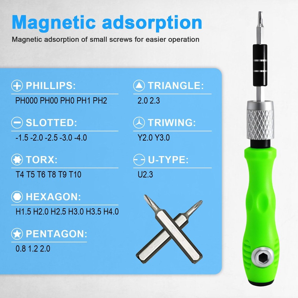 32 in 1 Small Precision Screwdriver Set, Zoikuloi Tiny Magnetic Screwdriver Sets, Professional Repair Tool Kit for Glasses, Watches, Laptop, Electronics, Toys, Jewelry, Computers Family must-have: Every family has watches, mobile phones, glasses, toys, computers, jewelry, electronic devices, etc. Similarly, every home and office has at least two screwdriver sets, which is part of your work and life. You can use them yourself or give them as presents to relatives, friends or colleagues Green handle: Green grass, green forest, green always brings wonderful visual enjoyment. The green handle is light and non-slip, ergonomically designed, and can be used horizontally or vertically. The plastic head adopts forward and backward push motion and rotatable design Screwdriver bits: 30 screwdriver bits are premium CR-V chrome vanadium steel, with phillips PH000 PH00 PH0 PH1 PH2, slotted -1.5 -2.0 -2.5 -3.0 -4.0, torx T4 T5 T6 T8 T9 T10, hexagon H1.5 H2.0 H2.5 H3.0 H3.5 H4.0, triangle 2.0 2.3, triwing Y2.0 Y3.0, pentagon 0.8 1.2 2.0, U-type 2.3, each screwdriver bit has magnetic adsorption, which can quickly replace the screws Extension rod: The extension rod is divided into 3 equal sections. The extension rod can be directly inserted into the horizontal handle for use, or the handle can be pressed in the opposite direction and then inserted into the vertical handle for use. It can be long or short and is used for screws in narrow spaces. The head of the extension rod is equipped with a black metal head with magnetic adsorption, which can quickly replace the screwdriver bits Convenient packaging: You can see 30 upright screwdriver bits through the lid of the transparent plastic storage box, allowing you to quickly find the screwdriver bits you want, open it with one button when you need it, and close it with one button when you are done, saving time and effort. Shipping We offer FREE shipping on all orders! We ship within Three business days of payment, usually sooner. We use a selection of shipping services such as UPS, FedEx, USPS etc. We only ship to the lower 48 states, no APO/FPO addresses or PO Boxes allowed. Local pickups and combined shipping options are not provided at this time. Return You can return a product for up to 30 days from the date you purchased it. Any product you return must be in the same condition you received it and in the original packaging. Please keep the receipt. Payment We accept payment by any of the following methods: PayPal Please pay as soon as possible after winning an auction, as that will allow us to post your item to you sooner! Feedback Customer satisfaction is very important to us. If you have any problem with your order, please contact us and we will do our best to make you satisfied. Contact Us If you have any queries, please contact us via ebay. We usually respond within 24 hours on weekdays. Please visit our eBay store to check out other items for sale! Thank you for shopping at our store.