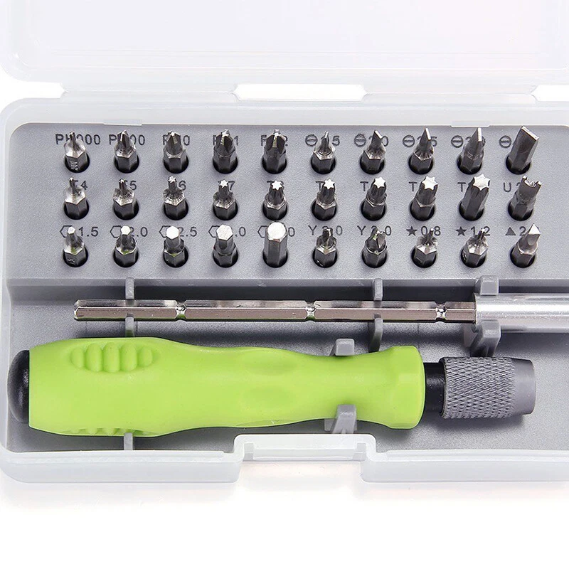 brand new and high quality Material: PP & TPR & for CR-V steel Color: as shown in pic This set of tools are designed for repair most mobile phones (include for hard drives and other electronic product. They are essential tools for family use. Features: 32-in-1 interchangeable precise manual tool set. Professional portable hardware tools. Light weight, compact design. High hardness and good toughness. PP&TPR material, non-slip handle. By using this set of tools, you can remove the small part of your cellphone/computer...and repair the device without damaging it. Size: 10cm Extended bar 10.3cm Handle 12 x 7.5 x 3cm Case Quantity: 1 Set Note: Manual measuring, please allow 0-1cm error,thank you. Due to the difference between different monitors, the picture may not reflect the actual color of the item. Thank you!!! 1 10.3cm Extended bar 1 * 10.3cm Handle 30 * types Screw driver 1 * for case