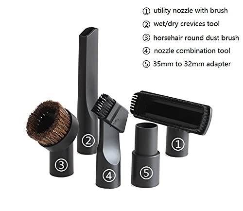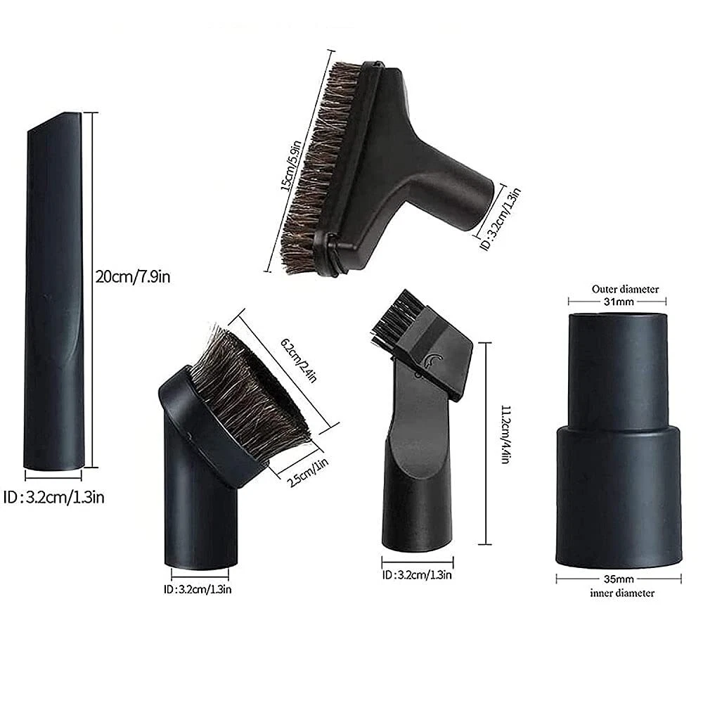 Material: Vacuum cleaning kit are made of high quality PP material, portable and durable for long time use. Application: The set are only for vacuums accepting 32mm or 35mm inner diameter vacuum cleaners, Please measure and confirm your vacuum attachments inner diameter before purchasing. Easy to Install: Easy to attach and detach, no tools required. Various Purpose: Extract dirt, pet hair, freshen up your car, curtains, fine furniture, celings or door frames. Replace your lost or old brush attachment. Set Includes: 32mm utility nozzle with brush/wet or dry vacuum crevices tool/horsehair round dust brush/nozzle combination tool, 35mm to 32mm hose adapter