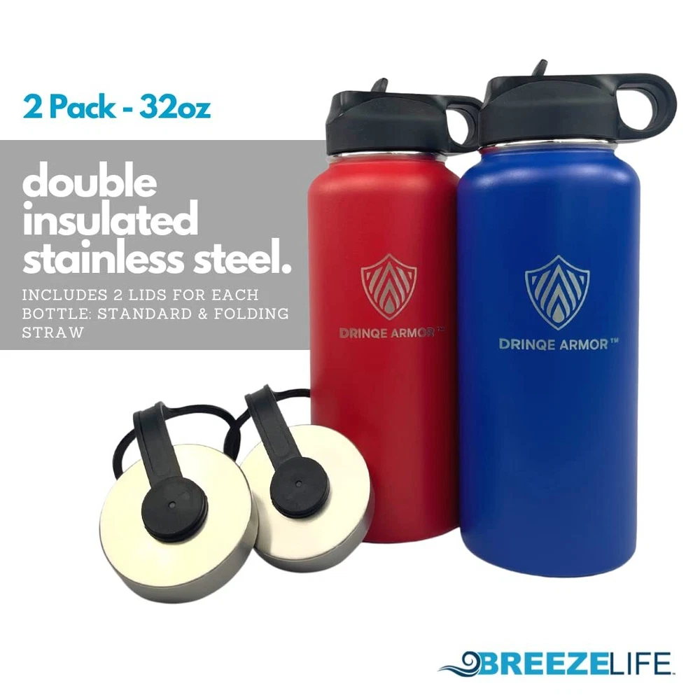 HYDRATION ON THE GO: Elevate your hydration game with our stainless steel water bottle. The perfect portable water bottle for keeping you hydrated on the go during your busy days or outdoor adventures. DOUBLE-WALL VACUUM INSULATION: Experience the magic of double-wall vacuum insulation, this insulated water bottle keeps your drinks refreshingly cold for up to 24 hours or piping hot for up to 12 hours. Enjoy your beverages at the perfect temperature. PRO-GRADE STAINLESS STEEL: Crafted with 18/8 pro-grade stainless steel, the metal water bottle guarantees pure taste and exceptional durability. The powder-coating provides an anti-scratch and non-slip surface, providing a resilient exterior for daily use. 100% BPA-FREE: Experience peace of mind with our stainless steel BPA free water bottle that’s 100% BPA-free and Phthalate-free. Sip with confidence, knowing your drink will maintain its original flavor, sip after sip. 2-PACK BOTTLE SET: Our 32oz water bottle pack includes a Blue and Red large water bottle with straw lid. The bottles come with a standard wide mouth lid that allows for easy filling and cleaning.