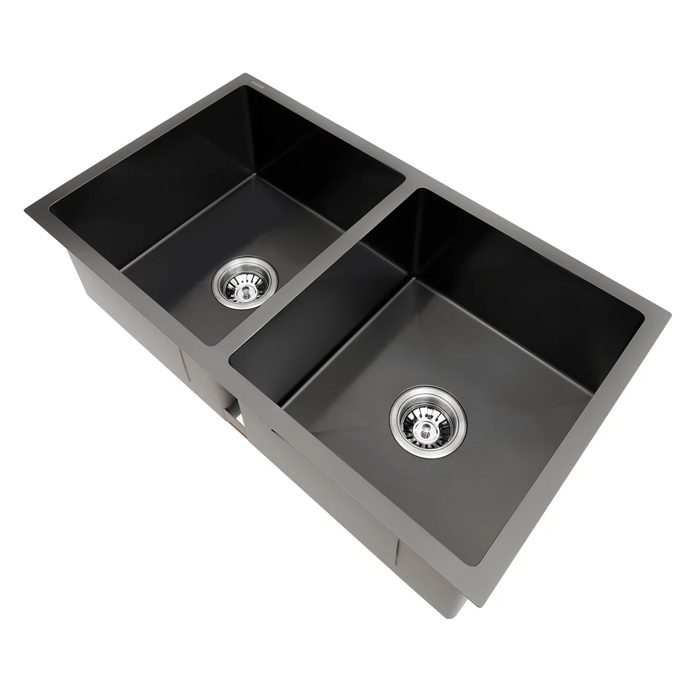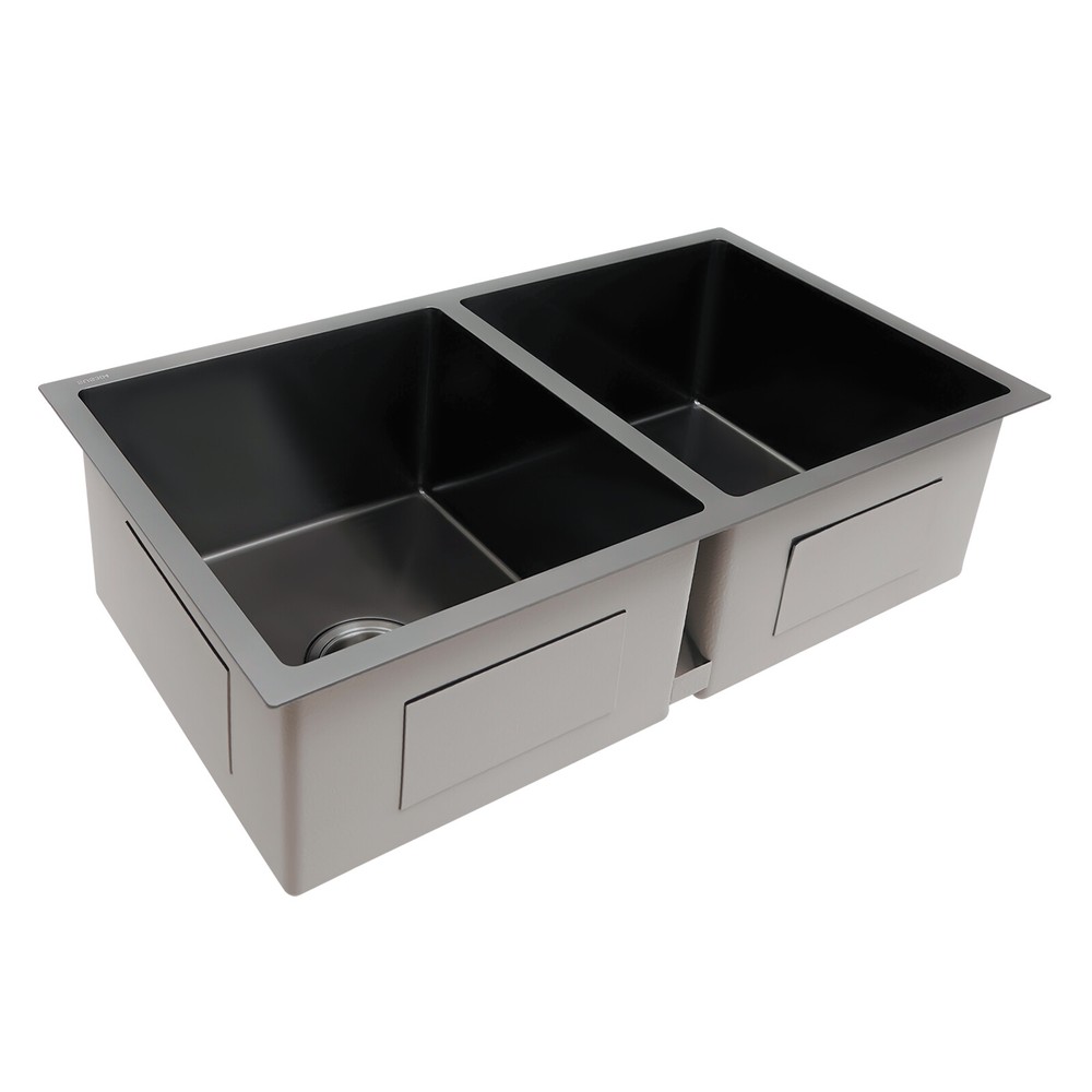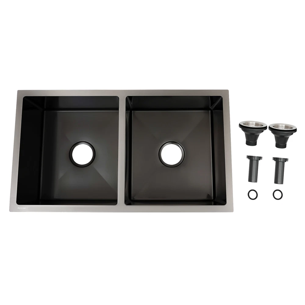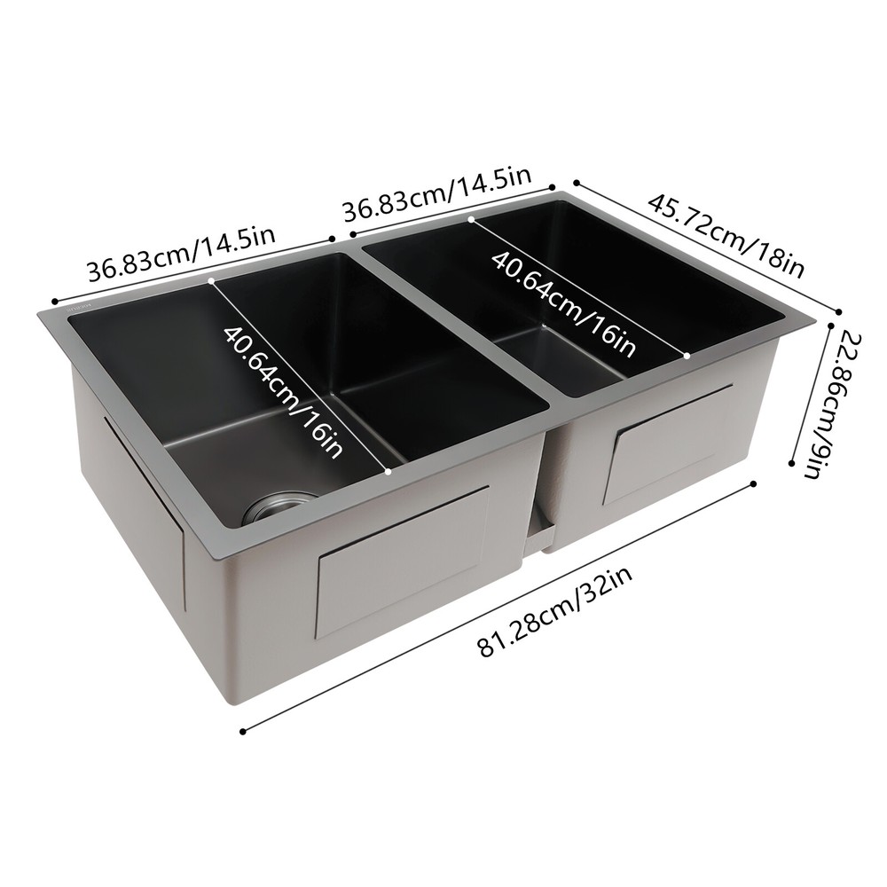 Specifications Material: 304 Stainless Steel, Rubber Color: Black Assembly Requirements: Yes Process: Brushed, Blackening Style: Modern Stainless Steel Thickness: 3mm/0.12in Number of Bowls: 2 Gross Weight: 12kg/26.46lbs Single-bowl Size: 36.83*40.64cm/14.5*16in Overall Product Size: 81.28*45.72*22.86cm/32*18*9in Pakage Size: 85*54*28cm/33.46*21.26*11.02in 32"x18'' Drop-in Double Bowl Basin Kitchen Sink Black With Filter Baskets Welcome to our store^-^ Description This 304 stainless steel sink is made of high-quality material and adopts excellent brushed and blackening workmanship, making it hard-wearing and corrosion-resistant . Its enlarged and deepened 2 sinks not only reduce water splashing, but also increase the space for cleaning a lot of cookware. With it, you can enjoy a more convenient life. Key Features Build to Last: It is made of high-quality 304 stainless steel with brushed and blackening processes, s o it has good corrosion resistance , oxidation resistance an d strength. It can be used in wet environments such as the kitchen and laundry room. Large Capacity : You can put a large number of dishes in 2 bowls of 32*18*9 inches, making it more comfortable and efficient for you to clean. So it is a great helper for you to clean dishes or prepare food. Good Sealing : The connection between the downpipe and the drain is fitted with high-quality connectors and rubber seals, adding to its good sealing to avoid leaks. Separate Cleaning : 2 separate bowls are equipped with separate downpipes, so they can be used independently. You can wash different dishes and vegetables at the same time without interfering with each other. Effortless Cleaning: The stainless steel surface is brushed, so it is very smooth. Therefore, you only need to wipe it with a soft cloth to keep it neat and tidy. Easy to Assemble : The complete range of mounting parts and the simple construction of the product allow you to install it quickly and accurately in a short time. Thoughtful Design: We use high-quality stainless steel filters, which are corrosion-resistant a nd can be used for a long time. And it collects food and debris, preventing debris from clogging the pipes thus saying goodbye to unpleasant smells. It is equipped with an acoustic insulation system that includes a protective coating and an eco-friendly rubber mat that reduces the harsh sound of running water or the echo of falling cutlery. Modern and Simple: The low-key and luxurious black color, delicate connections, and smooth streamlines give this sink set a modern and simple appearance, which fits most household styles. Quality Service: We are honored that you have chosen our product. We have sufficient confidence in the quality of the product so that you can buy it confidently. But if you have any questions, you can contact our customer service, he will patiently answer and solve your problems. Details Thickened Panel: The 3mm thickened panel can provide better support and load-bearing force for the sink. X-shape Diversion Line: It can help guide and accelerate the water-flowing speed and keep the sink bowl dry and clean when not in use. Arcs Shape: The rounded and smooth edges not only add to the aesthetics of the product but also improve the safety of use. Application This product can be widely used in homes, restaurants, laundry rooms, basements, bars, kitchens, food trucks, dessert shops, coffee shops, hotels, garages, gardens, pet shops, etc. for cleaning tableware, vegetables, fruits, pets, etc. Specifications Material: 304 Stainless Steel, Rubber Color: Black Assembly Requirements: Yes Process: Brushed, Blackening Style: Modern Stainless Steel Thickness: 3mm/0.12in Number of Bowls: 2 Gross Weight: 12kg/26.46lbs Single-bowl Size: 36.83*40.64cm/14.5*16in Overall Product Size: 81.28*45.72*22.86cm/32*18*9in Pakage Size: 85*54*28cm/33.46*21.26*11.02in Package Included 1* 304 Stainless Steel Sink 2*Filter Baskets 2*Sealing Rings 2* Connection Hoses Notes Please check the size carefully before ordering. Please do not scratch its surface with sharp objects to obtain a longer service life. If you want to get a better installation result, we recommend that you hire a professional plumber to install it. Please allow the slight color difference caused by the shooting light and 1-3cm error due to manual measurement, and make sure you do not mind before you order. Payment Delivery details Terms of sales About us Contact us Payment We accept ebay payment 。 Fees such as import duties, taxes are not included in the item price or shipping costs. These charges are the buyer's responsibility. Delivery details Shipping: 2-9 working days to: USA Terms of sales We maintain high standards of excellence and strive for hundred percent customer satisfaction. Feedback is very important to us. We hope that you contact us immediately before you give neutral or negative feedback, so that we can address your concerns. It is impossible to address issues if we do not know about them! About us Your satis faction is our ultimate goal. We work hard to earn your trust and future business. Our certified technicians have tested each item before shipping. The unit comes with 1 year limited warranty on all manufacturing defects. a) If you receive a defective item, you may return it or ask for a discount. Please contact us within 14 days after you receive the package. b) What you returned must be intact and in its original packaging as re? u. Customer is responsible for shipping costs of the returned item. c) We will cover the cost of shipping back t with the shipping rate indicated in the registration page. We will send you a new unit or refund the full payment you paid. Thank you. Contact us Business Hour Business Hour: Monday To Friday: 8:30 AM to 5:00 PM (Beijing China time) Due to time zones, our reply to your questions may not be immediately. But within above working time, we will reply your email within 24 hours. If it's non-workdays, please kindly be patient and wait ti