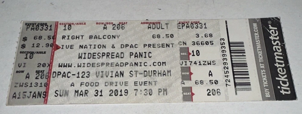3/31/19 Widespread Panic Band Concert Ticket Stub Durham Performing Arts WSP