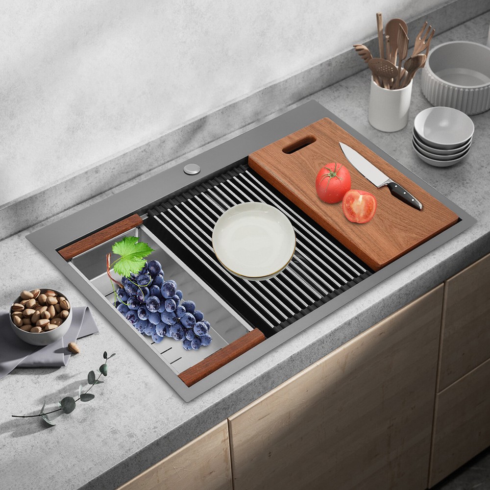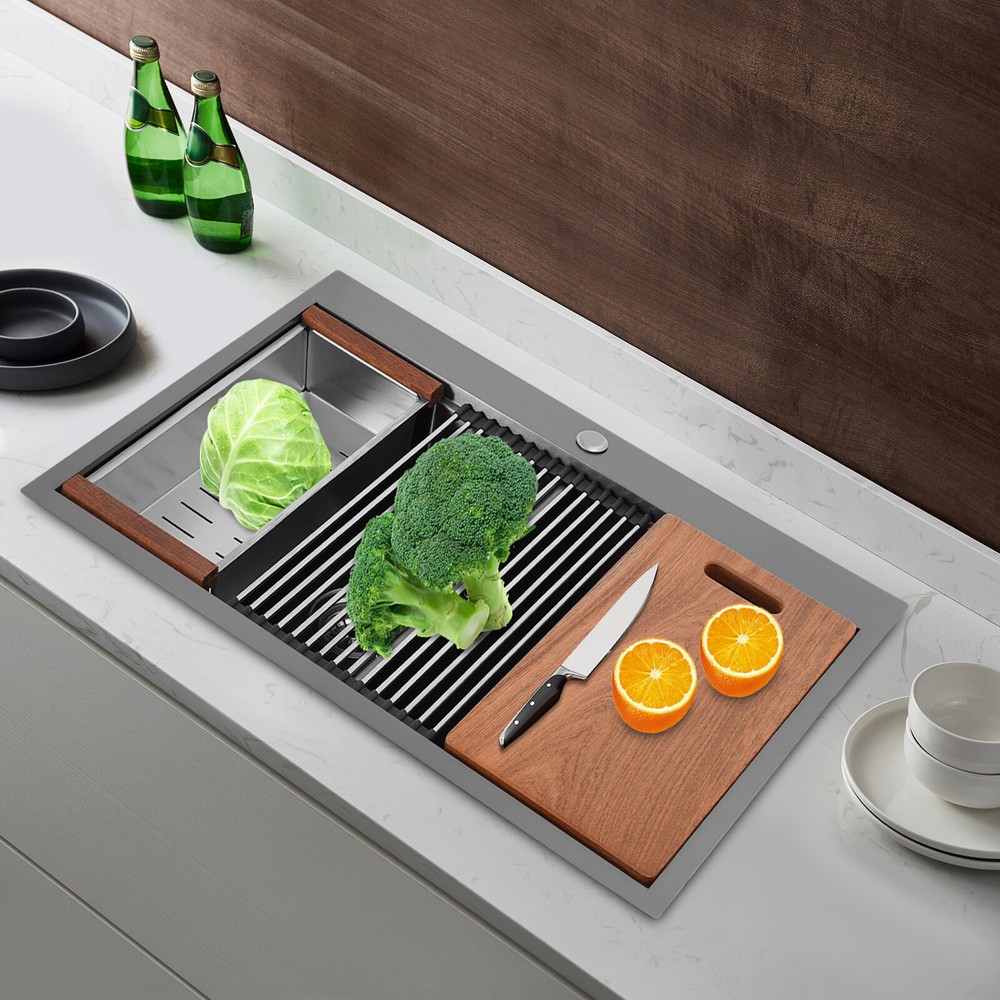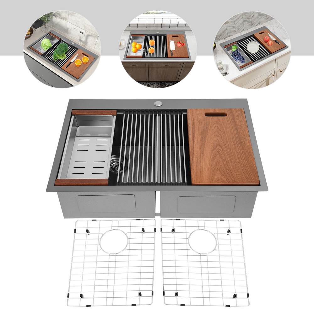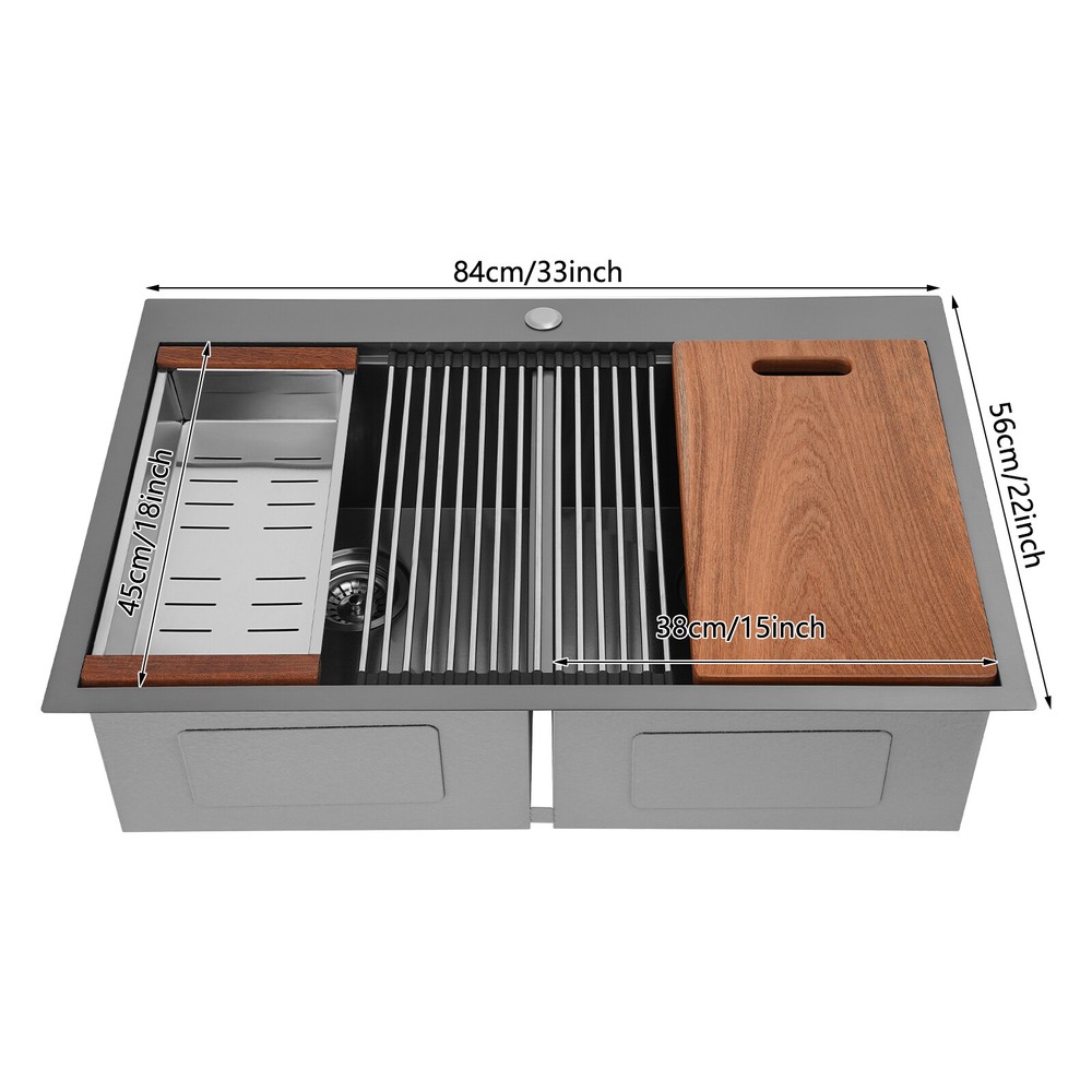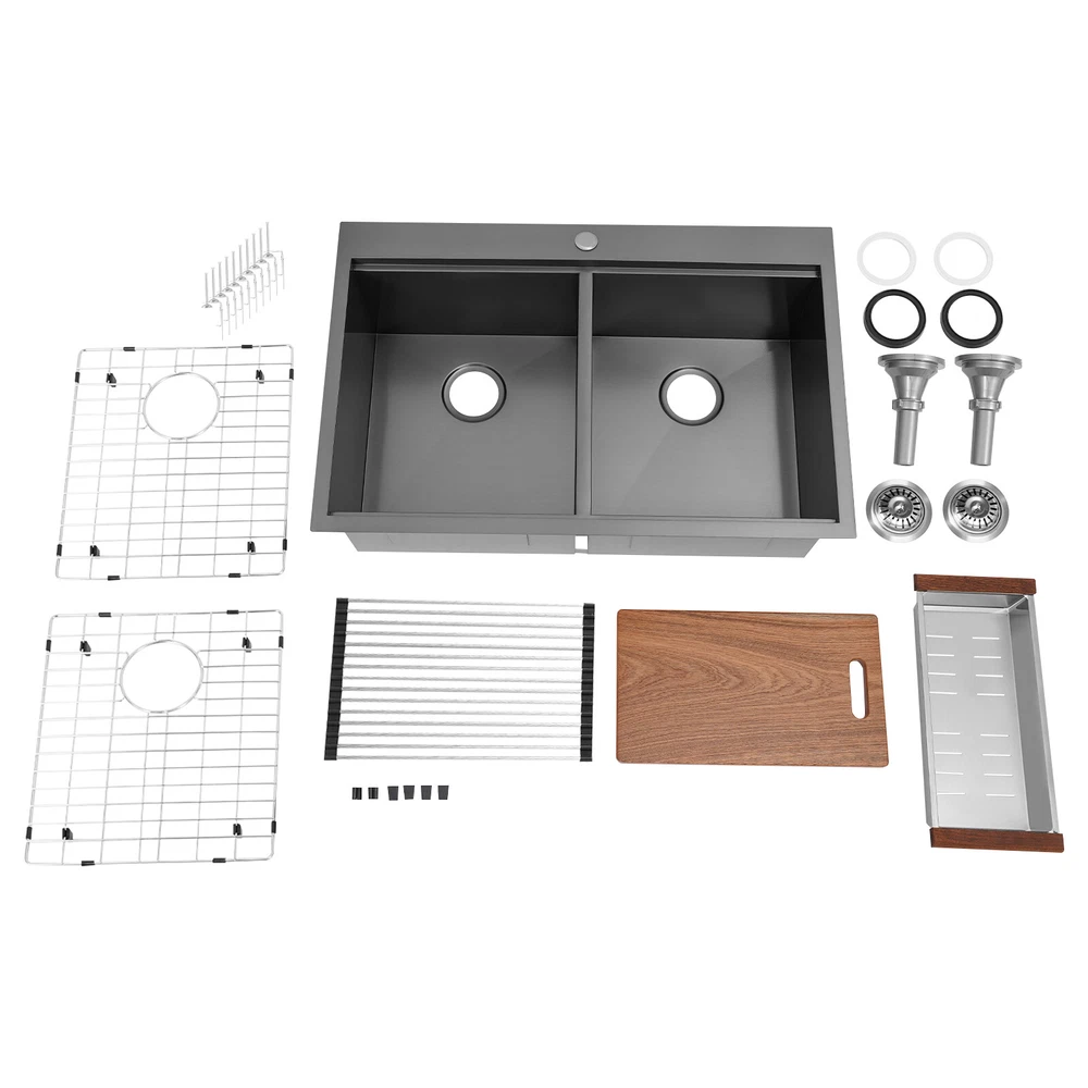 Specification Style: Modern Color: Grey Shape: Rectangular Material: 304 Stainless Steel, 201 Stainless Steel, Rubber Surface Treatment: Brushed and PVD Installation Type: Topmount, Flushmount Number of Bowls: 2 Gross Weight: 25kg/55.12lbs Net Weight: 23.75kg/52.36lbs Product Size: 83.8*55.88*22.86cm/33*22*9 in Each Bowl Size: 45.72*38.1*22.86cm/18*15*9in Package Size: 87*58*28cm/34.25*22.83*11.02in Package Included 1* Double-Bowl Kitchen Sink 1* Cutting Board 1* Roll-up Rack 1* Drain Basket 2* Bottom Grids Other Accessories for Assembly 33*22*9" Double-Bowl Kitchen Sink Stainless Steel Kitchen Sink w/Cutting Board Specification Style: Modern Color: Grey Shape: Rectangular Material: 304 Stainless Steel, 201 Stainless Steel, Rubber Surface Treatment: Brushed and PVD Installation Type: Topmount, Flushmount Number of Bowls: 2 Gross Weight: 25kg/55.12lbs Net Weight: 23.75kg/52.36lbs Product Size: 83.8*55.88*22.86cm/ 33*22*9 in Each Bowl Size: 45.72*38.1*22.86cm/18*15*9in Package Size: 87*58*28cm/34.25*22.83*11.02in Package Included 1* Double-Bowl Kitchen Sink 1* Cutting Board 1* Roll-up Rack 1* Drain Basket 2* Bottom Grids Other Accessories for Assembly Application This product can be widely used at homes, restaurants, bars, hotels, cafes, milk tea shops, school canteens, dessert shops, cafeterias, garages, clean rooms, and any other commercial places for manual cleaning of food, fruits, vegetables, dishes, etc. Description What if there is not enough space in the kitchen sink? What do you do if the sink is always clogged and can't be cleaned all the time? Then I suggest taking a look at our double-bowl kitchen sink with excellent material and easy cleaning features, which can easily solve the above problems and help you to create a more tidy kitchen. Key Features Last and Durable: Made of 304 stainless steel, and 201 stainless steel with brushed and PVD processes, it is rustproof , and can resist corrosion, impact, and deformation, so it can remain beautiful and practical for a long time. Thoughtful Design: The X-shaped water guiding line can guide water flow and form vortices to achieve rapid drainage. The anti-condensation coating effectively prevents excessive temperature differences and protects the cabinet from moisture. I t is equipped with sound insulating pads, which can effectively reduce the noise generated by the faucet water release and the collision of dishes, creating a quiet kitchen environment. Kitchen Assistant: Our product comes with a cutting board for easy vegetable cutting. In addition, the roll-up rack can help drain your dishes, the drain basket is beneficial for draining vegetables and fruits, and two bottom grids can effectively protect the sink base. Large Capacity: A large and deep (9-inch) sink with two bowls can hold a large amount of dishes, making you more comfortable and efficient when washing. It is a great helper for you to clean dishes or prepare food. Easy to Clean: The smooth surface, simple construction, and R0 round corner design that does not easily harbor dirt make the sink easy to rinse with clean water. Complete Accessories: It comes with a sink, a cutting board, a roll-up rack, a drain basket, two bottom grids, etc. to meet your various needs at once and also save you money. Quality Service: We stand behind all our guests and look forward to assisting you with your purchase. It is our pleasure to answer your confusion and questions. The end of the story between us is definitely not "we sell and you buy" Details Filter Basket: The filter basket intercepts food residue for easy handling and prevents your pipeline from clogging. Tier Track: It allows you to easily place and move the cutting board, roll-up rack, and drain basket, converting your sink to a workstation and providing you with more space. Notes Please check the size carefully before ordering. Please note that this product does not include a faucet. Please do not scratch its surface with sharp objects to obtain a longer service life. If you want to get a better installation effect, we suggest you ask professional workers to install it. Please allow the slight color difference caused by the shooting light and 1-3cm error due to manual measurement, and make sure you do not mind before ordering. Payment Delivery details Terms of sales About us Contact us Payment We accept ebay payment 。 Fees such as import duties, taxes are not included in the item price or shipping costs. These charges are the buyer's responsibility. Delivery details Shipping: 2-9 working days to: USA Terms of sales We maintain high standards of excellence and strive for hundred percent customer satisfaction. Feedback is very important to us. We hope that you contact us immediately before you give neutral or negative feedback, so that we can address your concerns. It is impossible to address issues if we do not know about them! About us Your satis faction is our ultimate goal. We work hard to earn your trust and future business. Our certified technicians have tested each item before shipping. The unit comes with 1 year limited warranty on all manufacturing defects. a) If you receive a defective item, you may return it or ask for a discount. Please contact us within 14 days after you receive the package. b) What you returned must be intact and in its original packaging as re? u. Customer is responsible for shipping costs of the returned item. c) We will cover the cost of shipping back t with the shipping rate indicated in the registration page. We will send you a new unit or refund the full payment you paid. Thank you. Contact us Business Hour Business Hour: Monday To Friday: 8:30 AM to 5:00 PM (Beijing China time) Due to time zones, our reply to your questions may not be immediately. But within above working time, we will reply your email within 24 hours. If it's non-workdays, please kindly be patient and wait till Monday. Please contact us with ebay message. Please feel free to contact us if you have any questions. Monday