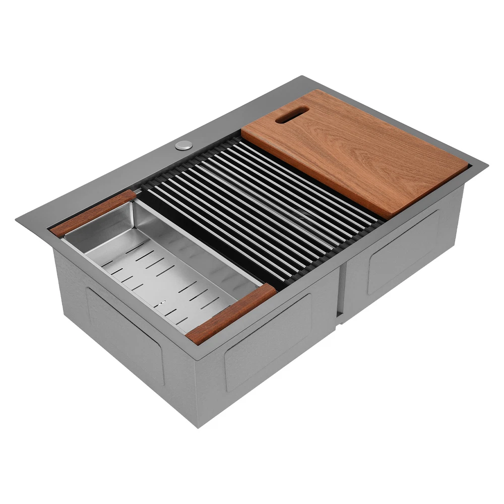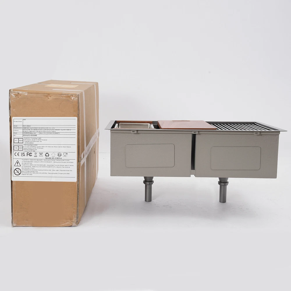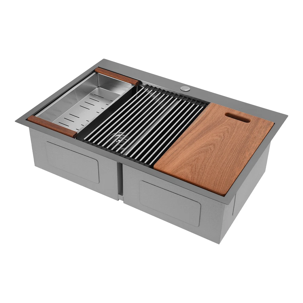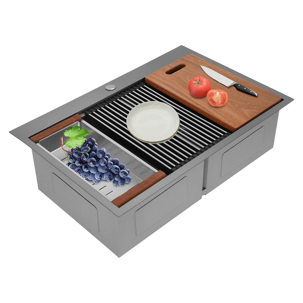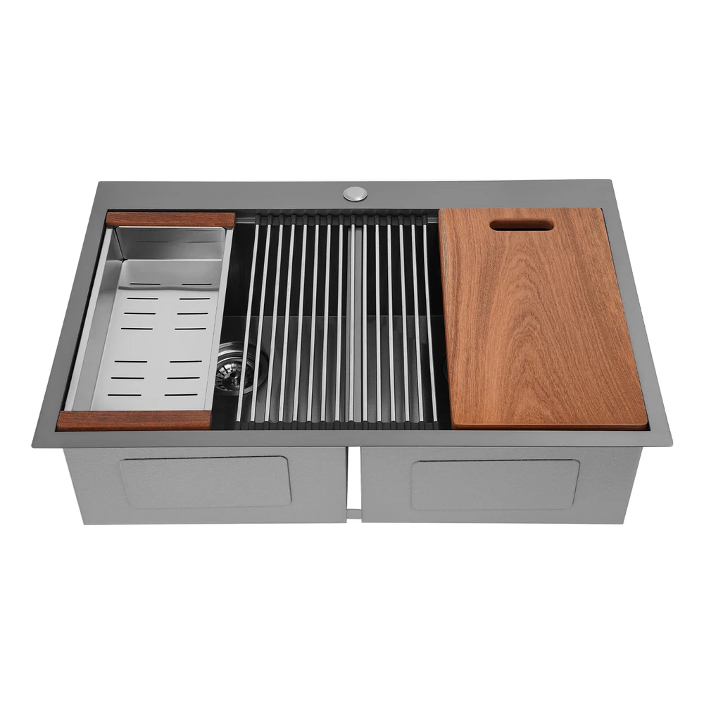 Specification Style: Modern Color: Grey Shape: Rectangular Material: 304 Stainless Steel, 201 Stainless Steel, Rubber Surface Treatment: Brushed and PVD Installation Type: Topmount, Flushmount Number of Bowls: 2 Gross Weight: 25kg/55.12lbs Net Weight: 23.75kg/52.36lbs Product Size: 83.8*55.88*22.86cm/33*22*9 in Each Bowl Size: 45.72*38.1*22.86cm/18*15*9in Package Size: 87*58*28cm/34.25*22.83*11.02in Package Included 1* Double-Bowl Kitchen Sink 1* Cutting Board 1* Roll-up Rack 1* Drain Basket 2* Bottom Grids Other Accessories for Assembly 33*22*9" Double-Bowl Kitchen Sink Stainless Steel Kitchen Sink w/Cutting Board Specification Style: Modern Color: Grey Shape: Rectangular Material: 304 Stainless Steel, 201 Stainless Steel, Rubber Surface Treatment: Brushed and PVD Installation Type: Topmount, Flushmount Number of Bowls: 2 Gross Weight: 25kg/55.12lbs Net Weight: 23.75kg/52.36lbs Product Size: 83.8*55.88*22.86cm/ 33*22*9 in Each Bowl Size: 45.72*38.1*22.86cm/18*15*9in Package Size: 87*58*28cm/34.25*22.83*11.02in Package Included 1* Double-Bowl Kitchen Sink 1* Cutting Board 1* Roll-up Rack 1* Drain Basket 2* Bottom Grids Other Accessories for Assembly Application This product can be widely used at homes, restaurants, bars, hotels, cafes, milk tea shops, school canteens, dessert shops, cafeterias, garages, clean rooms, and any other commercial places for manual cleaning of food, fruits, vegetables, dishes, etc. Description What if there is not enough space in the kitchen sink? What do you do if the sink is always clogged and can't be cleaned all the time? Then I suggest taking a look at our double-bowl kitchen sink with excellent material and easy cleaning features, which can easily solve the above problems and help you to create a more tidy kitchen. Key Features Last and Durable: Made of 304 stainless steel, and 201 stainless steel with brushed and PVD processes, it is rustproof , and can resist corrosion, impact, and deformation, so it can remain beautiful and practical for a long time. Thoughtful Design: The X-shaped water guiding line can guide water flow and form vortices to achieve rapid drainage. The anti-condensation coating effectively prevents excessive temperature differences and protects the cabinet from moisture. I t is equipped with sound insulating pads, which can effectively reduce the noise generated by the faucet water release and the collision of dishes, creating a quiet kitchen environment. Kitchen Assistant: Our product comes with a cutting board for easy vegetable cutting. In addition, the roll-up rack can help drain your dishes, the drain basket is beneficial for draining vegetables and fruits, and two bottom grids can effectively protect the sink base. Large Capacity: A large and deep (9-inch) sink with two bowls can hold a large amount of dishes, making you more comfortable and efficient when washing. It is a great helper for you to clean dishes or prepare food. Easy to Clean: The smooth surface, simple construction, and R0 round corner design that does not easily harbor dirt make the sink easy to rinse with clean water. Complete Accessories: It comes with a sink, a cutting board, a roll-up rack, a drain basket, two bottom grids, etc. to meet your various needs at once and also save you money. Quality Service: We stand behind all our guests and look forward to assisting you with your purchase. It is our pleasure to answer your confusion and questions. The end of the story between us is definitely not "we sell and you buy" Details Filter Basket: The filter basket intercepts food residue for easy handling and prevents your pipeline from clogging. Tier Track: It allows you to easily place and move the cutting board, roll-up rack, and drain basket, converting your sink to a workstation and providing you with more space. Notes Please check the size carefully before ordering. Please note that this product does not include a faucet. Please do not scratch its surface with sharp objects to obtain a longer service life. If you want to get a better installation effect, we suggest you ask professional workers to install it. Please allow the slight color difference caused by the shooting light and 1-3cm error due to manual measurement, and make sure you do not mind before ordering. Payment Delivery details Terms of sales About us Contact us Payment We accept ebay payment 。 Fees such as import duties, taxes are not included in the item price or shipping costs. These charges are the buyer's responsibility. Delivery details Shipping: 2-9 working days to: USA Terms of sales We maintain high standards of excellence and strive for hundred percent customer satisfaction. Feedback is very important to us. We hope that you contact us immediately before you give neutral or negative feedback, so that we can address your concerns. It is impossible to address issues if we do not know about them! About us Your satis faction is our ultimate goal. We work hard to earn your trust and future business. Our certified technicians have tested each item before shipping. The unit comes with 1 year limited warranty on all manufacturing defects. a) If you receive a defective item, you may return it or ask for a discount. Please contact us within 14 days after you receive the package. b) What you returned must be intact and in its original packaging as re? u. Customer is responsible for shipping costs of the returned item. c) We will cover the cost of shipping back t with the shipping rate indicated in the registration page. We will send you a new unit or refund the full payment you paid. Thank you. Contact us Business Hour Business Hour: Monday To Friday: 8:30 AM to 5:00 PM (Beijing China time) Due to time zones, our reply to your questions may not be immediately. But within above working time, we will reply your email within 24 hours. If it's non-workdays, please kindly be patient and wait till Monday. Please contact us with ebay message. Please feel free to contact us if you have any questions. Monday