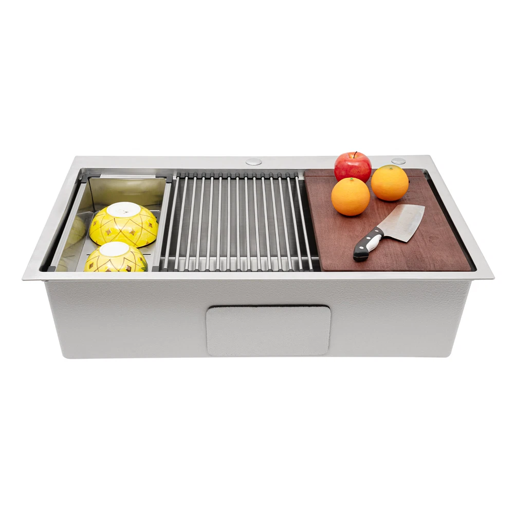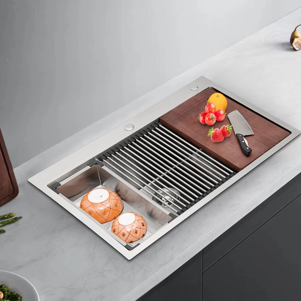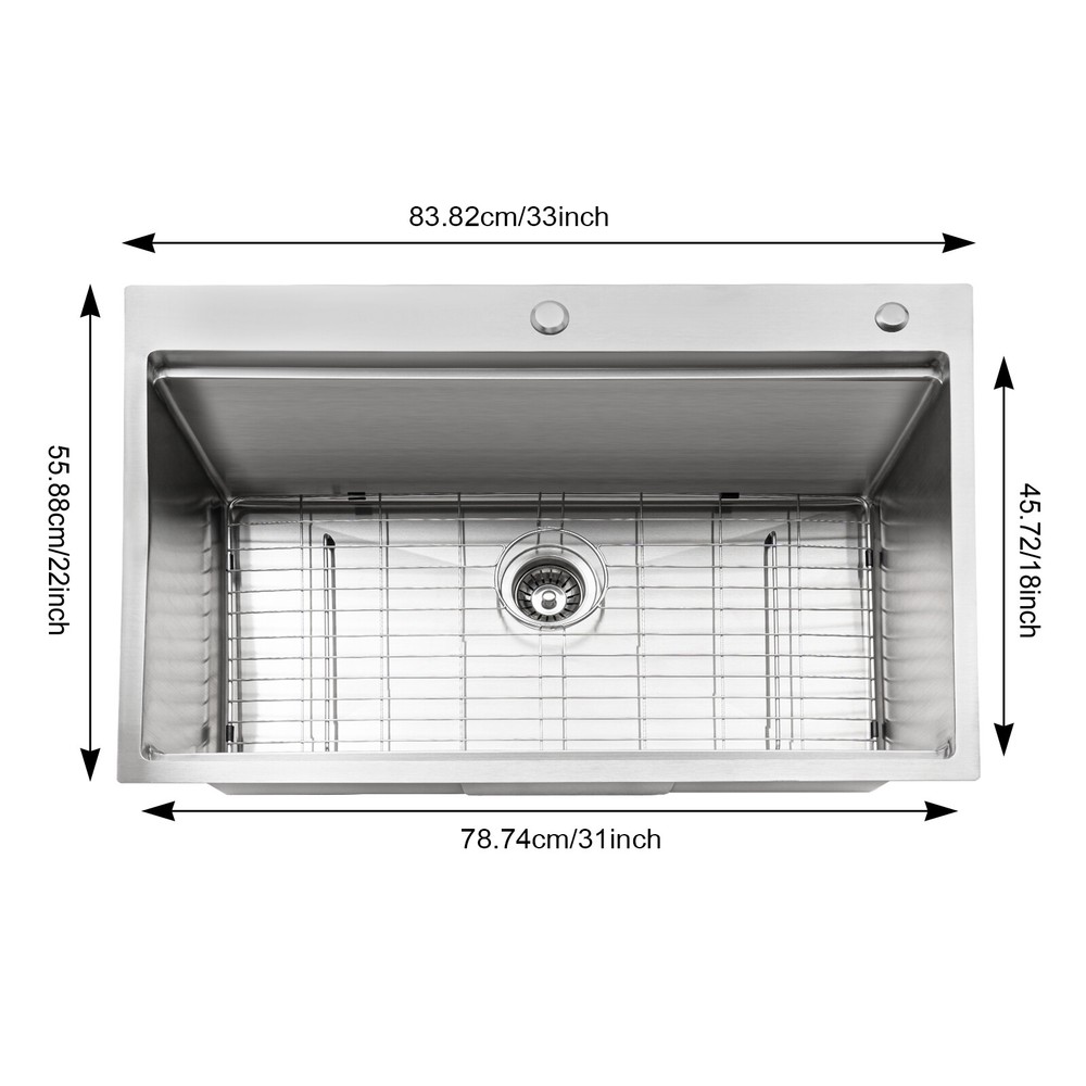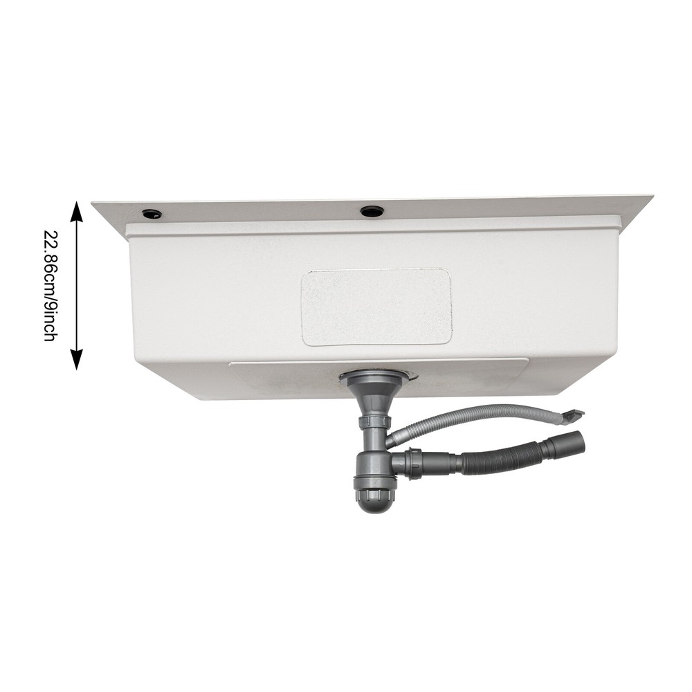 Specification Material: 304 Stainless Steel, 201 Stainless Steel, Rubber, Wood Process: Wire Drawing Color: Silver Style: Modern Shape: Rectangular Assembly Required: Yes Panel Thickness: 3mm/ 0.12in Exterior Size: 83.82*55.88 cm/ 33*22in Internal Size: 78.74*45.72 cm/ 31*18in Depth: 22.86cm/ 9in Drain Pipe Length: 75cm/ 29.53in Overflow Pipe Length: 45cm/ 17.72in Downspout Diameter: 110mm/ 4.33in Pre-drilled Hole Diameter: 30mm/ 1.18in, 28mm/ 1.1in Gross Weight: 14.5kg/ 31.97 lbs Package Size: 87.3*59.3*26.5 cm/ 34.37*23.35*10.43in Package Included 1* 304 Stainless Steel Sink 1* Cutting Board 1* Colander 1* Bottom Grid 1* Roll-Up Dish Drying Rack 1* Strainer 1* Drain Pipe 1* Overflow Pipe All Accessories for Installation 33" Drop-in Single Bowl Kitchen Sink Top Mount 304 Stainless Steel Silver Description This 304 stainless steel sink adopts a wire drawing process, with exquisite workmanship, which is wear-resistant and corrosion-resistant. Its enlarged and deepened sink not only alleviates splashing problems but also increases space utilization for washing large quantities of cookware. It can not only be used as a traditional sink but also can hold a cutting board for chopping vegetables and meat. With it, you can enjoy a more convenient and healthier life. Specification Material: 304 Stainless Steel, 201 Stainless Steel, Rubber, Wood Process: Wire Drawing Color: Silver Style: Modern Shape: Rectangular Assembly Required: Yes Panel Thickness: 3mm/ 0.12in Exterior Size: 83.82*55.88 cm/ 33*22in Internal Size: 78.74*45.72 cm/ 31*18in Depth: 22.86cm/ 9in Drain Pipe Length: 75cm/ 29.53in Overflow Pipe Length: 45cm/ 17.72in Downspout Diameter: 110mm/ 4.33in Pre-drilled Hole Diameter: 30mm/ 1.18in, 28mm/ 1.1in Gross Weight: 14.5kg/ 31.97 lbs Package Size: 87.3*59.3*26.5 cm/ 34.37*23.35*10.43in Package Included 1* 304 Stainless Steel Sink 1* Cutting Board 1* Colander 1* Bottom Grid 1* Roll-Up Dish Drying Rack 1* Strainer 1* Drain Pipe 1* Overflow Pipe All Accessories for Installation Key Features Build to Last: The premium 304 stainless steel and 201 stainless steel, as well as the exquisite wire drawing process, make this product bright, wear-resistant, heat-resistant, corrosion-resistant, and not easy to rust and deform, ensuring a long service life. Large Sink Size: It is large (31*18*9 inches) and can accommodate a large number of plates, dishes, and pots at once. Moreover, it prevents splashing when washing fruits and vegetables. Humanized Design: The anti-condensation coating prevents condensation in the sink and thus prevents moisture in the kitchen cabinets. The rubber soundproof mats on the surrounds and bottom reduce noise. Additionally, the rear drain design effectively increases the utilization of cabinet space underneath the sink. Multi-functional: Designed with steps at the front and back, this sink converts into a work platform where you can place a cutting board, roll holder, and colander to save space and increase efficiency. Quick Drainage: It has a sloping bottom and an X-shaped water guide for good drainage, effectively preventing water from accumulating inside. In addition, the 4.33-inch large-diameter downspout allows water to drain quickly and efficiently. Easy Installation: The simple structure and complete set of mounting accessories allow for fast and accurate installation. In addition, different mounting methods can meet your different needs. Easy to Clean: The smooth surface and round corner allow you to easily clean it without leaving dead corners of dirt accumulation. Details Double Pre-drilled Holes: You can install a faucet(not included) on one hole and a soap dispenser(not included) or water purifier faucet on the other as needed to make cleaning easier. Thickened Panel: The 3mm thickened panel can provide better support and load-bearing force for the sink. Useful Strainer: The rounded center carry handle helps to easily lift the sink strainer basket for quick draining, making cleaning easier. Drain Pipe: It can be bent freely to suit the installation position, reducing restrictions on use. Arcs Shape: The rounded and smooth edges not only add to the aesthetics of the product but also improve the safety of use. Application This product can be widely used in homes, restaurants, laundry rooms, basements, bars, kitchens, food trucks, dessert shops, coffee shops, hotels, garages, gardens, pet shops, etc. for cleaning tableware, vegetables, fruits, pets, etc. Notes Please allow the slight color difference caused by the shooting light and the 1-3 cm error due to manual measurement, and make sure you do not mind before ordering. Payment Delivery details Terms of sales About us Contact us Payment We accept ebay payment 。 Fees such as import duties, taxes are not included in the item price or shipping costs. These charges are the buyer's responsibility. Delivery details Shipping: 2-9 working days to: USA Terms of sales We maintain high standards of excellence and strive for hundred percent customer satisfaction. Feedback is very important to us. We hope that you contact us immediately before you give neutral or negative feedback, so that we can address your concerns. It is impossible to address issues if we do not know about them! About us Your satis faction is our ultimate goal. We work hard to earn your trust and future business. Our certified technicians have tested each item before shipping. The unit comes with 1 year limited warranty on all manufacturing defects. a) If you receive a defective item, you may return it or ask for a discount. Please contact us within 14 days after you receive the package. b) What you returned must be intact and in its original packaging as re? u. Customer is responsible for shipping costs of the returned item. c) We will cover the cost of shipping back t with the shipping rate indicated in the registration page. We will send you a new unit or refund the full payment you paid. Thank you. Contact us Business Hour Business Hour: Monday T