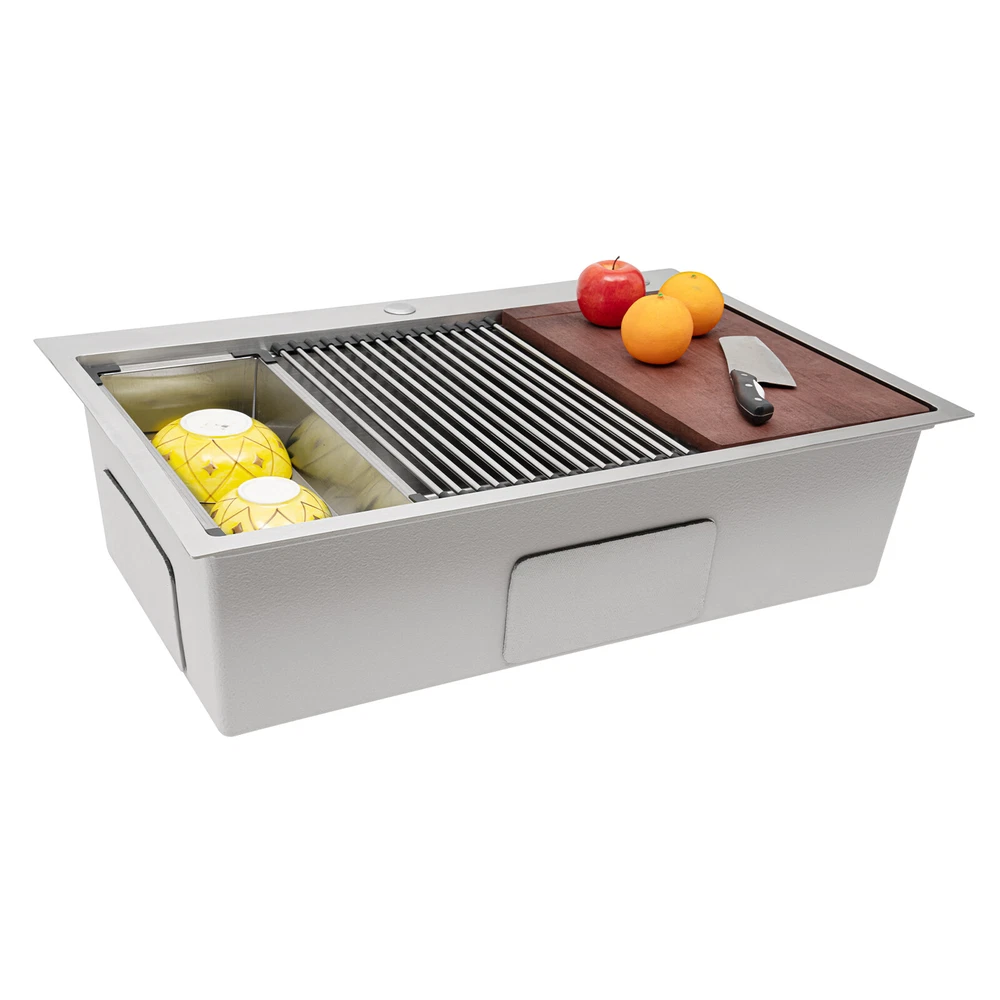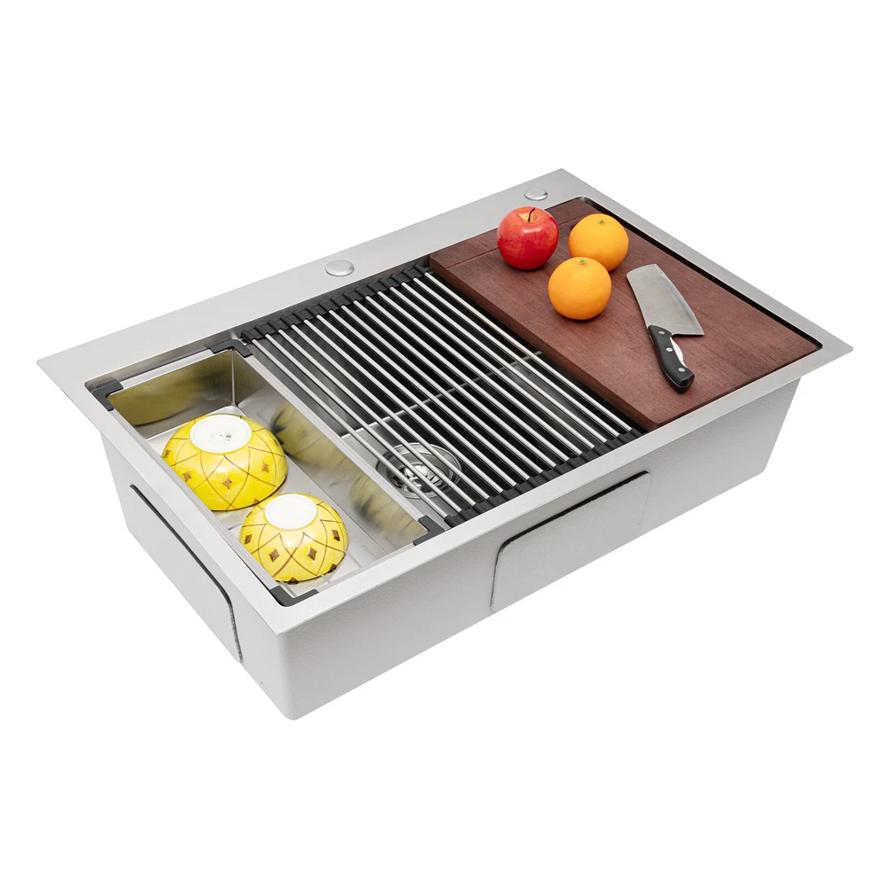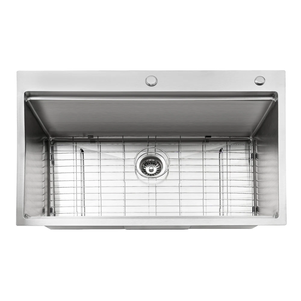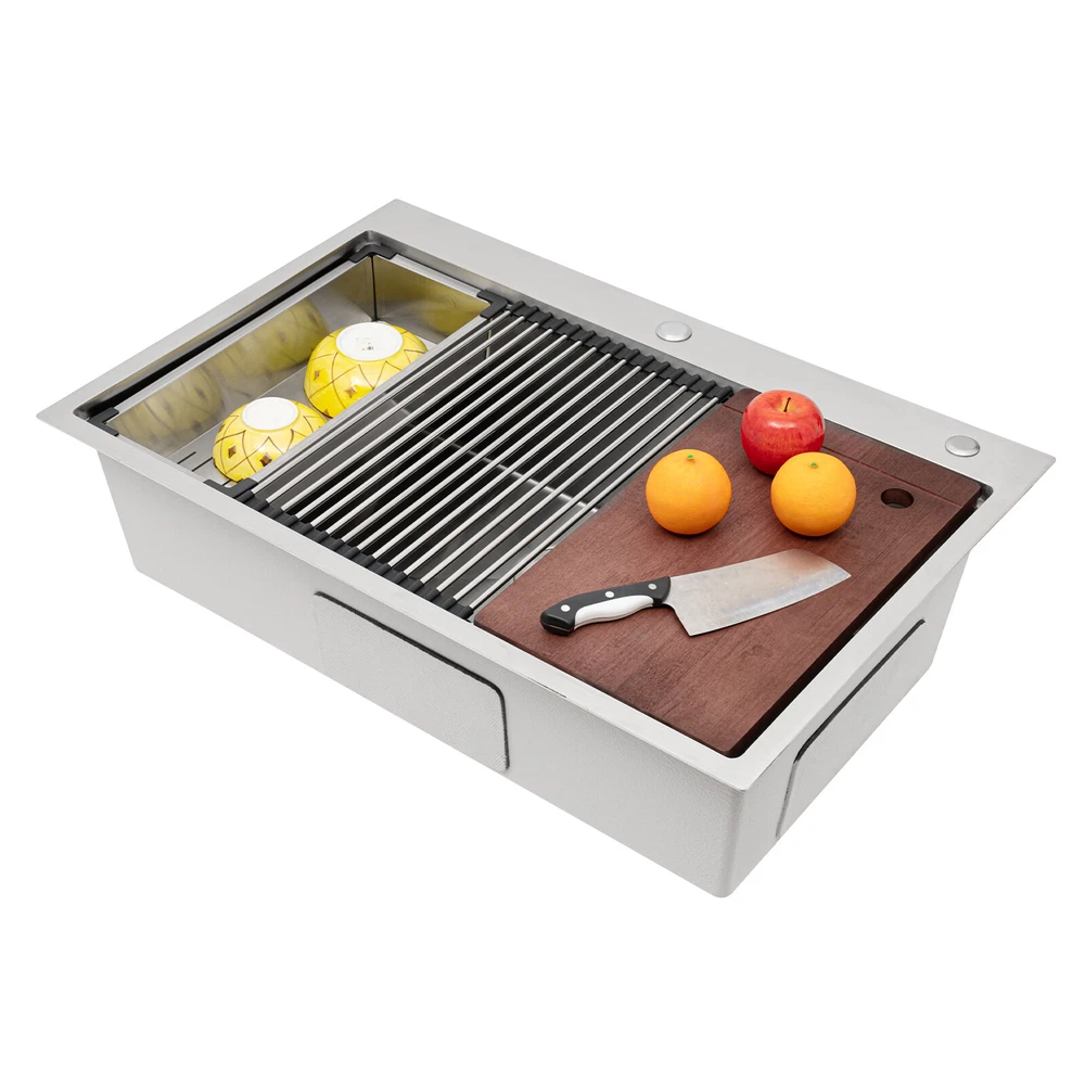 Specification Material: 304 Stainless Steel, 201 Stainless Steel, Rubber, Wood Process: Wire Drawing Color: Silver Style: Modern Shape: Rectangular Assembly Required: Yes Panel Thickness: 3mm/ 0.12in Exterior Size: 83.82*55.88 cm/ 33*22in Internal Size: 78.74*45.72 cm/ 31*18in Depth: 22.86cm/ 9in Drain Pipe Length: 75cm/ 29.53in Overflow Pipe Length: 45cm/ 17.72in Downspout Diameter: 110mm/ 4.33in Pre-drilled Hole Diameter: 30mm/ 1.18in, 28mm/ 1.1in Gross Weight: 14.5kg/ 31.97 lbs Package Size: 87.3*59.3*26.5 cm/ 34.37*23.35*10.43in Package Included 1* 304 Stainless Steel Sink 1* Cutting Board 1* Colander 1* Bottom Grid 1* Roll-Up Dish Drying Rack 1* Strainer 1* Drain Pipe 1* Overflow Pipe All Accessories for Installation 33" Drop-in Single Bowl Kitchen Sink Top Mount 304 Stainless Steel Silver Description This 304 stainless steel sink adopts a wire drawing process, with exquisite workmanship, which is wear-resistant and corrosion-resistant. Its enlarged and deepened sink not only alleviates splashing problems but also increases space utilization for washing large quantities of cookware. It can not only be used as a traditional sink but also can hold a cutting board for chopping vegetables and meat. With it, you can enjoy a more convenient and healthier life. Specification Material: 304 Stainless Steel, 201 Stainless Steel, Rubber, Wood Process: Wire Drawing Color: Silver Style: Modern Shape: Rectangular Assembly Required: Yes Panel Thickness: 3mm/ 0.12in Exterior Size: 83.82*55.88 cm/ 33*22in Internal Size: 78.74*45.72 cm/ 31*18in Depth: 22.86cm/ 9in Drain Pipe Length: 75cm/ 29.53in Overflow Pipe Length: 45cm/ 17.72in Downspout Diameter: 110mm/ 4.33in Pre-drilled Hole Diameter: 30mm/ 1.18in, 28mm/ 1.1in Gross Weight: 14.5kg/ 31.97 lbs Package Size: 87.3*59.3*26.5 cm/ 34.37*23.35*10.43in Package Included 1* 304 Stainless Steel Sink 1* Cutting Board 1* Colander 1* Bottom Grid 1* Roll-Up Dish Drying Rack 1* Strainer 1* Drain Pipe 1* Overflow Pipe All Accessories for Installation Key Features Build to Last: The premium 304 stainless steel and 201 stainless steel, as well as the exquisite wire drawing process, make this product bright, wear-resistant, heat-resistant, corrosion-resistant, and not easy to rust and deform, ensuring a long service life. Large Sink Size: It is large (31*18*9 inches) and can accommodate a large number of plates, dishes, and pots at once. Moreover, it prevents splashing when washing fruits and vegetables. Humanized Design: The anti-condensation coating prevents condensation in the sink and thus prevents moisture in the kitchen cabinets. The rubber soundproof mats on the surrounds and bottom reduce noise. Additionally, the rear drain design effectively increases the utilization of cabinet space underneath the sink. Multi-functional: Designed with steps at the front and back, this sink converts into a work platform where you can place a cutting board, roll holder, and colander to save space and increase efficiency. Quick Drainage: It has a sloping bottom and an X-shaped water guide for good drainage, effectively preventing water from accumulating inside. In addition, the 4.33-inch large-diameter downspout allows water to drain quickly and efficiently. Easy Installation: The simple structure and complete set of mounting accessories allow for fast and accurate installation. In addition, different mounting methods can meet your different needs. Easy to Clean: The smooth surface and round corner allow you to easily clean it without leaving dead corners of dirt accumulation. Details Double Pre-drilled Holes: You can install a faucet(not included) on one hole and a soap dispenser(not included) or water purifier faucet on the other as needed to make cleaning easier. Thickened Panel: The 3mm thickened panel can provide better support and load-bearing force for the sink. Useful Strainer: The rounded center carry handle helps to easily lift the sink strainer basket for quick draining, making cleaning easier. Drain Pipe: It can be bent freely to suit the installation position, reducing restrictions on use. Arcs Shape: The rounded and smooth edges not only add to the aesthetics of the product but also improve the safety of use. Application This product can be widely used in homes, restaurants, laundry rooms, basements, bars, kitchens, food trucks, dessert shops, coffee shops, hotels, garages, gardens, pet shops, etc. for cleaning tableware, vegetables, fruits, pets, etc. Notes Please allow the slight color difference caused by the shooting light and the 1-3 cm error due to manual measurement, and make sure you do not mind before ordering. Payment Delivery details Terms of sales About us Contact us Payment We accept ebay payment 。 Fees such as import duties, taxes are not included in the item price or shipping costs. These charges are the buyer's responsibility. Delivery details Shipping: 2-9 working days to: USA Terms of sales We maintain high standards of excellence and strive for hundred percent customer satisfaction. Feedback is very important to us. We hope that you contact us immediately before you give neutral or negative feedback, so that we can address your concerns. It is impossible to address issues if we do not know about them! About us Your satis faction is our ultimate goal. We work hard to earn your trust and future business. Our certified technicians have tested each item before shipping. The unit comes with 1 year limited warranty on all manufacturing defects. a) If you receive a defective item, you may return it or ask for a discount. Please contact us within 14 days after you receive the package. b) What you returned must be intact and in its original packaging as re? u. Customer is responsible for shipping costs of the returned item. c) We will cover the cost of shipping back t with the shipping rate indicated in the registration page. We will send you a new unit or refund the full payment you paid. Thank you. Contact us Business Hour Business Hour: Monday T