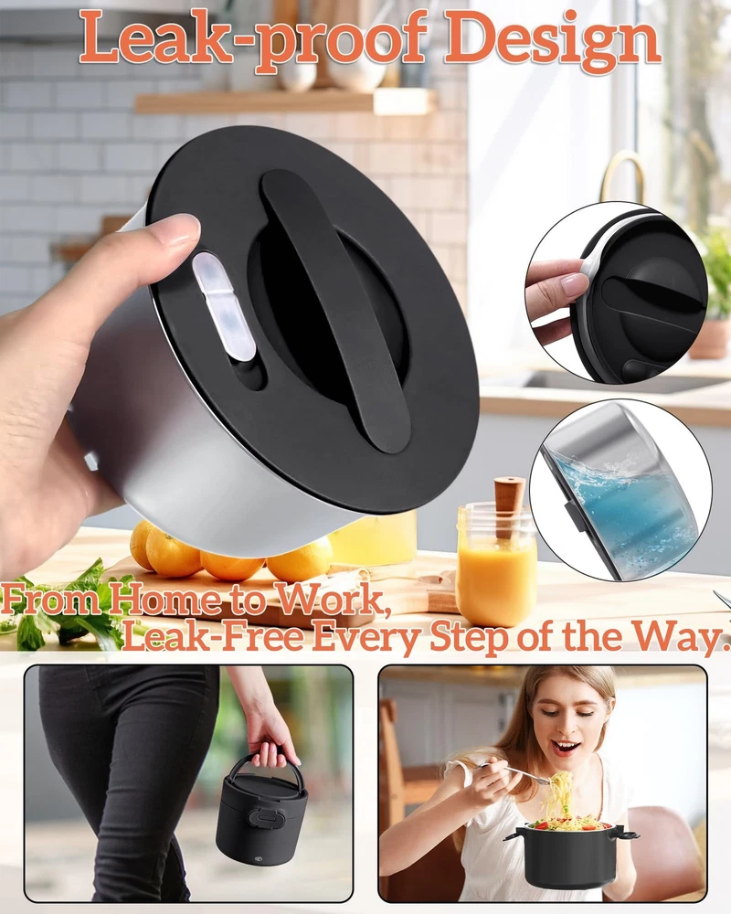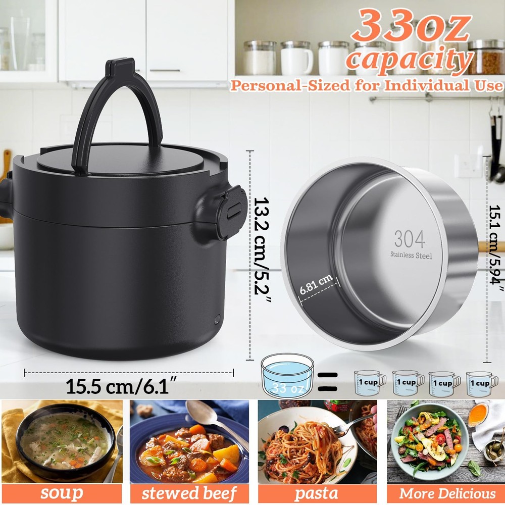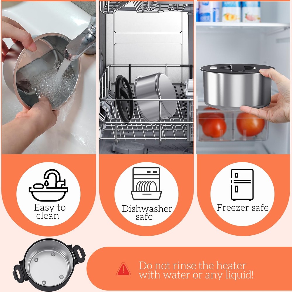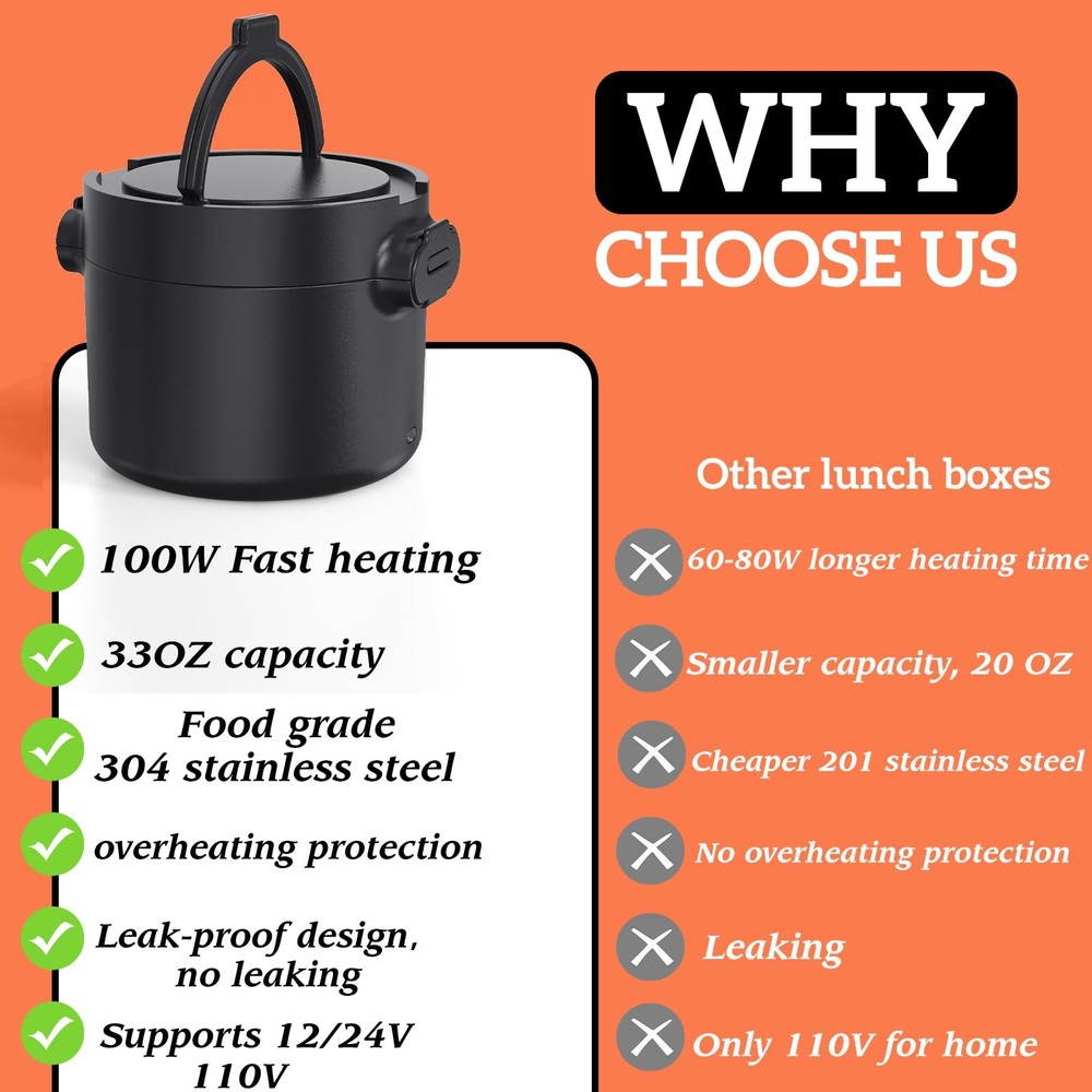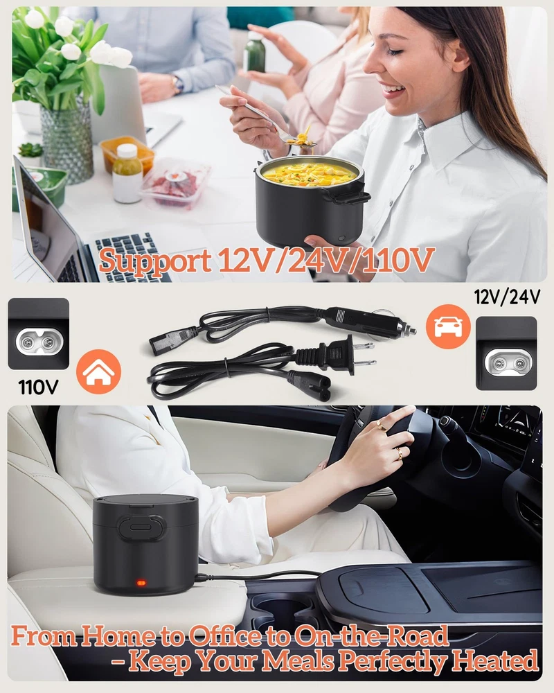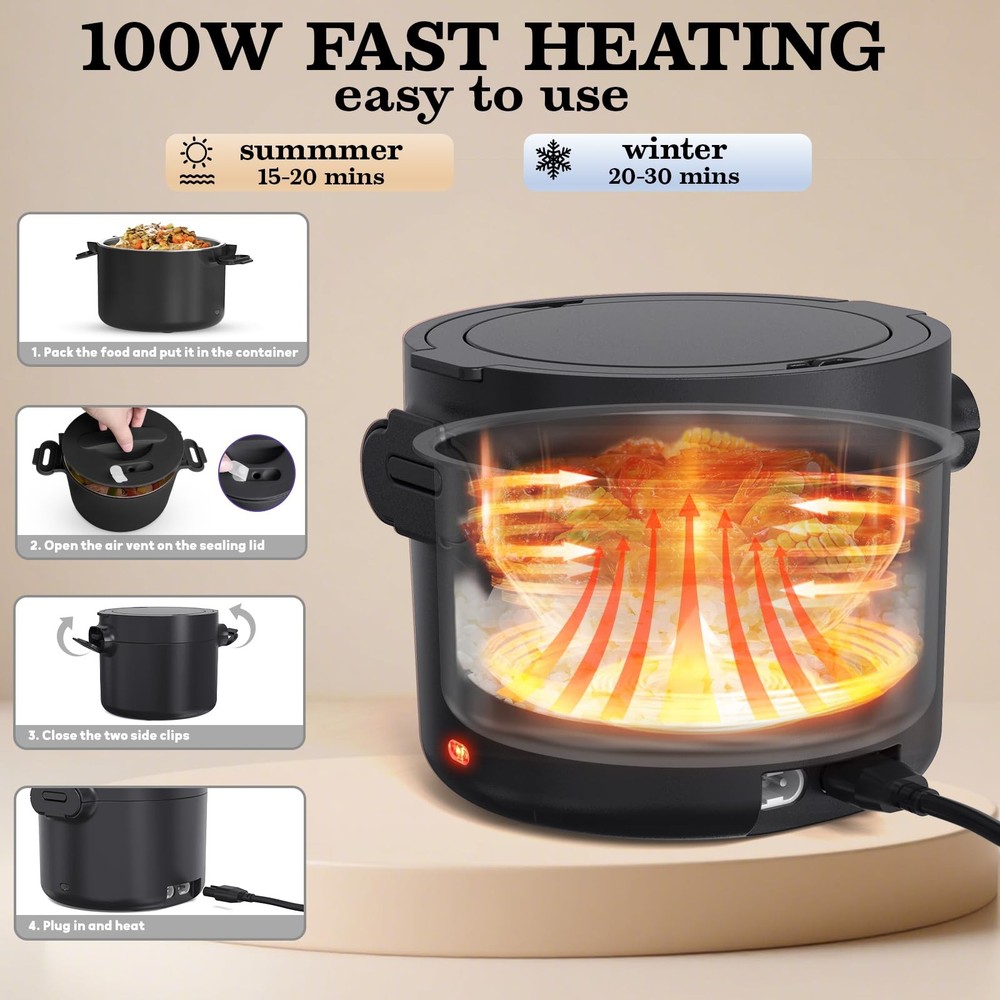 Discover the Electric Lunch box, your versatile solution for enjoying hot meals on the go or at work. With a power rating of 80-100W, it efficiently heats food to perfection in under 30 minutes. Conveniently cook or heat your meals at work without the hassle of waiting for the microwave. functioning seamlessly as both a continuous heating portable food warmer and a rice cooker that prepares rice in 30-45 minutes. a great portable microwave and slow cooker. The portable work lunch warmer includes both 12/24V and 110V power cords, allowing you to use it in your car, truck, office, or home. Say goodbye to lunchtime dilemmas - easily prepare fresh meals and avoid leftovers. with a stainless steel container. capacity that fits perfectly in your freezer. Whether you pack pre-made dishes or reheat leftovers from the day before, seal them in a leak-proof stainless steel container to keep them fresh and flavorful. Designed for convenience and durability, the easy-to-clean stainless steel container and leak-proof design make it perfect for carrying your homemade meals with ease. Ideal for maintaining a healthy diet on the go or at work, it's a thoughtful cooking gift for woman who appreciates delicious, hot meals. 100W Rapid Heating - Experience rapid, even heating with our electric lunch box. Say goodbye to cold leftovers! This powerful heated lunch box utilizes advanced PTC technology, warming meals thoroughly in about 30 minutes while retaining freshness. Simply plug in the lunch box 20 - 30 minutes before mealtime, and you're all set for a delicious, warm meal. Generous 33oz Capacity - Our heating lunch box comes with a removable 304 stainless steel container that offers a spacious 33oz capacity. The removable 304 stainless steel container safely holds soups, stews, or leftovers. The heated lunch box is designed with safety and durability in mind. The silicone-sealed lid makes it leak-resistant, so you can carry it around worry-free, whether you're commuting to work 3-in-1 Electric Lunch Box - Maximize convenience with this 3-in-1 electric lunch box. It supports 110V (home/office) and 12V/24V (car/truck) power sources. Whether at your desk, on the road, or in a truck cab, this lunch warmer portable for work lets you savor homemade meals anywhere. This ultimate portable food warmer adapts to your lifestyle Easy to Clean - The detachable stainless steel container of this heated lunch box is dishwasher-safe, saving you time and effort. Maintaining your electric lunch box food heater is hassle-free, fitting seamlessly into your busy routine. Enjoy the convenience of a spotless lunch box after every use Warm Gift Choice - The perfect warm gift! This electric lunch box for adults is a thoughtful present for men, women, office workers, or truck drivers. Ideal for birthdays, Mother’s/Father’s Day, Thanksgiving, Christmas, New Year, or White Elephant gifts. this lunch box makes for a heartwarming gesture,We believe our heating lunch box is a worthy addition to anyone's life, Give the practical heating lunch box and enhance daily life for your loved ones