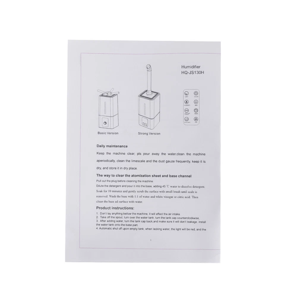 Specification Model: Hq-js130h Color: White Material: Abs Plug: Us Standard Voltage: 100-240v Power: 90w Frequency: 50hz Noise: ≤46db Preset Time Range: Within 12h Timing Range: Within 24h Power Source: Corded Electric Control Method: Remote, Touch Applicable Space Range: 50-80 ㎡/ 538-861ft² Water Tank Capacity: 13l/ 3.4gal Spray Volume: 1500ml/H Product Size: 26*26*56cm/ 10.23*10.23*22.04in Package Size: 31*31*55cm/ 12.2*12.2*21.65in Net Weight: 3.47kg/ 7.65lbs Gross Weight: 4kg/ 8.82lbs Package Included 1* Humidifier 1* Remote Control 1* English Instruction 4* Tubes All Needed Accessories 3.4 Gallon Commercial Large Humidifiers Style Industrial Humidifier Whole-House Industrial Humidifier Commercial Humidifier 1500ml/h 861sq.ft Large Home Humidifier Whole House Humidifier 3.4Gallons for Living Room Bedroom Office 100-240V Description Dry Air Will Make Your Skin Tight, Your Throat Uncomfortable, and Your Space Is Full of Static Electricity. Let This Intelligent Commercial Humidifier Help You Get Rid of These Troubles and Bring You a More Comfortable and Healthy Living Atmosphere! Key Features Enjoy the Air like Nature: It Adopts a Three-core Atomizer, Which Has a Powerful Atomization Effect and Can Quickly Drive Away Dryness for You! with It, You Can Enjoy the Fresh Air like a Forest, to Chase Away Your Fatigue and Soothe Your Body and Mind! Multifunctional Humidifier: This Commercial Humidifier Has the Function of Purifying and Humidifying the Air with Negative Ions, Bringing You More Suitable Air Humidity and Purifying the Air to Take Care of Your Health. Commercial & Household Humidifier: It Can Moisturize Vegetables and Fruits in Supermarkets and Stores, Reduce the Tedium of the Air in the Office, or Create a Comfortable Atmosphere for You at Home. Omnidirectional Humidification: This Commercial Humidifier’s Spray Volume Can Reach 1500ml/H and Is Equipped with Four Tubes and a Powerful Turbofan. Once Installed, It Can Realize Multi-angle Spray, and Achieve a Rapid and Uniform Humidification Effect Without Wetting the Floor. and It Has Three Levels of Spray Volume so That You Can Adjust It As Needed. Humidification Reservation: This Commercial Humidifier Has the Function of Preset Working Hours (Within 12 Hours). in This Way, You Can Make an Appointment for Humidification One Hour Before Going off Work. When You Get Home, You Can Enjoy a Fully Moisturized Room, Relax and Be Comfortable. User-friendly: with a Noise-reducing Turbofan, the Humidifier Works with a Noise Level of less than 46db, and the Display Will Turn off in Sleep Mode, so It Will Not Disturb Your Relaxation, Study, Work, and Sleep, Allowing You to Enjoy a Pleasant and Comfortable Atmosphere. Large Water Tank: Its Water Tank Volume Is 13l/3.4gal, Which Can Provide You with Sufficient Humidification and Also Help You Get Rid of the Trouble of Frequent Water Addition. Intelligent Constant Humidity: It Has a Built-in Smart Chip That Can Quickly Detect Environmental Humidity. the Scientific Constant Temperature Keeps the Environmental Humidity Within the Range of 45% - 95%, Bringing You a More Comfortable Environment. High Safety: It Is Designed with a Water Shortage Protection Function. When the Water in the Water Tank Is Insufficient, It Will Automatically Stop Operation to Avoid Unnecessary Trouble Caused by the Dry Burning of the Machine and Protect Your Use Safety. Convenient Operation: You Can Control the Gear, Mode, and Timing Through the Touch Screen or Remote Control to Provide Convenience for You. and Its Water-adding Method Is to Add Water from Above Without Shutting down the Machine. Easy to Clean: the Machine's Smooth Surface and Waterproof Characteristics Make It Easy for You to Clean. All You Need to Do Is Rinse with Water and Wipe Dry. Good Material: It Is Made of High-quality Abs Material, Durable and Non-toxic, and Non-hazardous, so You Can Use It with Confidence for a Long Time. Customer Service: We Aim to Provide Quality Products and Services. If You Have Any Problems, Please Feel Free to Contact Us. We Will Reply and Solve the Problem for You As Soon As Possible. Details Air Inlet: There Is an Air Inlet on the Back of the Product, Which Can Blow up the Ultrasonic Fog to Provide You with a Better Atomization Effect. Visual Water Level: Its Visual Water Level Design Allows You to Easily Observe the Water Surplus in the Tank so That You Can Add Water in Time. Cleaning Brush: We Have a Cleaning Brush for You, Which Is More Convenient for You to Clean the Product. Activated Carbon Filter Screen: It Is Also Equipped with an Activated Carbon Filter Screen to Filter the Fiber and Dust in the Air, to Achieve the Effect of Purifying the Air. Application It Can Be 50-80 ㎡/538-861 Ft ² Air Humidification Is Carried out in the Space of. It Can Be Used in Fruit and Vegetable Supermarkets, Flower Shops, Fruit and Vegetable Greenhouses, Factories, Warehouses, Meeting Rooms, Living Rooms, Etc Specification Model: Hq-js130h Color: White Material: Abs Plug: Us Standard Voltage: 100-240v Power: 90w Frequency: 50hz Noise: ≤46db Preset Time Range: Within 12h Timing Range: Within 24h Power Source: Corded Electric Control Method: Remote, Touch Applicable Space Range: 50-80 ㎡/ 538-861ft² Water Tank Capacity: 13l/ 3.4gal Spray Volume: 1500ml/H Product Size: 26*26*56cm/ 10.23*10.23*22.04in Package Size: 31*31*55cm/ 12.2*12.2*21.65in Net Weight: 3.47kg/ 7.65lbs Gross Weight: 4kg/ 8.82lbs Package Included 1* Humidifier 1* Remote Control 1* English Instruction 4* Tubes All Needed Accessories Notes Please Empty the Water Tank If You Won’t Use This Product for a Long Time. Please Place It on the Ground or on the Table for a Better User Experience. Please Do Not Use This Product If You Are Unwell, Suffer from Heart Disease, High Blood Pressure, Asthma, or Skin Sensitivities, or If You Are Drunk, Pregnant, Have a Baby, or Are with Pets. Please Note That the Disinfection Time Should Be Limited to 30 Seconds or less. Ple