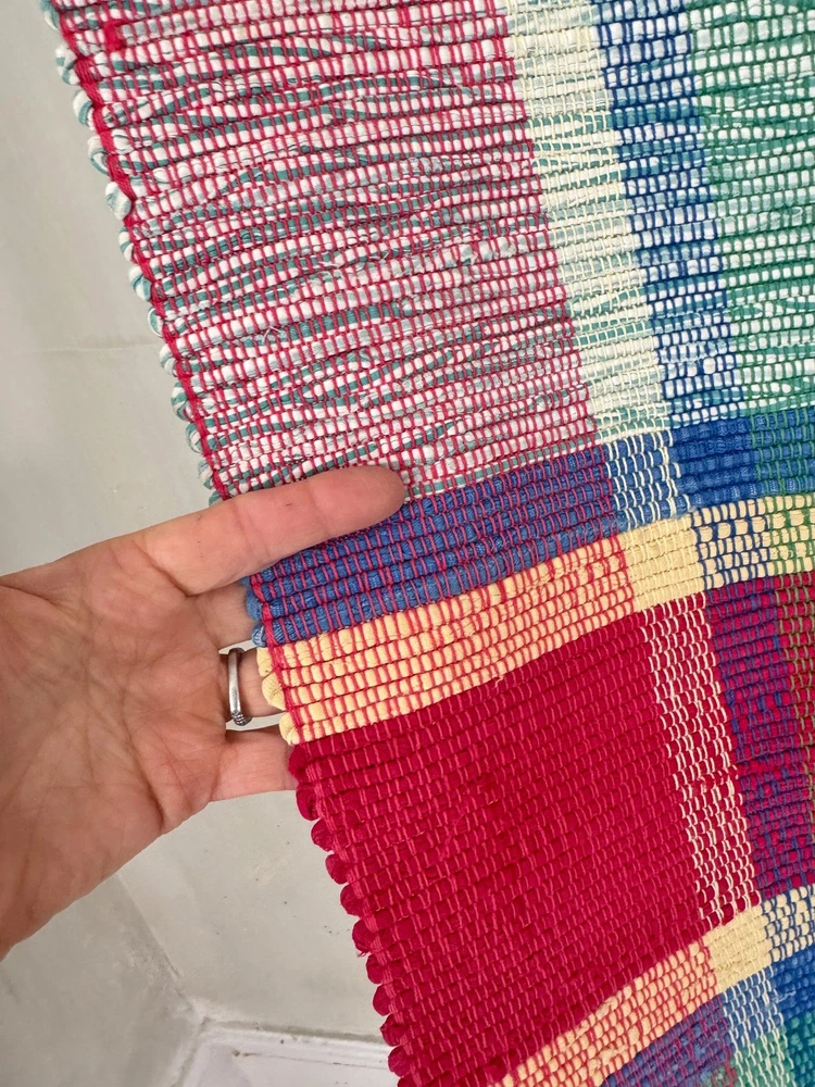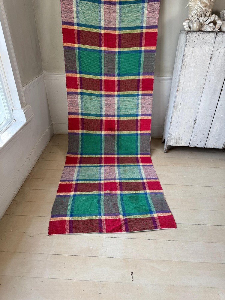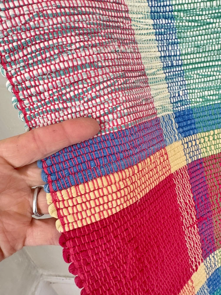 Welcome To The Textile Trunk ~ please follow us on Instagram , we are @textiletrunk ~ ~*~ I’m so excited to share this beautiful handwoven European rag rug! Each piece tells a unique story, woven from strips of leftover fabric, creating a stunning array of colors and textures. Rag rugs like these were cherished household items, made to be both practical and beautiful, offering warmth and personality to any space. Rag rugs have a long history in European homes, particularly in rural areas where resourcefulness was essential. These rugs were traditionally made using remnants of old clothing or fabric scraps, repurposed into durable and decorative floor coverings. Each rug reflects the creativity and skill of its maker, with patterns that vary from simple stripes to intricate designs. This tradition of upcycling materials speaks to the timeless appeal of sustainability, a value we hold dear today! This charming rug would be perfect for a farmhouse, cottagecore, or rustic interior, adding a touch of history and warmth to your space. Use it as a runner, accent rug, or wall hanging—it’s as versatile as it is lovely! Not only do I feel so lucky to share these amazing works of art for use in our homes today, but this also supports eco-friendly practices by giving old materials a new life through upcycling and creative reuse! MEASUREMENTS Approximately 3.4 yards long by 36 inches wide ! Super wide for these beauties!~ CONDITION This textile is in as found, not freshly laundered condition. There are some marks in the bottom half, please use the zoom feature to see them exactly. I've reduced the price of this bolt because I'm not sure that they will clean or not !~It will certainly get lighter with cleaning but may not disappear Otherwise Lovely with only light signs of time and use. This textile can be dry cleaned, easier to take to have it cleaned as it's difficult to do in a home washing machine!~ This bolt has a seam around the middle around 3 yards ish!~ Inventory: RR641