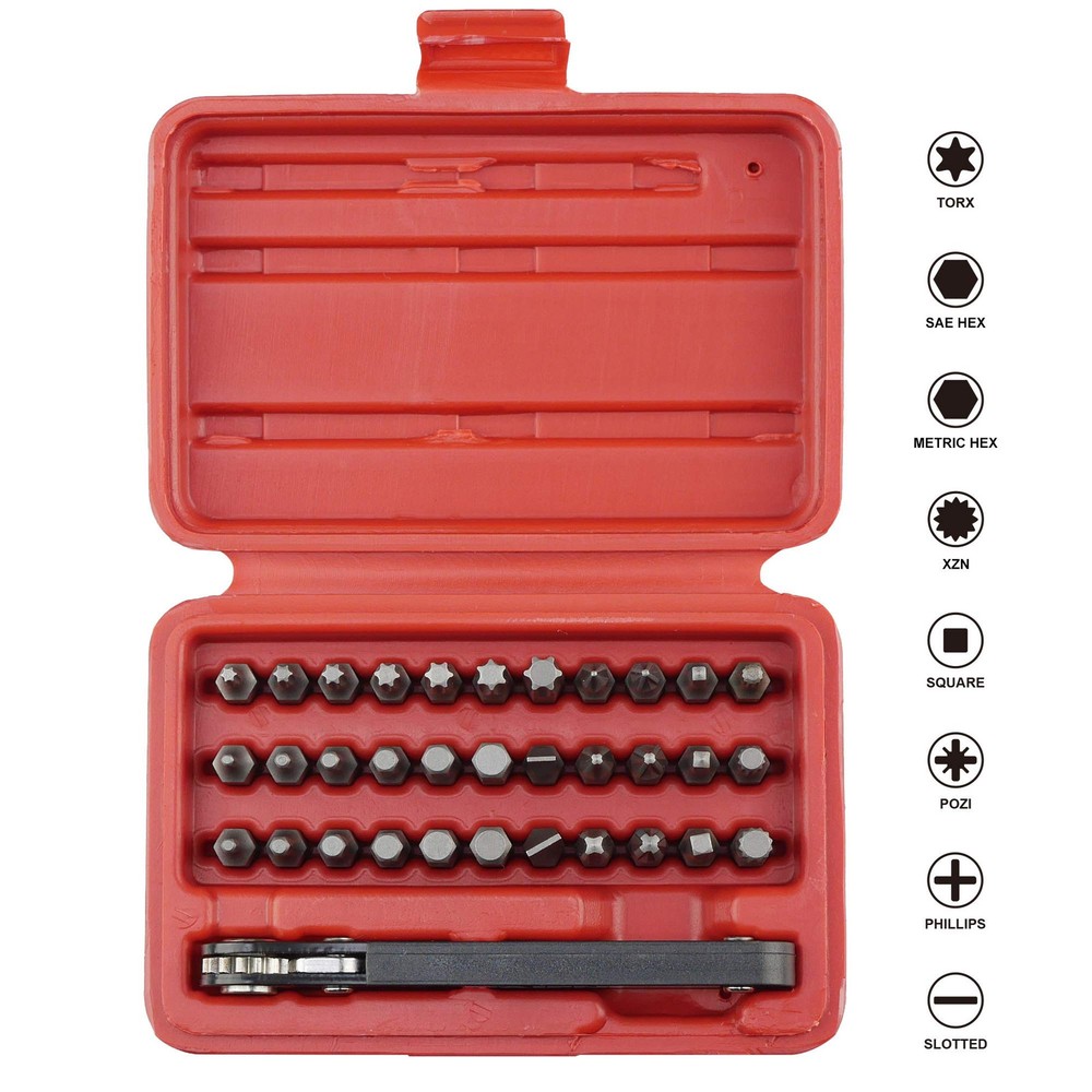 Comprehensive set of 1/4-inch hex shank specialty bits Mini-size stubby ratchet wrench is perfect for tight work spaces and close quarters Chrome vanadium steel bits are constructed with strong hardness and precisely machined tip The set come in a compact, blow-molded case for safe and easy storage Includes 33-piece 1-inch bits and a mini ratchet wrench