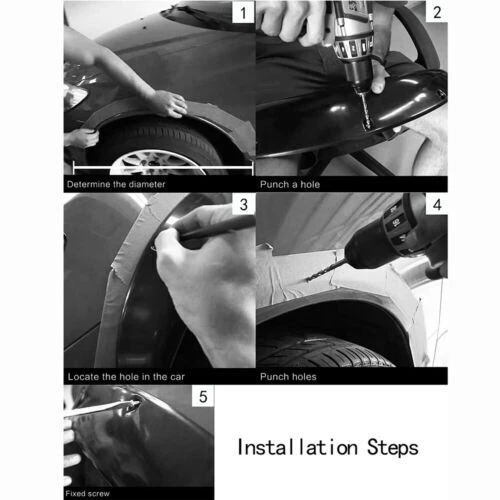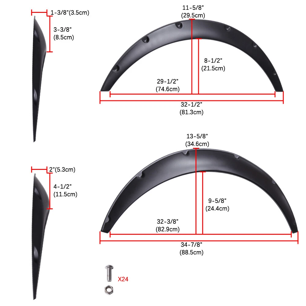 Description Feature: -Smooth and precise edge cutting finish. -Additional Coverage for Larger Tire and Wheel Packages -Improve Appearance and Styling Dramatically -Protects wheel from mud, scratches, sand and other outer damage. -Made of high quality PP plastic, flexible and resistant to corrosion, harder and more durable. -Easy to install & Universal Fitment (Please make sure to measure vehicle's fenders size before purchasing). Specification: 100% brand new Installation: Riveted / bolted / sealant silicone Material: PP,Polyurethane Colour: Black Placement on Vehicle: Left, Right, Front, Rear Size: Front: approx.2 Pcs : 810 x 295mm/ 32 x 11-5/8in Rear: approx. 2 Pcs : 890 x 350mm/ 35 x 13-5/8in 1 Set of 4: 2 front and 2 rear( Include Screws and Nut) Package included: 1 set (4pcs) of Fender Flares 24 PCS Screw Select and install: -Firstly, determine the diameter of the wheel eyebrow of the original car, then select the appropriate wheel eyebrow size; -After receiving the goods, put the wheel eyebrow in the original car, and there are 6 screws on the wheel eyebrow to determine the hole position; -Punch holes in the original vehicle and the wheel eyebrow and fix with screws. Note: Please allow 1-2mm errors due to manual measurement. Item color displayed in photos may be showing slightly different on your computer monitor since monitors are not calibrated same. On Jan 16, 2025 at 01:05:04 PST, seller added the following information: