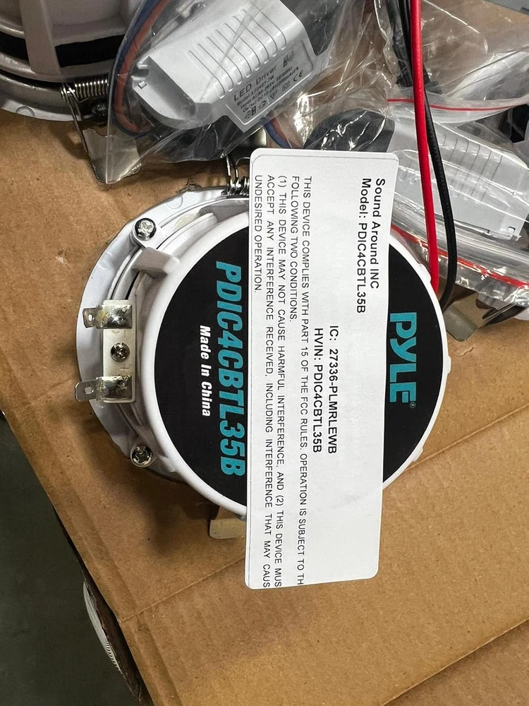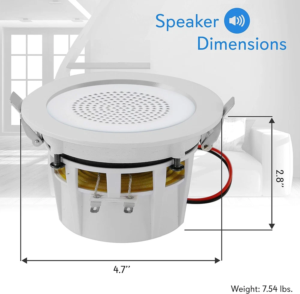 Store New Arrivals Add to Favorite View Feedback Contact 3.5” Ceiling Wall Mount Speakers - 2-Way Full Range Sound Stereo Speaker Flush Design W/Bluetooth LED Light Aluminum Frame Housing 60Hz - 20Khz Frequency Response & 280 Watts Peak PDIC4CBTL35B Description Item model number PDIC4CBTL35B Signal-to-Noise Ratio 9E+1 dB Number of Items 1 Power Source Corded Electric Control Method Remote Warranty Type Limited Frequency Response 1 KHz Product Dimensions 2.7"D x 12.01"W x 4.7"H Woofer Diameter 3.5 Inches Includes MP3 player? No Bluetooth Range 9.14 Meters Controller Type Remote Control Unit Count 1.0 Count Speaker Size 5 Inches Wireless Communication Technology Bluetooth Material Aluminum, Polyprone Vehicle Service Type Car Package Type Standard Packaging Impedance 8 Ohm Audio Output Mode Stereo Number Of Circuits 1 Specific Uses For Product indoor spaces, home theaters, living rooms, offices, parties, and gatherings Included Components Speaker Connection Wire, Bluetooth Controller, 3.5’’ Speakers (4), Power Supply Subwoofer Diameter 3.5 Inches Subwoofer Connectivity Technology Wireless Global Trade Identification Number 00068888770477 Speaker Maximum Output Power 280 Watts Water Resistance Level Not Water Resistant Connectivity Protocol Bluetooth Item Weight 1.36 pounds Connectivity Technology Bluetooth Audio Driver Type Dynamic Driver Special Feature Speakers Mounting Type Ceiling Mount Color White Is Discontinued By Manufacturer No Surround Sound Channel Configuration 2.0 Compatible Devices Smartphone Maximum Range 9.14 Meters Is Waterproof False Recommended Uses For Product For Music Players Speaker Type In Ceiling Size 3.5" FLUSH MOUNT DESIGN: A pair of flush mount design midbass speaker for simple and easy in-wall / in-ceiling installation. The product includes the cutout dimension at 4.5’’ in diameter x 2.7'' in depth and environmentally friendly ABS construction BLUETOOTH CONNECTIVITY: Built-in Bluetooth wireless streaming receiver and white LED light bulb with 650 lumens. Compatible with all of today's latest devices and ranges up to 30 ft. The product also includes Bluetooth controller and power supply 60Hz - 20kHz FREQUENCY RESPONSE: Pyle 3.5” speaker system has a 1/2’’ polymer tweeter and frequency response. This flush mount speaker is pack with exceptional 8 ohm impedance rating and impressive 280 watts power handling capability 280 WATTS PEAK: Pyle in-wall speaker system were carefully combined to reproduce sound clearly with outstanding responsiveness. Built-in 1/2’’ polymer tweeter and 4-channel digital amplifier for the full range stereo sound reproduction ALUMINUM FRAME HOUSING: Pyle ceiling speakers has a lightweight aluminum alloy frame housing that features reinforced polypropylene cone with rubber edge. It also features spring-loaded clips for easy installation Pyle Model : PDIC4CBTL35B 3.5'' Aluminum Frame Ceiling Speaker Kit 3.5’’ Bluetooth Ceiling / Wall Speaker Kit, (4) Aluminum Frame 2-Way Speakers with Built-in LED Light Features: Includes (4) 3.5’’-inch Speakers Bluetooth Wireless Music Streaming Lightweight Aluminum Alloy Frame Housing Built-in LED Light: High-Efficiency, Low Power Consumption 2-Way Full Range Stereo Sound Reproduction Built-in 1/2’’ Polymer Tweeter & 4-Ch. Digital Amplifier Spring-Loaded Clips for Easy Installation Reinforced Polypropylene Cone with Rubber Edge Simple Speaker Connector Post Mounts Flush on Walls or Ceilings Perfect for Custom Installations & Applications ABS Construction Bluetooth Connectivity: Built-in Bluetooth Wireless Streaming Receiver Works with All of Today’s Latest Devices (Smartphone, Tablet, Laptop, Computer, etc.) Includes Bluetooth Controller & Power Supply Bluetooth Network Name: ‘Pyle’ Bluetooth Network Password: ‘0000’ (4 Zeroes) Bluetooth Version: 4.0 Wireless Range: 30’+ ft. What’s in the Box: (4) 3.5’’ Speakers Speaker Connection Wire Bluetooth Controller Power Supply Technical Specs: MAX Power Output: 280 Watt Light Bulb Type: White LED Bulb, 5 Watt Brightness: 650 Lumen Impedance: 8 Ohm Sensitivity: 90 dB Frequency Response: 60-20 kHz Total Dimensions (Diameter x Depth): 4.7’’ x 2.8’’ Cutout Diameter: 4.2’’ Mounting Depth: 2.7’’ Speaker Weight: 1.36 lbs. (-Each) Power: 100/240V (12V DC Power Supply) The Pyle In-Wall/Ceiling Bluetooth Speaker Kit delivers effortless stereo sound to any room in your home or office. Each speaker features a built-in LED light and aluminum frame housing basket that provides an extra line of safety and heat-resistance. The included Bluetooth controller allows for wireless music streaming ability and doubles as a sound processing digital amplifier. High compliance polymer tweeters deliver full, rich audio without cluttering floor space. Round style speaker design makes them perfect for any custom audio application on virtually any flat surface. Integrated spring-loaded clips provide secure and flush wall mounting while stain-resistant grill covers and ABS construction add extra appeal. Included cut-out template makes installation easy. Achieve wide-ranged wireless sound performance and add audio to any room with the Pyle In-Wall/Ceiling Bluetooth Speaker Kit with Built-in LED Lights. ABOUT US We offer the best prices around on high quality products. Our E-store includes media such as books, movies, music and games while offering electronics, toys, sporting apparel, clothing, tools, general home, garden items and more. SHIPPING We are always working hard to ensure your package arrives as soon as possible. Please understand that some factors like weather, high postal traffic, and the performance of shipping companies are outside of our control. We offer free shipping to the lower 48 states and ship within 2 business days of payment, usually sooner. We do not accept P.O. Boxes. Please provide a physical address. For shipping outside of the continental USA, we only use eBay's Global Shipping Program.The item is shippe