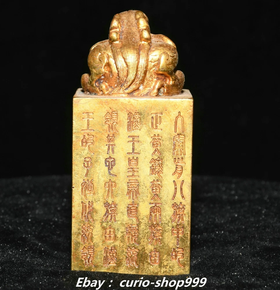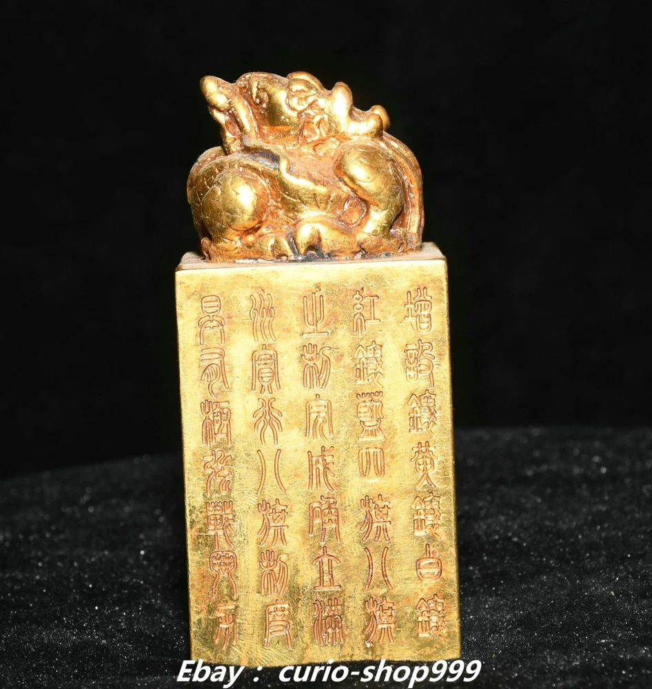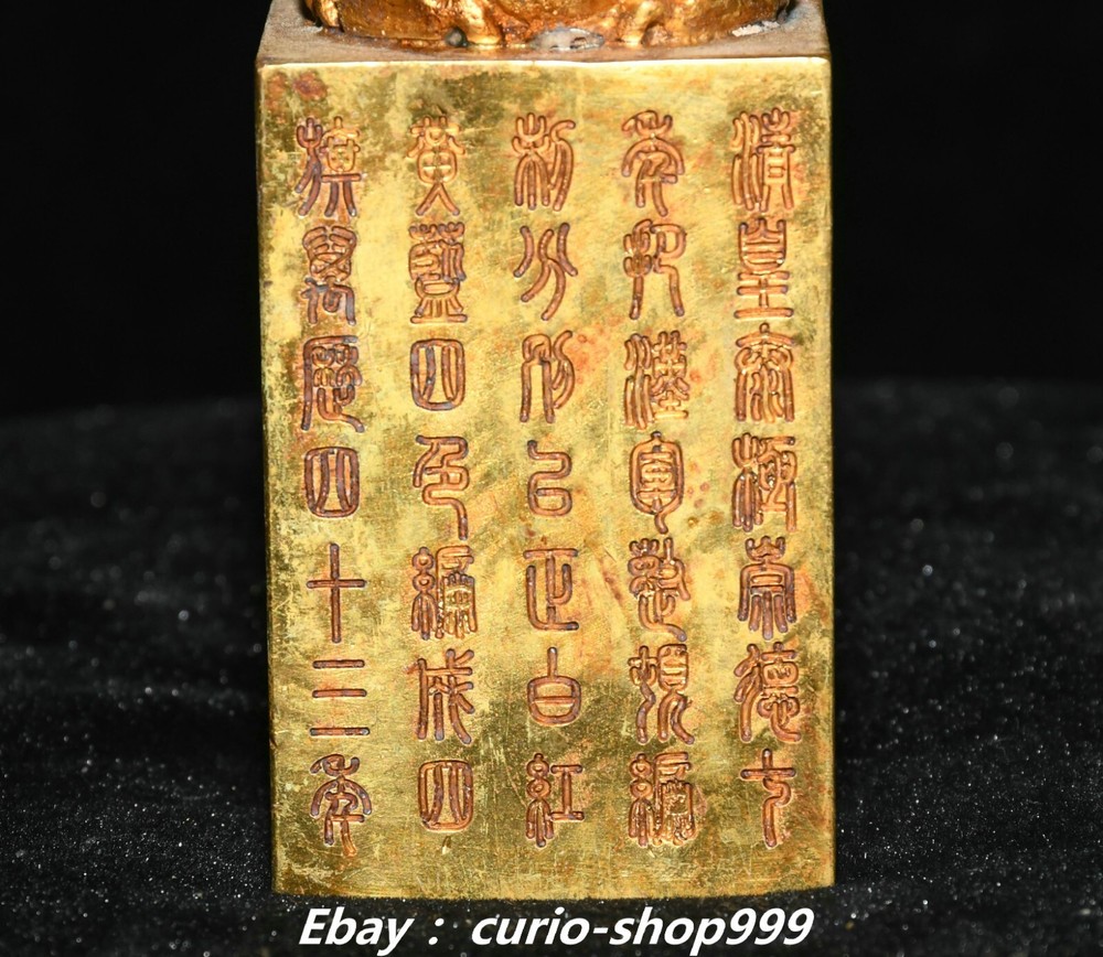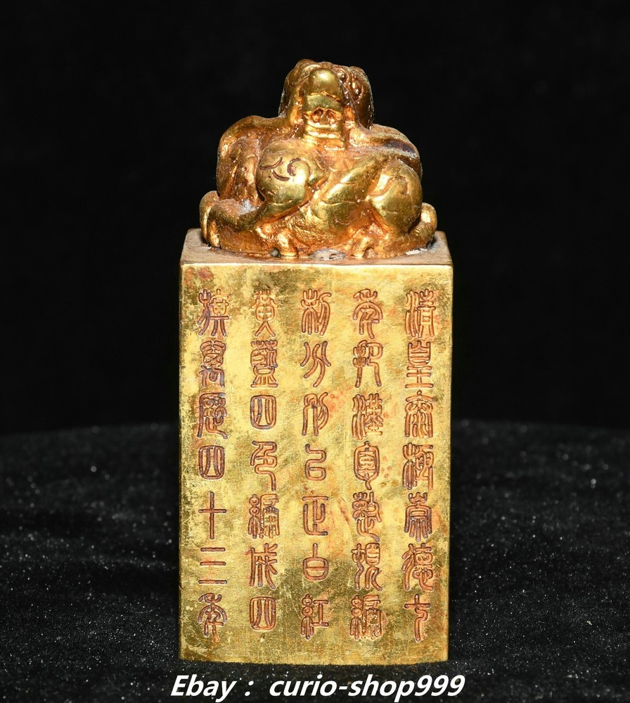 **** Welcome to our antique & Collectable Shop : Porcelain**** Description: Here is 3.5" China Dynasty Copper Gold Inscription Dragon Loong Beast Seal Stamp Signet . It is in good condition, and was created by skilled craftsmen in traditional style with fine handcrafts.This is a great piece of valuable collection, a valuable personal alter or a very good present. the handwork is very fine with incredible detailling. Don't miss out this chance to get it.Wish you good luck! . Material : Copper Gold Size : Heigh t 3.5 Long 1.6 B readth 1.6 (inch) Condition Perfect Condition. Perfect, with no scratches, flaws or repairs. Weight: 1.2 KG----included the weight of packing materials Shipping cost to all over the world countries in Free Honored Customers: We are selling the collectibles products and crafts in Beijing ,China since 1993 and collected them all over the world all the time . In our shop the bronze sculpture, animal, vase, urn, flowerpot,Incense Burner.Table chair sets. Militaria goods. buddha statues, Bodhisattva Statues, Buddhist Ritual Items etc is our speciality .Many of the items we sell come from our own personal collection and have been in our family for a very long time .My great-grandfather was the first in this family to start collecting art & antiques when he still lived in San Xi and Tibet around 1922 ,some of the paintings he once collected can now be seen in museums around the globe.We won't make money from t he shipping cost, if you dislike the item when you receive it,we can refund all of your money to you within thirty days. Please confidence for bidding . We recommend the combine shipping and offer you an big price discount if you order more items together ! 2024.10.3 四 号