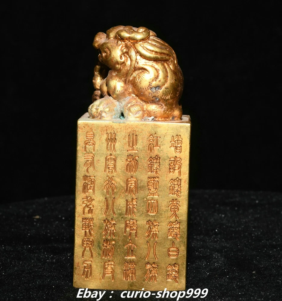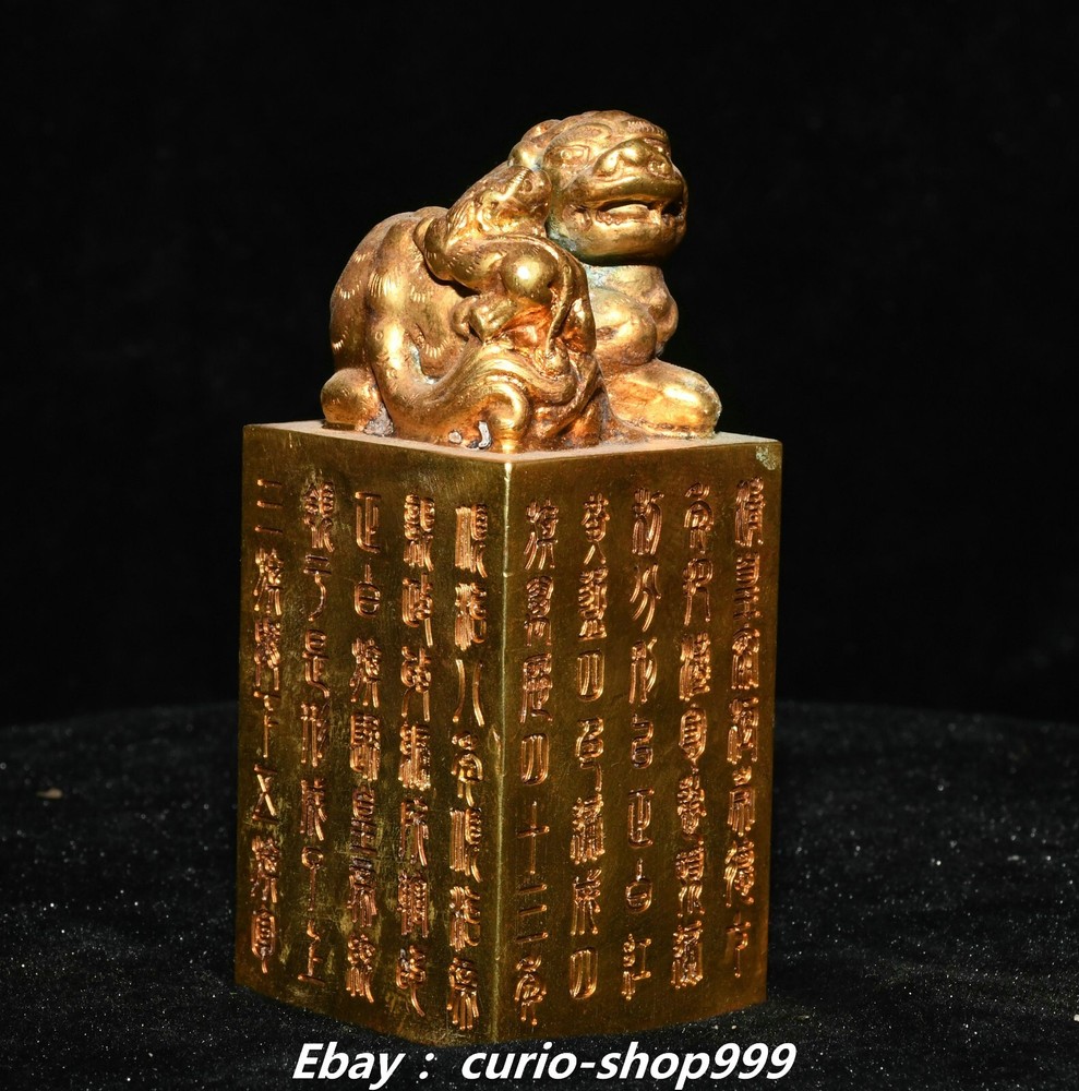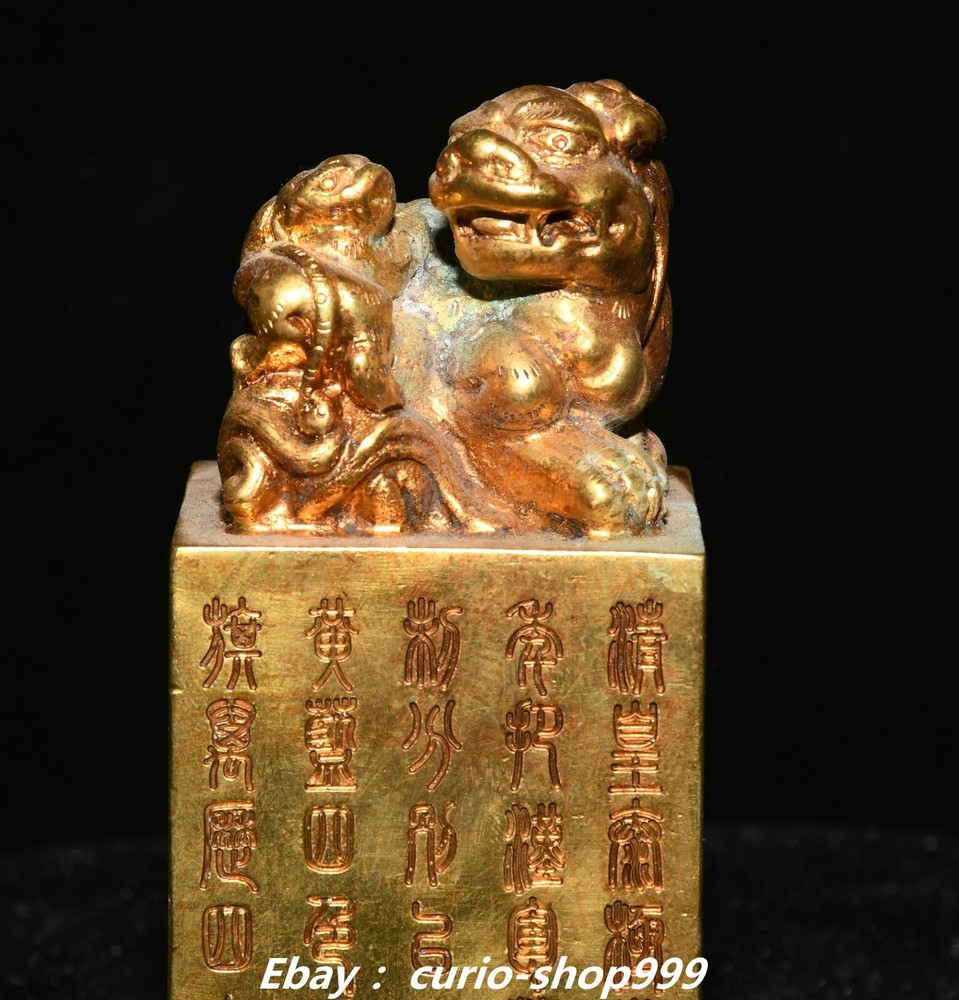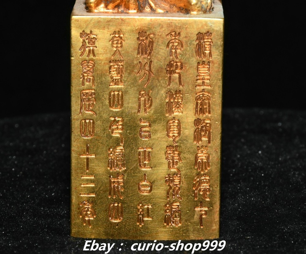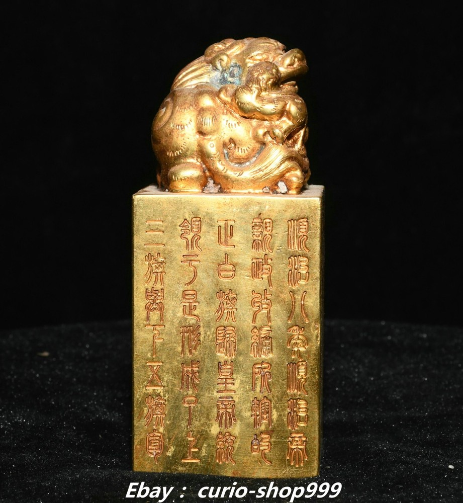 **** Welcome to our antique & Collectable Shop : Porcelain**** Description: Here is 3.5" China Dynasty Copper Gold Inscription Dragon Beast Pixiu Seal Stamp Signet . It is in good condition, and was created by skilled craftsmen in traditional style with fine handcrafts.This is a great piece of valuable collection, a valuable personal alter or a very good present. the handwork is very fine with incredible detailling. Don't miss out this chance to get it.Wish you good luck! . Material : Copper Gold Size : Heigh t 3.5 Long 1.6 B readth 1.6 (inch) Condition Perfect Condition. Perfect, with no scratches, flaws or repairs. Weight: 1.2 KG----included the weight of packing materials Shipping cost to all over the world countries in Free Honored Customers: We are selling the collectibles products and crafts in Beijing ,China since 1993 and collected them all over the world all the time . In our shop the bronze sculpture, animal, vase, urn, flowerpot,Incense Burner.Table chair sets. Militaria goods. buddha statues, Bodhisattva Statues, Buddhist Ritual Items etc is our speciality .Many of the items we sell come from our own personal collection and have been in our family for a very long time .My great-grandfather was the first in this family to start collecting art & antiques when he still lived in San Xi and Tibet around 1922 ,some of the paintings he once collected can now be seen in museums around the globe.We won't make money from t he shipping cost, if you dislike the item when you receive it,we can refund all of your money to you within thirty days. Please confidence for bidding . We recommend the combine shipping and offer you an big price discount if you order more items together ! 2024.10.3 四 号