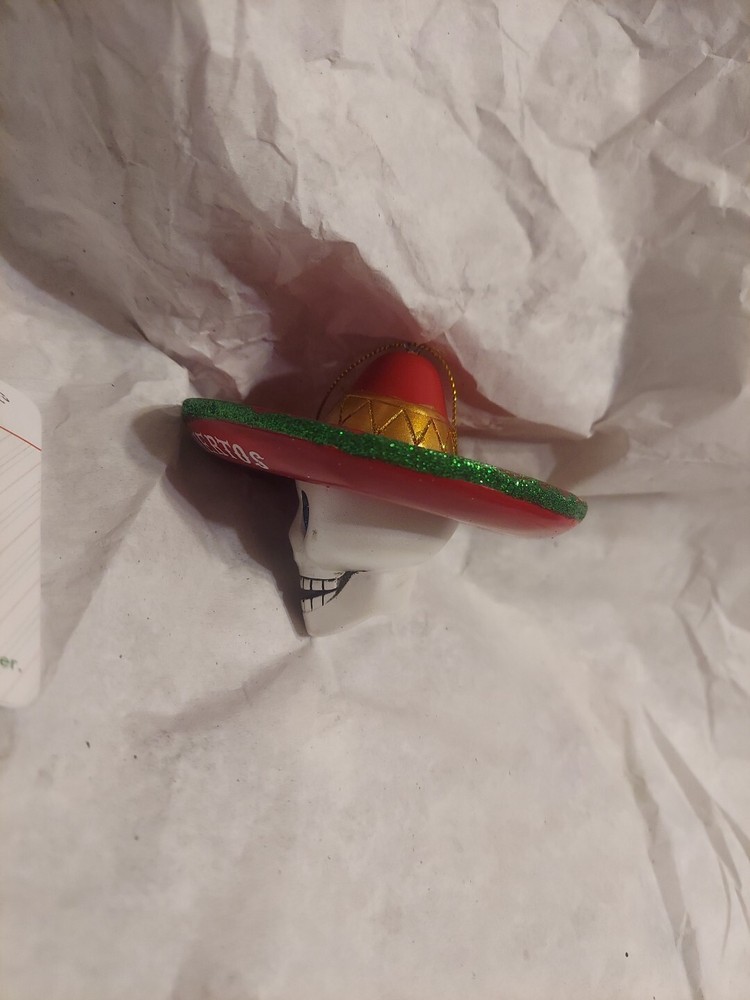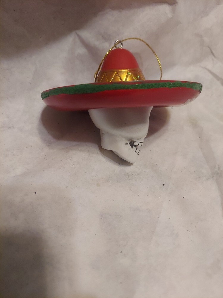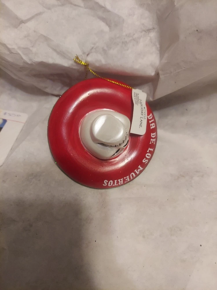 The product is a 3.5" Christmas tree ornament featuring a skeleton wearing a sombrero and associated with "DIA DE LOS MUERTOS" (Day of the Dead). It is made of resin and has a skull character theme, suitable for Halloween decor. The ornament is from the Holiday Lane by Macy's brand and was manufactured in China.