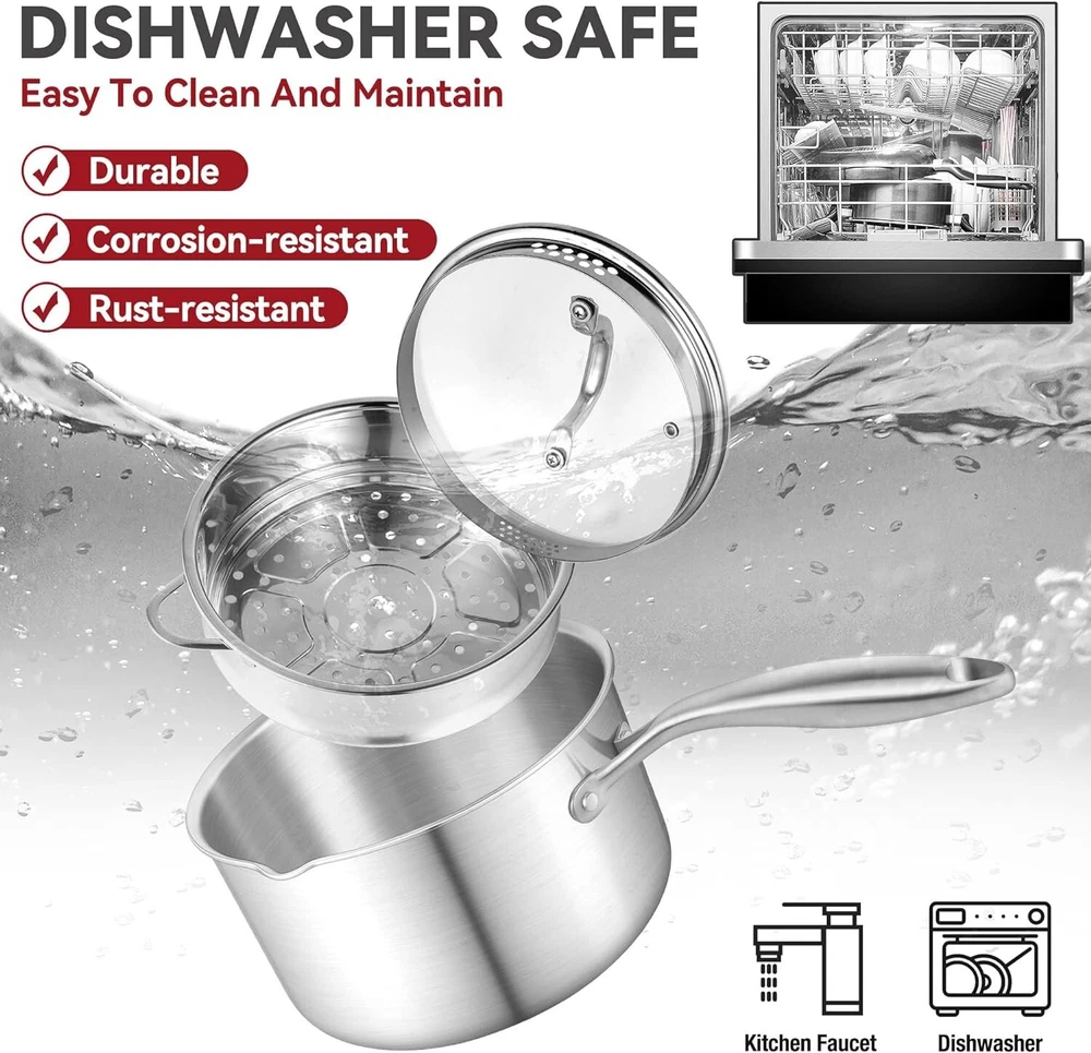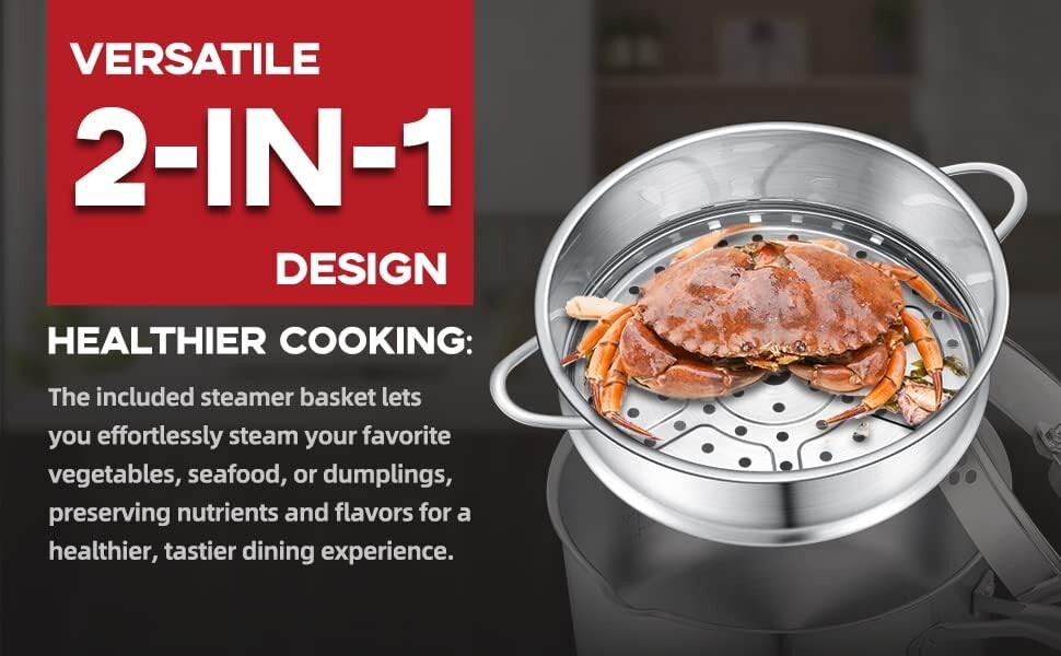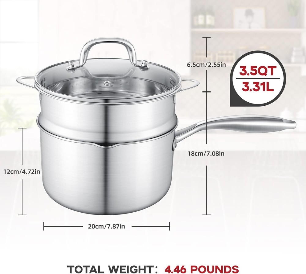 Quart Stainless Steel Saucepan with Steamer Basket, Tri-ply Full Body, Multipurpose Sauce Pot with Two-Size Drainage Holes Lid, Perfect For Boiling Gravies, Pasta, Noodles Versatile 2-in-1 Design: This high-quality stainless steel saucepan features a built-in steamer basket, perfect for preparing delicious, healthy meals while saving space in your kitchen. Ideal for simmering, boiling, and slow cooking, this saucepant is perfect for preparing soups, stews, pasta, chili, and much more, making it an indispensable addition to your culinary arsenal Thicken Tri-ply Full Body Construction: 18/10 Food-Grade stainless stee linner layer, the middle sandwich aluminum layer with 304 stainless steel outer layer. The saucepan features a superior tri-ply design, combining stainless steel and aluminum layers for even heat distribution. Say goodbye to hot spots and toxins, enjoy healthy consistent cooking results that last a Visual Cooking & Easy Draining: The tempered glass lid and visiual precise "QT" and "L" markings on the body of the pot make it easy to monitor your dishes as they reach perfection. Two sizes of draining holes allow for easy draining of synchronized types of food residues, such as large solids in sauces and water in dried pasta Comfortable and Secure Handling: Designed with your comfort in mind, the saucepan features heat-resistant handles with stainless steel rivets for a secure grip. Reinforced steel rivets remain strong and will not soften under high temperatures. They are able to withstand multiple high-load lifts, pours, grips for long-lasting use. You do not need to worry about the handle falling off Versatile Compatibility: The QT stainless steel saucepan is compatible with all stovetops, including induction, gas, electric, and ceramic. Its tight-fitting lid ensures precise cooking control while allowing you to monitor your dishes as they reach perfection Where Quality Meets Flavor