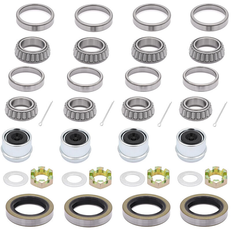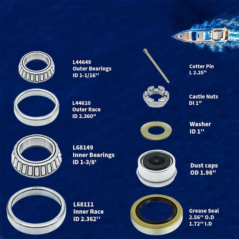 3500LB 1-1/16'' to 1-3/8" Boat Trailer Wheel Axle Bearing Seal Kit L68149 L44649 Item Description Enjoy Reassuring Driving. By installing bearing kit on your trailer axle, help the spindle hub easily copes with high speed rotation, provide excellent support to spindle, reducing friction coefficient of hub, so you can enjoy a quiet, smooth and steady driving experience. No More Leaking. With Doulbe Lip Grease Seals and Dust Cap made with mild steel, seal with NBR rubber, effectively prevent the intrusion of pollutants, expressive dynamic sealing performance and better pressure resistance. Once for all solve the leak problem. No More Shaking Spindle. Install axle castle nut kit to enjoy it's excellent shock resistance, withstand wear and shear and a good reuse performance, with matching washer, cotter pin, once for all fix the shaking, leaking trailer pindle. One Package for All. Sizes are mark on P5. Including 4 set of inner&outer bearing and race(L68149/L68111/L446494/L44610), 4 grease seal, 4 castle nut, 4 washer, 4 cotter pin, satisfy your need of multiple repairs, save the trouble to go to the local shop, get all the trailer accessories you want one stop. Features 【IMPROVED PERFORMANCE】 Upgrade your trailer axle's performance with our 3500 lb trailer axle bearing kit. By reducing friction and ensuring smoother rotation, this kit protects rotating parts and maintains proper positioning of the rotation axis, providing exceptional support for the spindle. 【UNIVERSAL FIT】 This wheel straight idler trailer axle kit is designed to fit 3500lb 1-1/16'' to 1-3/8'' trailer axles, spindle #84, and EZ-Lube axles. Our premium quality materials and construction ensure low wear, low vibration, and low working noise, resulting in a longer lifespan and improved performance. 【PREMIUM QUALITY】 We believe in delivering only the best quality products to our customers. That's why our wheel L68149& L44649 bearing kit is made with chrome steel bearings and all trailer hub parts are constructed with high-quality materials. Trust in our expert craftsmanship and commitment to excellence for a reliable and long-lasting product. 【12-MONTH WARRANTY】 If for any reason at all, you are not fully satisfied with the boat 3500LB bearing kit, simply contact us through amazon message at any time. We will provide comprehensive quality assurance for our product. Specifications Condition:100% Brand New Warranty: 90 Day Free Return:30 Day Use: 3500 lb Trailer Axles Inner Bearing L68149, I.D. 1.378'' Inner Race L68111, O.D. 2.362'' Outer Bearing L44649, I.D. 1.063'' Outer Race L44610, O.D. 1.980'' Grease Seal 171255TB (10-19) Double Lip, Spindle #84 1.719'' x 2.565'' Package Included Inner Bearing L68149 x 4 pcs Inner Race L68111 x 4 pcs Outer Bearing L44649 x 4 pcs Outer Race L44610 x 4 pcs Grease Seal 171255TB (10-19) x 4 pcs Washer x 4 pcs Cotter Pin x 4 pcs As pictures show FAQ: I purchased by mistake, how do I cancel the order? Please contact us ASAP. If the item has not been shipped out we can cancel the order for you. If the item was shipped out you can refuse the package and wait for the item to return to us. I received your item but it does not fit or is defective Please contact us so we can assist you on the matter. Buy with confidence Our quality is based on meeting the requirements of the manufacturer and improvement them in design problems manufacture. NOTE: (1)It would be highly appreciated if you might contact us first once you have any problems concerning the items. And you can expect all the issues would be resolved ASAP! (2)Please let us know before you send us the neutral/negative feedback that wont help to finish the issues. And I will definitely try my best to provide the best solutions which would meet our satisfactory! (3)According to the distance of the receipt address items would be sent from CA or NJ