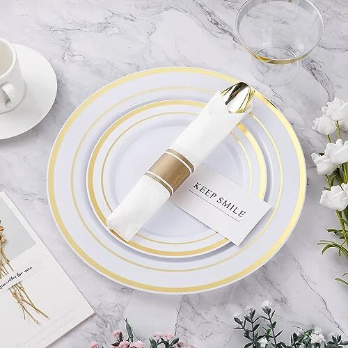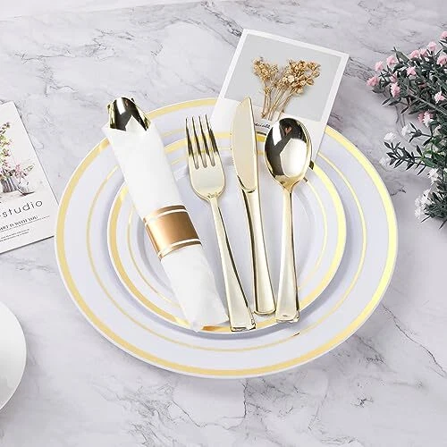 PERFECT DIMENSION - Seamlessly fitting into every occasion, this exceptional party plate set is the perfect choice. When you invest in this package, you'll receive 50 dinner plates measuring 10.25 inches, 50 salad plates at 7.5 inches, 50 sets of gold silverware with pre-rolled napkins, and 50 cups at 9 oz. DURABLE & BPA FREE - Constructed for durability and certified BPA-free, our plastic plates and silverware are manufactured from heavy-duty materials, ensuring they meet the highest food-grade standards. Feel free to utilize these gold plastic charger plates to serve hot foods such as pasta and turkey. VEERSATILE OCCASSIONS - Tailor-made for a variety of events, the elegant design and classy color scheme of these party supplies elevate any occasion. Be it weddings, anniversaries, birthdays, or bachelorette parties, the timeless gold color adds an air of sophistication. The convenience of disposable plates also means less cleanup hassle, particularly valuable for party planners looking to save time. ELEGANT DESIGN - featuring classic white plates adorned with timeless gold rims, effortlessly integrate into any event, resembling authentic ceramic plates. These disposable plates and gold silverware sets exude a classic, timeless aura, much like the cherished memories they help create for guests. CONVENIENT TO USE - No more fussing over pre-party style coordination, whether you're a planner or a host. Once the event is over, just dispose of disposable plates for a quick cleanup. Moreover, these reusable plastic plates are easy to clean and store, adding an extra layer of convenience. Make entertaining a breeze today!