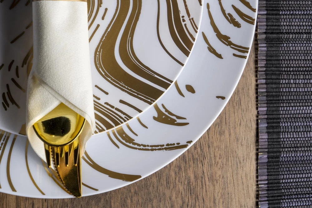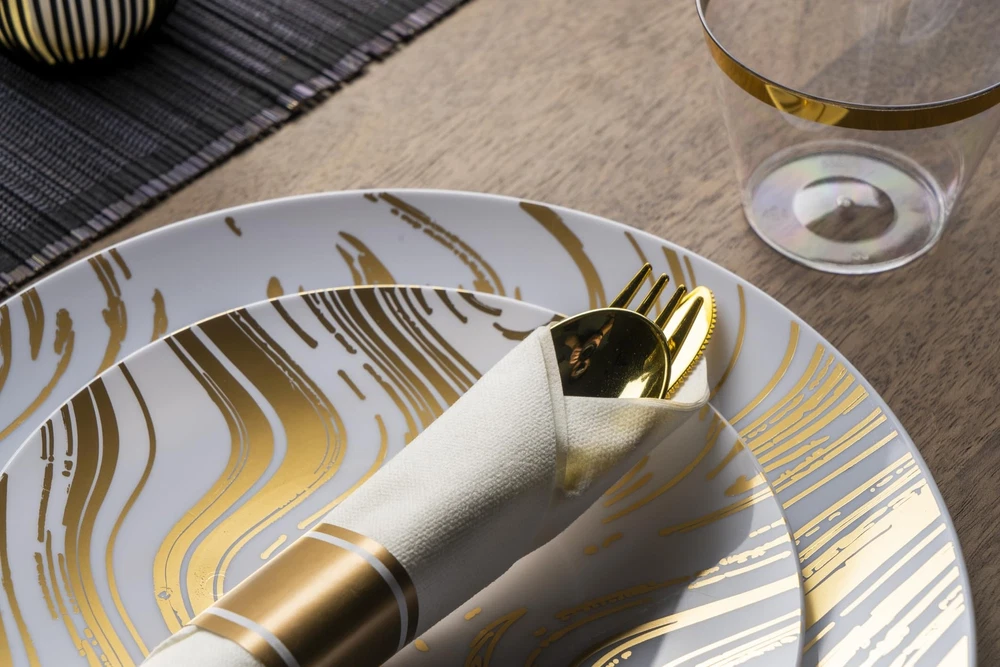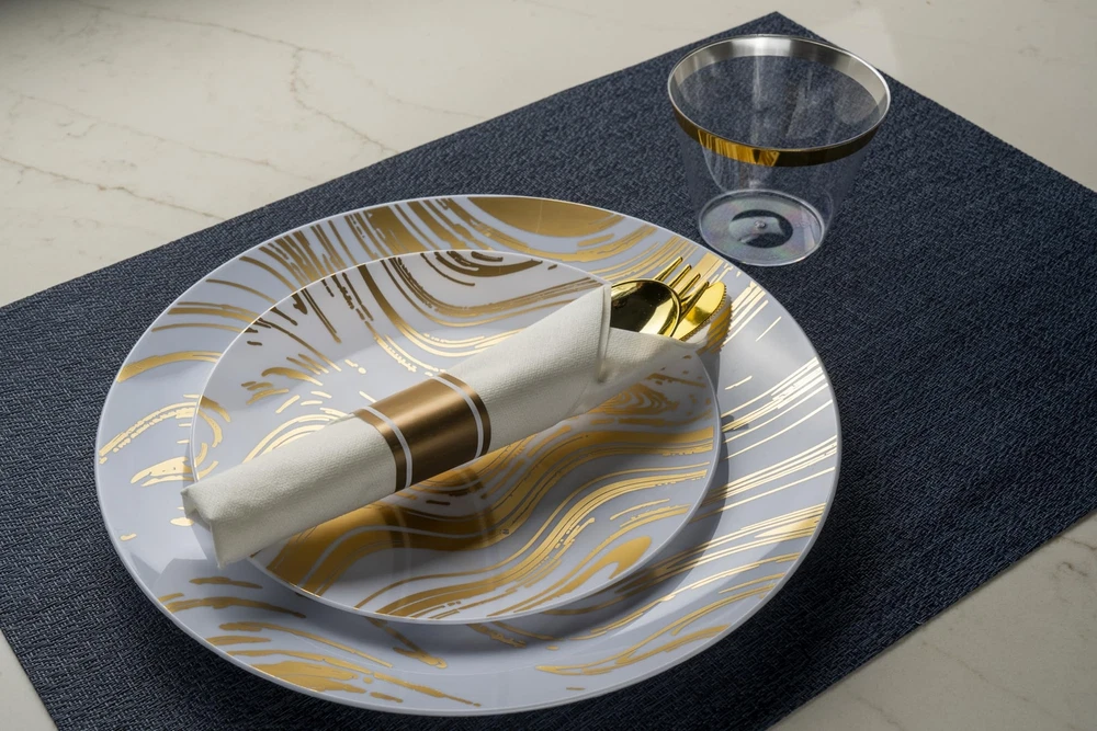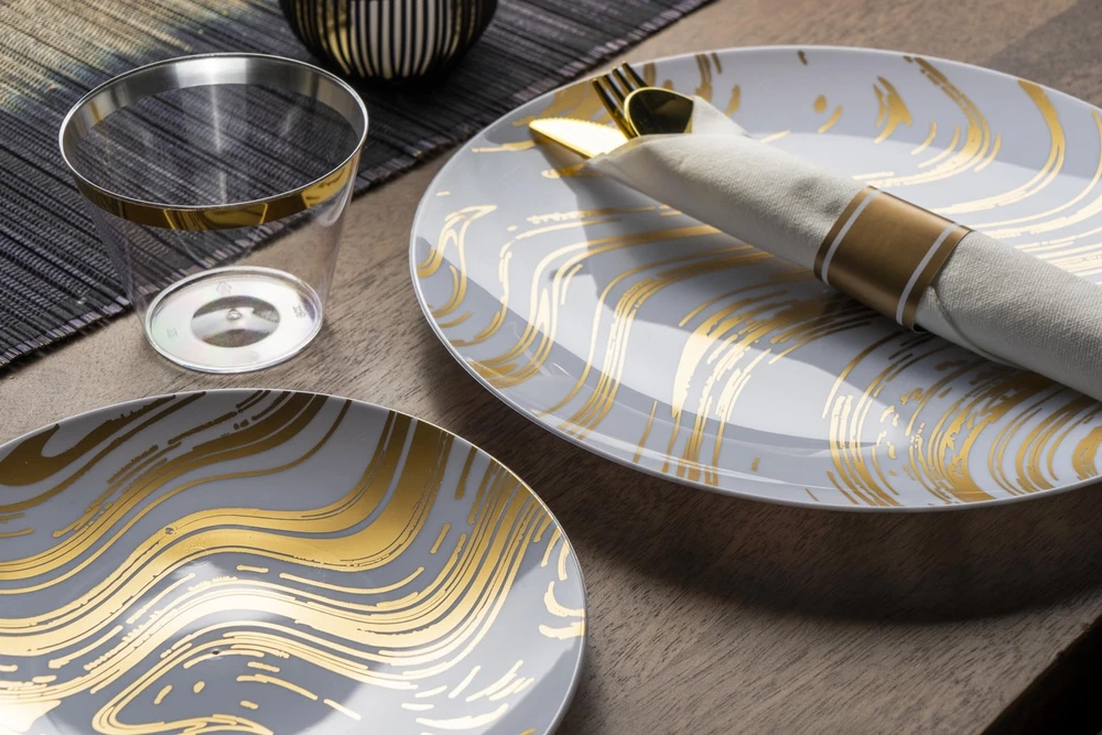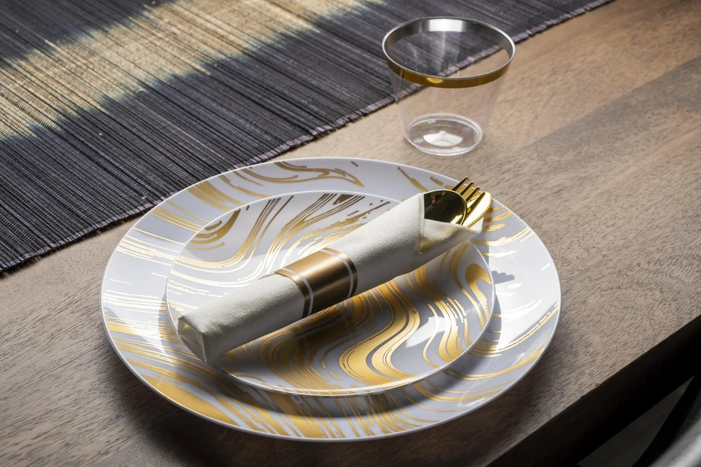 ROBUST & DURABLE- Made from heavy-duty, high-end plastic materials, this disposable dinnerware set is sturdy enough to withstand heavier foods without the risk of breaking or bending. 100% BPA FREE - Our disposable plates, cups and utensils are made from non-toxic, reusable food-grade plastic. To reuse, simply rinse with water. Note: NOT microwave or dishwasher safe. ELEGANT - Crafted with attention to detail, the golden wave design gracefully flows across the plasticware, creating an elegant and eye-catching visual appeal. The modern and sophisticated pattern adds a touch of glamor to any occasion. VERSATILE FOR ANY EVENT - Perfect for any event like weddings, holidays, baby showers, and business parties, Our dinnerware set offers convenience for diverse celebrations. WHAT’S INCLUDED: 350 Piece Plastic Silverware Set for 50 guests. 50 Dinner Plates (10.25”), 50 Dessert Plates (7.5”), 50 Cups (9oz), 50 Pre-rolled Napkins with 50 knives, 50 Forks and 50 Spoons.