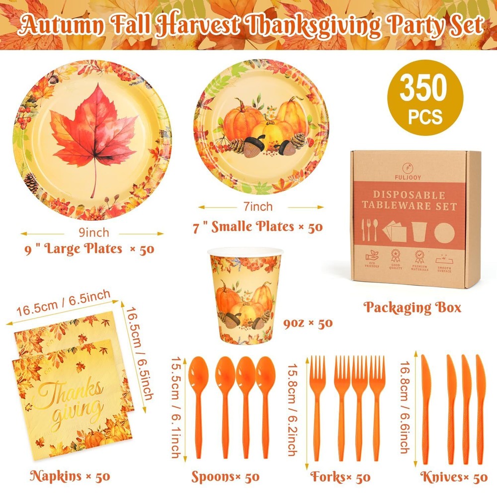 Features: This set provides an ample quantity of party essentials, designed to be waterproof, lightweight, and easy to carry and store. Please confirm the size before purchasing. Specifications: Material: Paper Color: Orange Size: 7-inch and 9-inch paper plates Package Includes: 50 x Pumpkin 7-inch paper plates 50 x Maple Leaf 9-inch paper plates 50 x Napkins 50 x 9oz Paper cups 50 x Plastic knives 50 x Plastic forks 50 x Plastic spoons TIPS: Manual measurements may cause slight size discrepancies. Color differences may exist due to different displays. Complete Autumn Dinnerware Set: Our autumn pumpkin dinnerware set includes 50 large 9-inch plates and 50 small 7-inch plates, 50 napkins, 50 9-ounce paper cups, and 50 knives, forks, and spoons, each measuring 16 cm in length. These sizes are perfect for serving various types of dishes, such as cakes, drinks, and snacks, helping to avoid confusion and adding an elegant touch to your table setting, whether you’re hosting a formal Thanksgiving dinner or a casual fall picnic. Thanksgiving Autumn Plates: Each plate in this autumn set is surrounded by a ring of maple leaves, with two different designs featuring either maple leaves or pumpkins. The blank center complements the background’s warm tones, reflecting the golden hues and vintage charm of the season. These vibrant, beautiful plates are ideal for autumn gatherings, such as Thanksgiving dinners, fall festivals, or even everyday meals, offering a lovely complement to your table decor. Save Time and Reduce Cleanup: The autumn-themed paper plates and cutlery in this set are designed for single use, helping you avoid the hassle of washing dishes. Maximize your time with loved ones and minimize the cleaning burden, allowing you to fully enjoy the festive autumn atmosphere. These plates are also less prone to breakage than traditional ceramic or glass dishes, making them the best choice for entertaining guests during Thanksgiving or other fall-themed events. Perfect Sizes for All Your Dishes: The 7-inch plates are perfect for appetizers and desserts, while the 9-inch plates are suited for main courses. The included napkins and cups are the right size for your guests to enjoy beverages and keep things tidy. This dinnerware set ensures you have the ideal plate for every dish, enhancing the overall dining experience at any fall gathering, be it a harvest festival or a cozy family dinner. Versatile and Festive: Perfect for Thanksgiving, fall-themed birthday parties, autumn picnics, or even everyday dining, this dinnerware set adds a festive touch to your gatherings. The autumnal designs are sure to impress your guests and create a memorable dining experience. Ideal for both casual and formal occasions, this set helps you celebrate the season in style, whether indoors or outdoors.