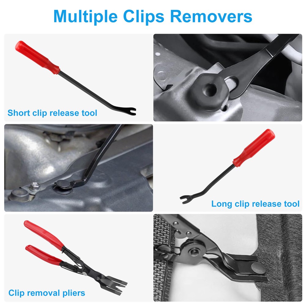 Product Description 352pcs Trim Removal Tool, Pry Tool, Door Panel Removal Tool Kit, Clip Tool, Fasteners Removal Tool with Car Retainer Body Clips Set, Red Product Feature ❤️ All-in-One Trim Removal Kit: Includes 352 pieces: pry tools, clip removers, fasteners, stereo keys, hook picks, adhesive cable clips, valve caps, and more — all in one portable storage bag. ❤️ Universal Compatibility: Perfect for car, boat, RV, and truck repairs. Removes interior and exterior trim, dashboards, door panels, emblems, radios, window moldings & more. ❤️ 12-Size Retainer Clip Assortment: Comes with 120 push-type retainer clips in a organizer box. Fit for Ford, GM, Toyota, Honda, Chrysler and most models. ❤️ Durable & Ergonomic Design: High-quality PP tools with ergonomic non-slip handles reduce damage to your car and boost work efficiency. Built to last through repeated use. ❤️ Extra Cable Management Set: Includes 40 self-adhesive cable clips and 20 zip ties to keep in-car wires tidy and secure. Perfect for both professionals and DIY users." Product Specification Type 352pcs Trim Removal Tool Kit Color Red Total Pieces 352PCS Car Compatibility Universal (Fit for Ford, GM, Honda, Toyota, Chrysler, etc.) Material High-Strength Polypropylene (PP) Application Auto, Boats, RVs, Trucks, Furniture Maintenance Package Included 🎁Trim Tools: 11 × Interior Trim Removal Tools 4 × Precision Hook Picks 2 × Upholstery Fastener Removers 2 × U-Shaped Stereo Removal Keys 6 × Car Stereo Removal Tools 11 × Auto Terminal Removal Tools 2 × Removal Crowbars 1 × Scraper 1 × Trim Clip Removal Pliers 🎁Clips & Retainers: 120 × Universal Car Retainer Clips (12 Sizes) 120 × Spongy Cushions 🎁Cable Management Tools: 40 × Adhesive Cable Clips (2 Sizes) 20 × Nylon Cable Ties 🎁Others: 12 × Tire Valve Stem Caps 1 × Portable Carrying Bag Location Descriptions To improve your buying experience and ensure fast delivery, Your order will be shipped from the warehouse located in either new jersey or california that is closest to your address. If you have any questions, Please contact us. Thank you for your support !
