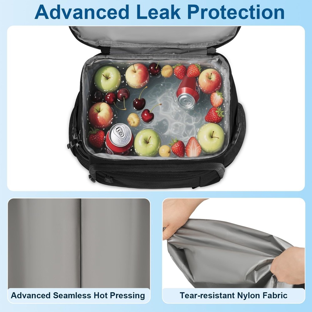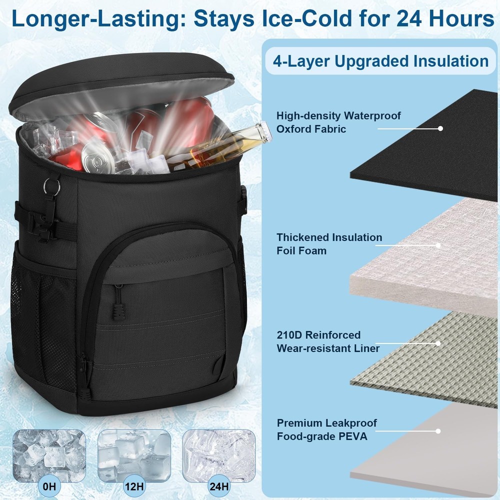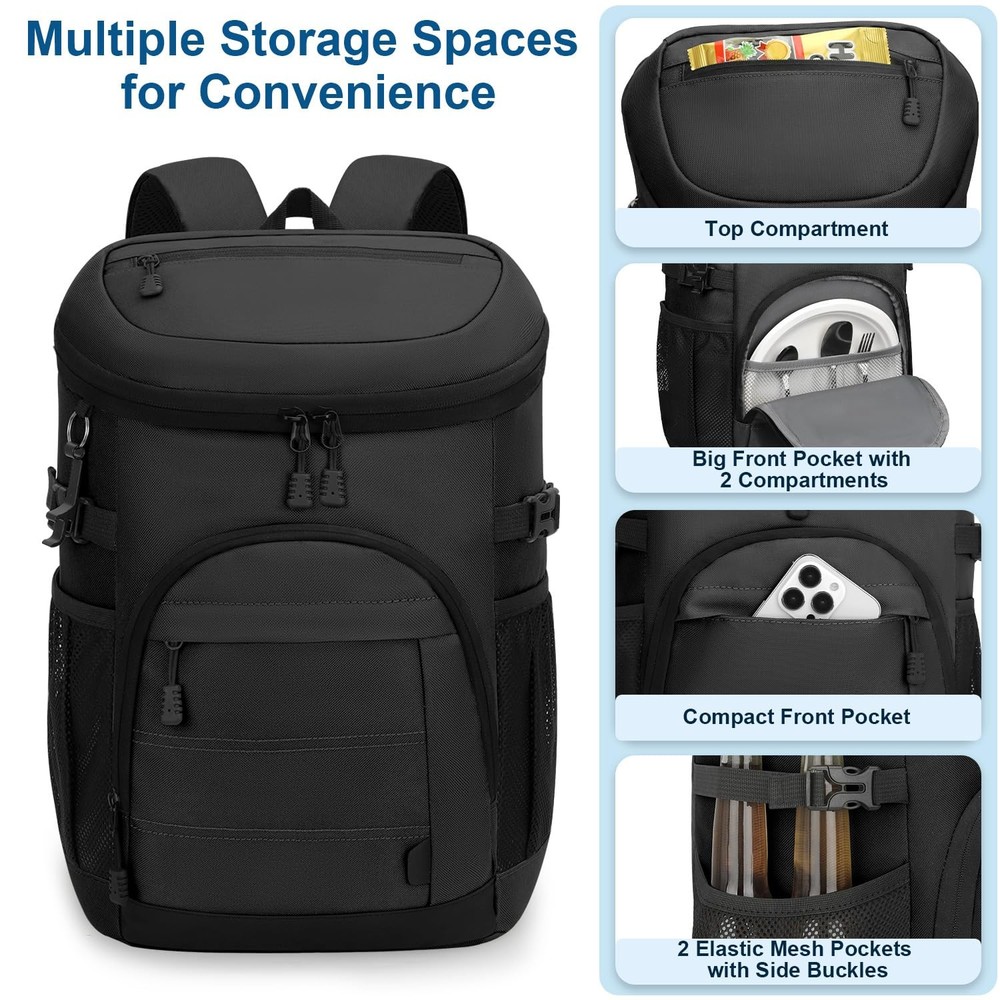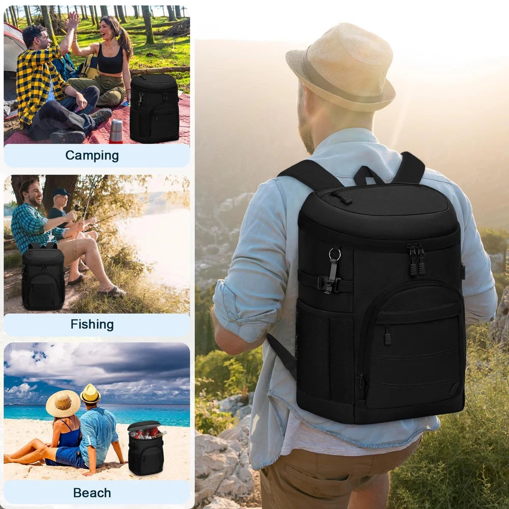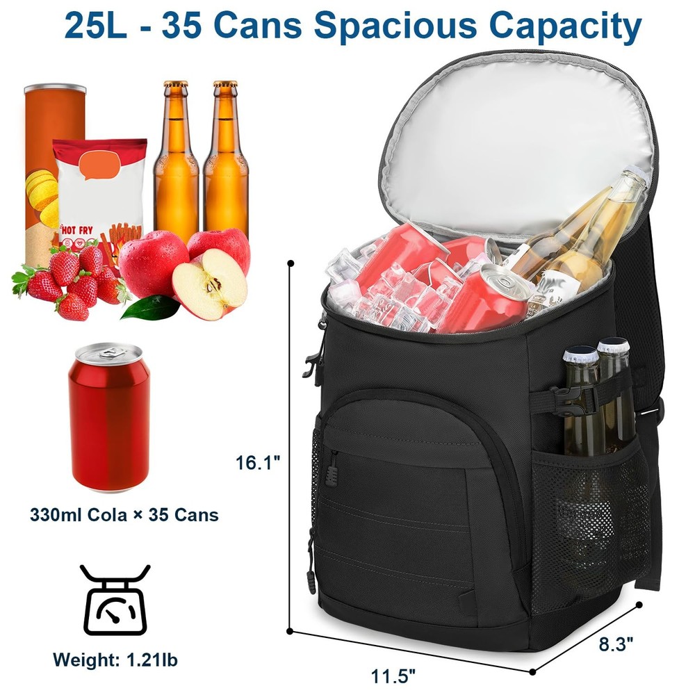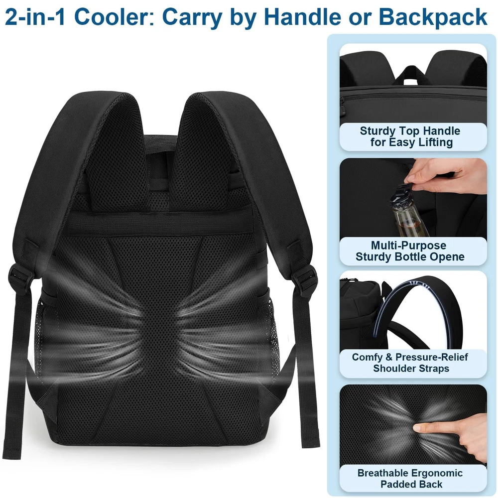 Backpack Cooler Black Large Capacity & Multiple Pockets: This backpack cooler (11.5"L×8.3"W×16.1"H) easily holds 35 cans and all your essentials. It has a spacious insulated leakproof main compartment for drinks/food. The organized storage includes 1 top zippered pocket and 2 front pockets, perfect for storing utensils, snacks, phones, etc. 2 stretchy side mesh pockets with side buckles securely hold bottles. With a handy bottle opener, the backpack cooler for men & women is ideal for trips & outdoor activities. Extended Cooling & Leak-Proof: Our cooler backpack liner is made of premium PEVA material and excellent thickened insulation that keeps items cool for up to 24 hours with ice packs. This insulated backpack features seamless leak-proof hot-press technology, a fully water-resistant lining, and is easy to clean. Ideal for work lunches or weekend camping trips, this soft cooler bag will keep drinks ice-cold, snacks and meals fresh all day long. Heavy-Duty Backpack Cooler: This camping cooler backpack is crafted from high-density scratch-resistant Oxford fabric, with a waterproof exterior keeping contents dry. The ice chest backpack has reinforced seams and top handles, highly structured to carry heavy loads effortlessly. The ripstop fabric construction resists fraying even under intensive outdoor use. Comfortable & Convenient: The insulated cooler backpack is designed with a soft and breathable mesh back panel, combined with ergonomic adjustable padded straps, effectively distributing weight and reducing shoulder pressure, ensuring all-day comfort. The hands-free design offers effortless carrying, making it ideal for hiking, commuting, or full-day outdoor adventures. Multifunctional & Versatile: All insulated leak proof backpack coolers undergo strict inspections to ensure long-lasting use. Its combination of insulation, storage capacity, ergonomic design, and unique features makes it a versatile choice for a wide range of outdoor activities. Great for picnics, fishing, cycling, kayaking, beach trips, holidays and more. It can be used as a normal backpack when not in use as a cooler, and it can be easily folded for storage.