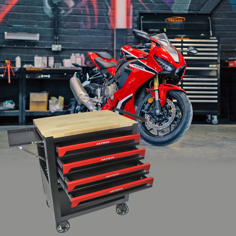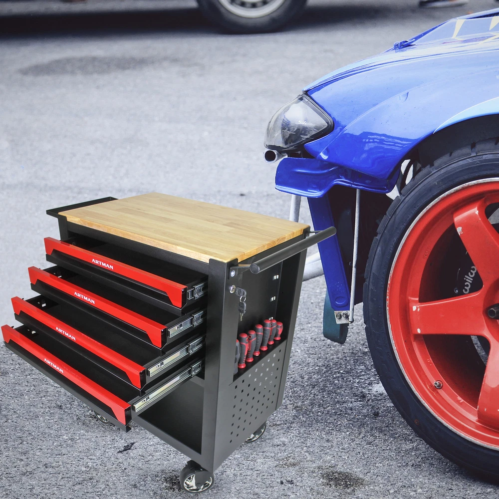 Package Size Length (in.): 25.80 Width (in.): 19.00 Height (in.): 30.70 Weight (lbs.): 100.00 Product Features Garage Organizer Cart with 4 Drawers Tool Chest High Capacity Large Storage Cabinet Adjustable Shelf, for Warehouse, Workshop 4 drawer utility vehicle with wheels and wooden top Holding Panel Both side have holding panel can handle hooks Five Inch Heavy Duty Wheels Two universal wheels with break, two fixed wheels Adjustable Shelf This shelfs can been folded Ball Bearing Slide 45 KG loading capacity ball bearing slide Product Information Product Name 4 Drawers Heavy Duty Tool Trolley with Adjustable Shelf Material Metal Product Size 35.4*26.9*17.9 inch Side of the Drawer 20.9*15.7*2.2 inch Size of the Shelf 7.9*12.2*0.6 inch Weight of the Product 42.3KG Thickness of the Metrial 0.6~0.8MM Loadding Capacity 300KG Number of Carton 1