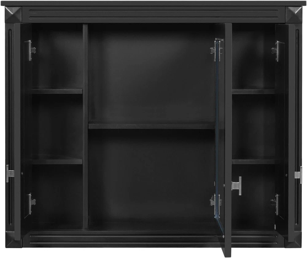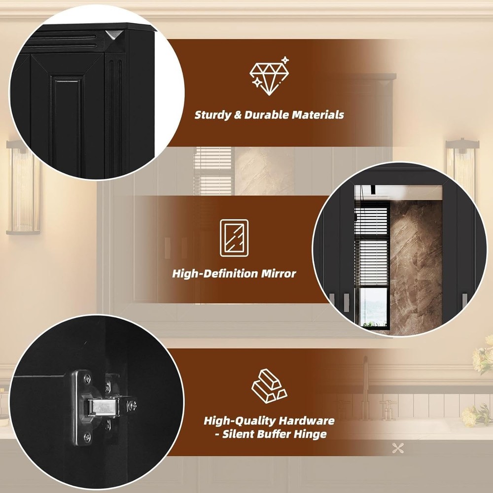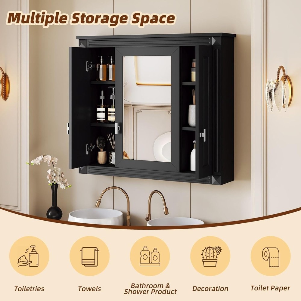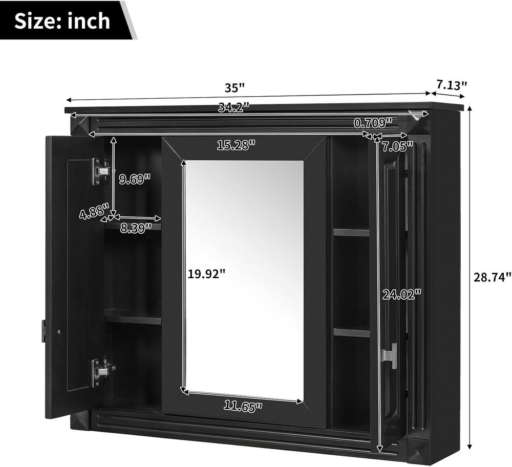 Product Description About this item AMPLE STORAGE SOLUTION - This 35" x 7.13" x 28.74" wall-mounted bathroom mirror cabinet provides generous storage space with 3 doors (1 mirrored) and 5+ shelves, perfect for organizing toiletries, medicines, and bathroom essentials without taking up floor space VERSATILE 2-IN-1 DESIGN - Features a high-definition mirror for daily grooming plus hidden storage compartments, allowing you to store personal items while maintaining a clean, organized bathroom appearance. Mount above toilet or sink for maximum functionality CUSTOMIZABLE ORGANIZATION - Interior shelves adjust up to 3 inches in height to accommodate items of various sizes, from tall bottles to small toiletries. The storage design helps optimize your bathroom space efficiently PREMIUM CONSTRUCTION - Made from high-quality MDF with a waterproof painted finish that resists bathroom humidity. Silent buffer hinges ensure smooth, quiet door operation with a weight capacity of up to 300 lbs overall MODERN MINIMALIST AESTHETIC - Sleek black finish and clean lines complement any bathroom decor from contemporary to transitional styles. Easy installation with all necessary hardware included and clear illustrated instructions Specifications: -Main Color: Black -Main Material: MDF -Mount Type: Wall Mounted -Cabinet Finish Type: Painted -Cabinet Features: Adjustable Shelves -Use Case: Bathroom -Product Dimensions: Assembled Length (in.):35 Assembled Width (in.):7.13 Assembled Height (in.):28.74 -Product Weight (lbs.):41.89 -Material:Cabinet: MDF+Solid Wood(Pine)/ Handle (iron) -Capacity: Overall: 300lbs/ Panel:50lbs -Assembly Required: Yes 1. The color of the actual product may differ from the image due to the lighting or the monitor’s display. 2. Manual measurement has been used; there may be some reasonable error. Package includes: 1 x Medicine Cabinet