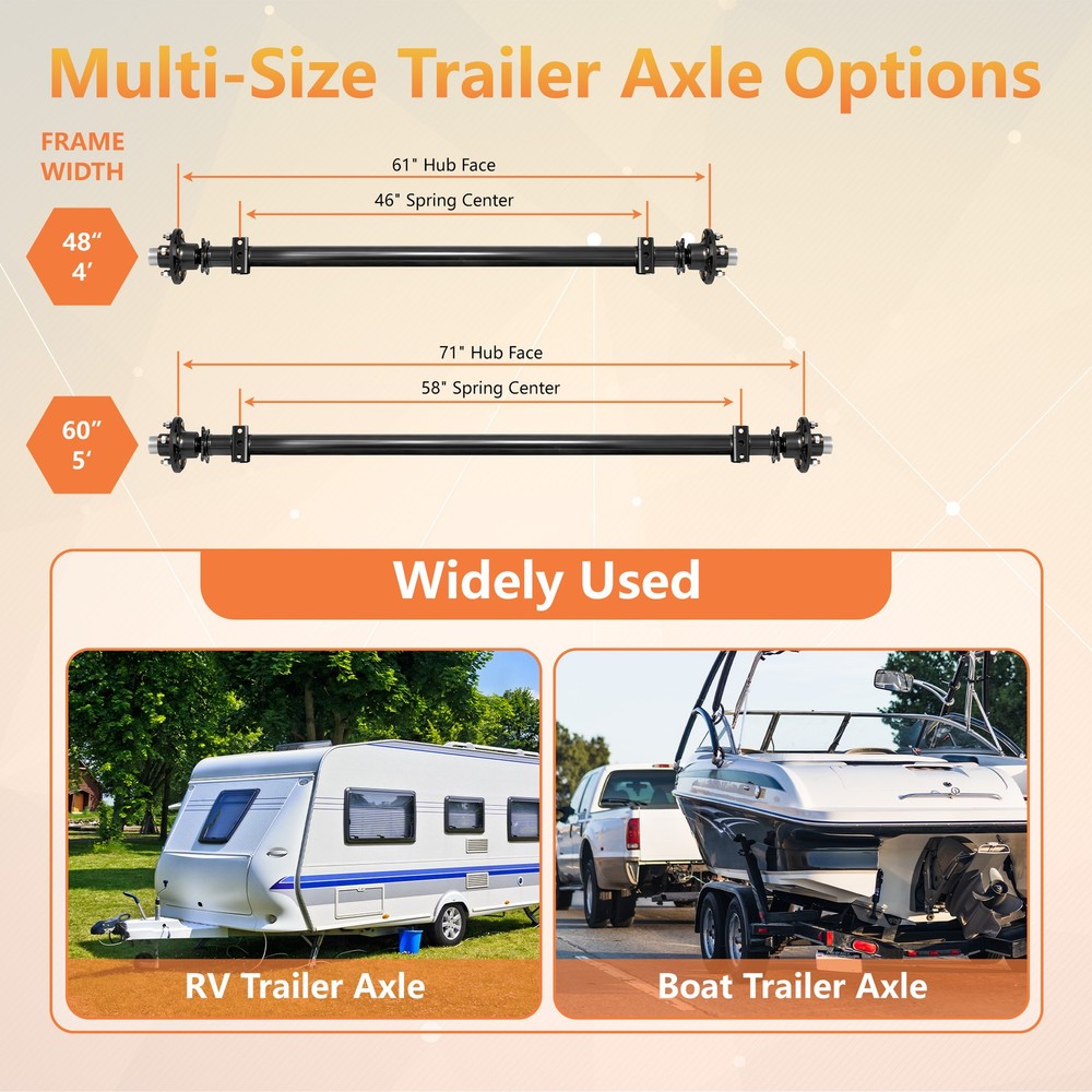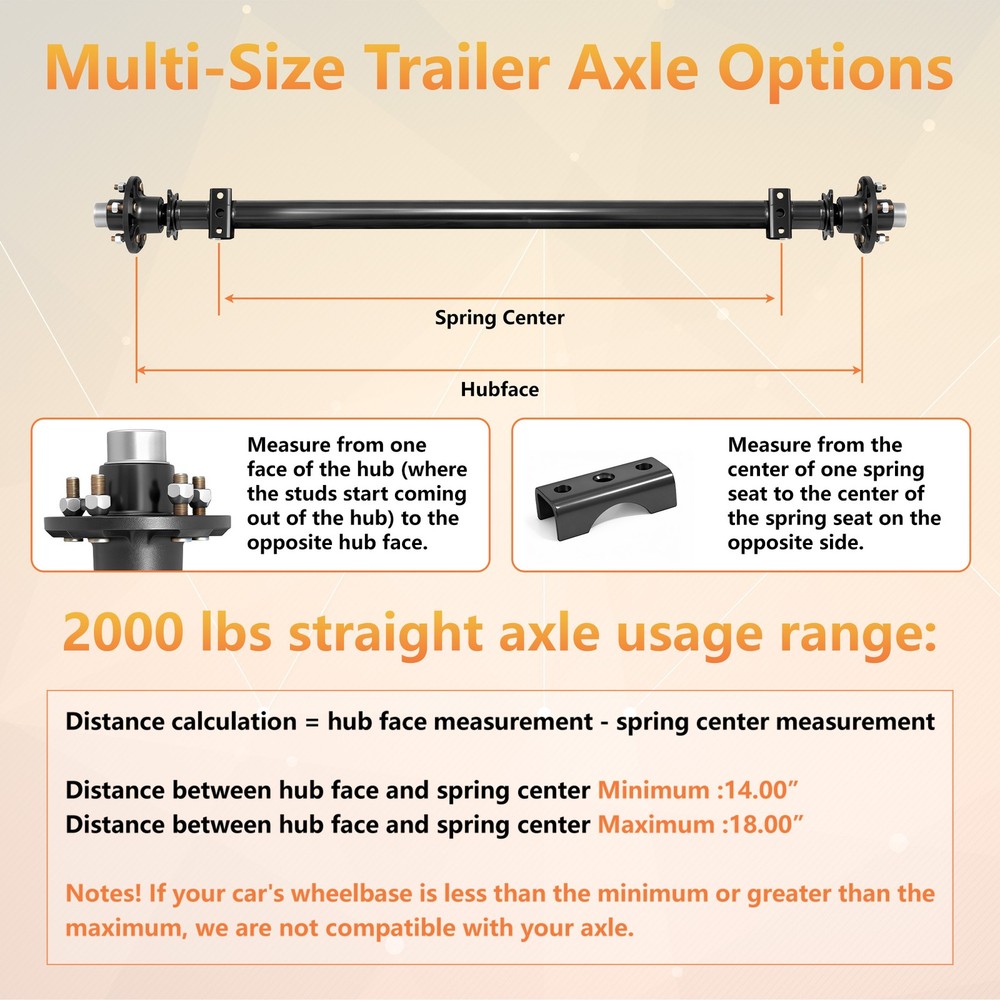 Store Home Hot Items Add to FAS Feedback Contact us STORE CATEGORIES Tools & Accessories NEWSLETTER Add my Store to your Favorites and receive my email newsletters about new items and special promotions! USER SERVICE 3.5K Idler Axle: 5-Lug 5x4.5/5x5, 61"-95" Hubface, Dexter Compatible DESCRIPTION 2000 lbs Trailer Axle Kit - Choose 4-Lug or 5-Lug Hub Configurations This heavy-duty trailer axle is built to handle a range of light-duty hauling needs. With a 2000 lb capacity, it’s the reliable backbone for your next trailer build or repair. Key Features & Specifications: Hub Face Measurement: 61″ — measured from one hub face (where studs emerge) to the opposite hub face. Spring Center Measurement: 46″ — from the center of one spring seat to the center of the other. Two Hub Options Available: Option 1: 4-Lug hubs with a 4″ bolt circle Option 2: 5-Lug hubs with a 4.5″ bolt circle Please select your preferred configuration during checkout. Wide Compatibility: Ideal for many light trailer applications including: Boat trailers Car & ATV trailers Motorcycle & cargo trailers Lawn & landscape equipment trailers Enclosed and RV trailers What’s Included: 1 x 2000 lb capacity trailer axle 2 x Hubs (specify 4-lug or 5-lug) All necessary bearings and seals We’re here to help! If you have any questions after receiving your axle kit, feel free to contact us for support. SHIPPING PAYMENT RETURN CONTACT US FEEDBACK SHIPPING 1.Order before 3:30 pm CST ship in the Same Day . Please make sure entering correct payment and shipping information before checking out. Once your payment is completed, we are not going to accept any more changes to your order. 2. All domestic orders will be shipped via USPS,or Fedex from our US warehouse. . 3. Local pick up is available for all of our items. PAYMENT We accpet all major credit card and PayPal payments. RETURN All items purchased through PRIME-CARPARTS support 6 MONTH WARRANTY. If items purchased through PRIME-CARPARTS within 30 days that have not been installed can be returned for refund. Please email customer service and ship your order to the our address. Once we receive the return it will be inspected and the refund will be processed. CONTACT US We are committed to achieving 5 star ratings. We will try our best to resolve any kind of issue. Please contact us directly if you are not 100% satisfied or to confirm fitment of the items prior to ordering. FEEDBACK We strive for 100% customer satisfaction! FEEDBACK IS VERY IMPORTANT TO US. We request that you contact us immediately BEFORE you give us neutral or negative feedback, so that we can satisfactorily address your concerns. ESTIMATES We are the service that estimates fairly the issues with the car and gives you the precise help you need to make your car safe! TRUSTED Lots of satisfied clients return to our certified service to get preventative maintenance or get help from our skilled car mechanics! GUARANTEES We guarantee the quality of the work performed. That’s why we’re ready to solve any problem that arose again for free! Prime-Carparts Copyright Premium Car Parts . All Rights Reserved 2000 lbs Trailer Axle Kit - Choose 4-Lug or 5-Lug Hub Configurations This heavy-duty trailer axle is built to handle a range of light-duty hauling needs. With a 2000 lb capacity, it’s the reliable backbone for your next trailer build or repair. Key Features & Specifications: Hub Face Measurement: 61″ — measured from one hub face (where studs emerge) to the opposite hub face. Spring Center Measurement: 46″ — from the center of one spring seat to the center of the other. Two Hub Options Available: Option 1: 4-Lug hubs with a 4″ bolt circle Option 2: 5-Lug hubs with a 4.5″ bolt circle Please select your preferred configuration during checkout. Wide Compatibility: Ideal for many light trailer applications including: Boat trailers Car & ATV trailers Motorcycle & cargo trailers Lawn & landscape equipment trailers Enclosed and RV trailers What’s Included: 1 x 2000 lb capacity trailer axle 2 x Hubs (specify 4-lug or 5-lug) All necessary bearings and seals We’re here to help! If you have any questions after receiving your axle kit, feel free to contact us for support. On Nov 25, 2025 at 02:06:35 PST, seller added the following information: