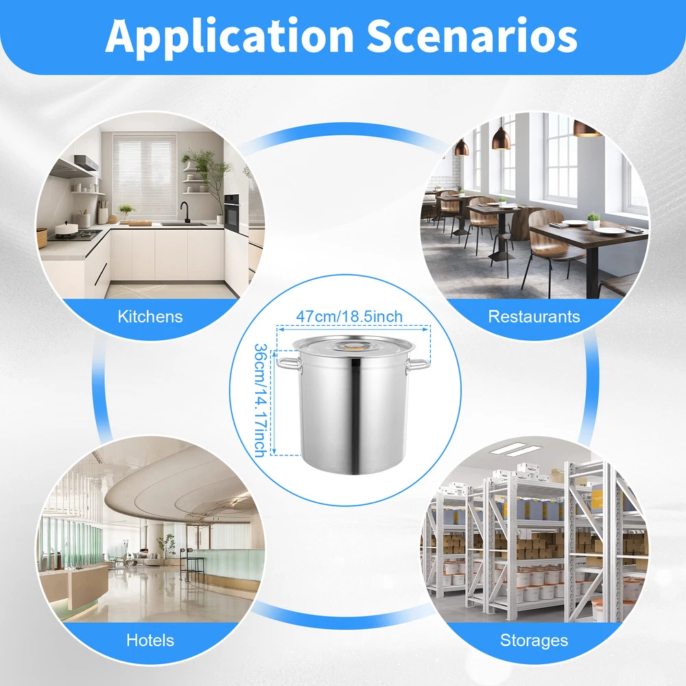Description This exquisite and timeless stockpot is meticulously crafted from premium 201 stainless steel, embodying an ideal fusion of durability and culinary elegance. The pot's versatility is exemplified by its ability to accommodate both solid and liquid fare, transcending the boundaries of conventional cookware. It seamlessly transitions from simmering hearty stews brimming with tender vegetables and succulent meats, to gently boiling aromatic broths teeming with delicate herbs and spices. Indeed, it is a culinary chameleon, adapting flawlessly to a myriad of gastronomic scenarios. Key Feature Durable & Sturdy: The 201 stainless steel body with a thickness of 1.2mm offers durability and sturdiness for this product. Large Capacity: It measures 14.76*14.17 inches with a large 35L/9.25Gal Stock Pot Stainless Steel Large Kitchen Soup Big Cooking Restaurant Welcome to our store~ Description This exquisite and timeless stockpot is meticulously crafted from premium 201 stainless steel, embodying an ideal fusion of durability and culinary elegance. The pot's versatility is exemplified by its ability to accommodate both solid and liquid fare, transcending the boundaries of conventional cookware. It seamlessly transitions from simmering hearty stews brimming with tender vegetables and succulent meats, to gently boiling aromatic broths teeming with delicate herbs and spices. Indeed, it is a culinary chameleon, adapting flawlessly to a myriad of gastronomic scenarios. Key Feature Durable & Sturdy: The 201 stainless steel body with a thickness of 1.2mm offers durability and sturdiness for this product. Large Capacity: It measures 14.76*14.17 inches with a large capacity of 30 Quart, fulfilling your life storage and culinary needs at once. Easy to Clean: Its anti-corrosion and smooth material with polishing treatment makes it easy to clean. It just needs to be cleaned like any other kitchenware for your convenience. Easy to Move: Our stockpot is designed with tightly welded handles on both sides of the body to make it easy to move or pour out internal items at any time and anywhere. Multifunctional: The airtight lid keeps food fresh and clean when storing, but also locks in heat to speed up cooking when making soup. Well-intentioned Design: Its bottom fits both with durability in mind because of the right thickness (0.8 mm) and also with better heat conduction and faster cooking in mind because it is designed to be slightly thinner than the barrel. Idea Gift: The stockpot is the ideal gift for cooking, and its airtight and large-capacity features are also ideal for stockpilers or caterers. Guaranteed Customer Service: Your satisfaction is our primary goal. If you have any questions about this stockpot, please feel free to contact us, and we will reply and provide the solution to you as soon as possible. Details Curling Edge: The curling edge design aims to protect you and your family members from scratches and bruises when using it. Anti-slip Grooves: The anti-slip grooves on the lid surface can prevent the lid from slipping off the bucket. Hangable Lid: The round handle on the lid hangs over the edge of the bucket, saving space and keeping the lid hygienic. Capacity Graduations: The capacity graduations inside of the stockpot help you know the capacity items that may be left. Application It is ideal for storing various liquid/solid items, such as soup, wine, rice, flour, cereals, tea, spices, etc, in hotels, restaurants, kitchens, warehouses, etc. It also can be used to cook/heat food on a variety of stoves, such as solenoid stoves, gas stoves, electric stoves, etc. Specifications Material: 201 Stainless Steel; Steel Color: Silver Style: Modern, Simple Shape: Cylinder Surface Treatment: Polishing Process; Butt Welding Number of Items: 1PC Wall Thickness: 1.2mm Bottom Thickness: 0.8mm Max Capacity: About 35L/30 Quart Lid Diameter: 37.5cm/14.76inch Gross Weight: 3.85kg/8.48lbs Net Weight: 3.05kg/6.72lbs Product Size (D*H): 47*36cm/18.5*14.17inch Package Size: 38.5*38*40.5cm/15.15*14.96*15.94inch Package Included 1*Stockpot Notes Only the stockpot is included in the package. Please allow the slight color difference caused by the shooting light and 1-3cm error due to manual measurement, and make sure you do not mind before you order. Payment Delivery details Terms of sales About us Contact us Payment We accept ebay payment 。 Fees such as import duties, taxes are not included in the item price or shipping costs. These charges are the buyer's responsibility. Delivery details Shipping: 2-9 working days to: USA Terms of sales We maintain high standards of excellence and strive for hundred percent customer satisfaction. Feedback is very important to us. We hope that you contact us immediately before you give neutral or negative feedback, so that we can address your concerns. It is impossible to address issues if we do not know about them! About us Your satis faction is our ultimate goal. We work hard to earn your trust and future business. Our certified technicians have tested each item before shipping. The unit comes with 1 year limited warranty on all manufacturing defects. a) If you receive a defective item, you may return it or ask for a discount. Please contact us within 14 days after you receive the package. b) What you returned must be intact and in its original packaging as re? u. Customer is responsible for shipping costs of the returned item. c) We will cover the cost of shipping back t with the shipping rate indicated in the registration page. We will send you a new unit or refund the full payment you paid. Thank you. Contact us Business Hour Business Hour: Monday To Friday: 8:30 AM to 5:00 PM (Beijing China time) Due to time zones, our reply to your questions may not be immediately. But within above working time, we will reply your email within 24 hours. If it's non-workdays, please kindly be patient and wait till Monday. Please contact us with ebay message. Please feel free to contact us i