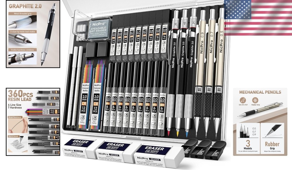 35PCS Art Mechanical Pencils Set, 3 PCS Metal Drafting Pencil 0.5 mm & 0.7 mm & ‹ › ‹ › ‹ › ‹ › ‹ › ‹ › ‹ › ‹ › ‹ › 35PCS Art Mechanical Pencils Set Unleash your creativity and elevate your artistic endeavors with our meticulously crafted 35PCS Art Mechanical Pencils Set. Tailored for artists, students, and professionals alike, this comprehensive set offers the precision, comfort, and versatility needed for all your writing, drafting, and sketching projects. Product Includes: 6 PCS of premium drafting pencils in 0.5mm, 0.7mm, and 2.0mm sizes. 20 tubes of lead refills: 0.5 mm, 0.7 mm, 0.9 mm, 2.0 mm. 6 hardness leads (2B, HB, 2H, 4H, 4B, 6B) for diverse line quality. 3 pcs 4B erasers and 1 kneaded eraser to ensure your artwork can be easily corrected. 18 pcs of cap eraser refills for ongoing precision. 2 pcs lead sharpeners for on-the-go convenience. A stylish and functional storage case to keep everything organized. Distinctive Features: Four line sizes and six hardness lead options to create a vast spectrum of effects. The full-metal body ensures optimal weight balance, promoting a fatigue-free experience during extended use. Incorporates a sharpener in the cap of the 2.0 mm mechanical pencil for ultimate convenience. Two types of anti-slip grips: Rhombus textured rubber for comfort, and metal threaded for superior support. Why Choose Our Mechanical Pencils Set? Crafting with our 35PCS Mechanical Pencils Set transforms the ordinary into extraordinary. Each pencil boasts a robust design to withstand the rigors of daily art and drafting tasks. The variable lead sizes and hardness levels empower artists and professionals to execute their vision with precision. The ergonomic design and unique grip features ensure a seamless writing experience, whether you are sketching, drafting, or completing assignments. This set is not just a tool— it's an essential companion for your artistic journey. Whether for educational purposes or as a thoughtful gift for aspiring artists or seasoned professionals, our Art Mechanical Pencils Set makes a lasting impression. Order yours today and embrace the art of precision! Shipping Free & Fast Shipping - We offer free shipping to most of the USA with a normal delivery time of 3-7 days. However, due to the current situation, additional delivery time (up to 3 weeks) may be required for some items. Alternative Carriers - We may use alternative carriers (e.g. USPS, FedEx, UPS, etc.) to ensure your package arrives safely and on time. Due to the use of multiple carriers, we are unable to provide a tracking number automatically. Handling Time - Orders are processed and shipped within 1-2 business days of receiving cleared payment. Shipping Restrictions - Shipping to Alaska, Hawaii, Puerto Rico, Guam, and other US territories may incur shipping charges or delivery restrictions. Please contact us before ordering, or your order can be refunded/cancelled. State Restrictions - There may be restrictions based on your state of purchase. For example, certain items may not be shipped to California due to state regulations. Contact for Tracking Updates - If you require tracking updates or have any concerns about the delivery of your order, please feel free to contact us, and we will be happy to assist you. Return 30-Day Hassle-Free Returns - We want you to be completely satisfied with your purchase. If you are not, you can return the item within 30 days of receiving it for a full refund or exchange. Easy Return Process - To start a return, simply contact us and we will provide you with a prepaid return shipping label and detailed instructions. Restocking Fee - There are no restocking fees for returns. However, the buyer is responsible for return shipping costs if the return is not due to a seller's error. Refund Processing Time - Refunds will be processed within 5 business days of receiving the returned item in its original condition. Payment We accept all major credit cards, PayPal, and Apple Pay for your convenience. Your payment information is secure and encrypted to ensure a safe and seamless transaction. Please complete your payment within 3 days of purchase to avoid any delays in shipping. Feedback Your feedback is extremely important to us. We strive to provide the best products and customer service possible. If you are satisfied with your purchase, please take a moment to leave us a positive review. If you have any concerns or issues with your order, please contact us before leaving negative feedback. We are committed to resolving any problems and ensuring your satisfaction. Contact Us If you have any questions or concerns, please feel free to reach out to our customer support team. You can contact us through the eBay messaging system. We are available Monday to Friday, 9:00 am to 5:00 pm EST, and we will do our best to respond to your inquiry within 24 hours. Buy it now and enjoy a pleasant shopping experience! Closure: Retractable Writing Instrument Form: Mechanical Graphite Pencil Color: Black Item model number: MP1000 Manufacturer Part Number: MG599 Material Type: Metal Product Dimensions: 8 x 6 x 0.7 inches Pencil Lead Degree (Hardness): HB Line Size: 0_5mm Grip Type: Knurled Ink Color: Black Manufacturer: NICPRO CO.,LTD Age Range (Description): Adult Number of Items: 9 Item Weight: 13.7 ounces Features: Dual Clutch,metal drafting pencil,mechanical pencil set,lead holder,lead refills,erasers,sharpeners,color lead,storage case,fatigue-free design,sharpener in cap,anti-slip grip Brand: Unbranded Lead Diameter: 0.5 mm Material: metal Type: Drafting Pencil Lead Grade: Not Set Country/Region of Manufacture: Not Set Vintage: Not Set