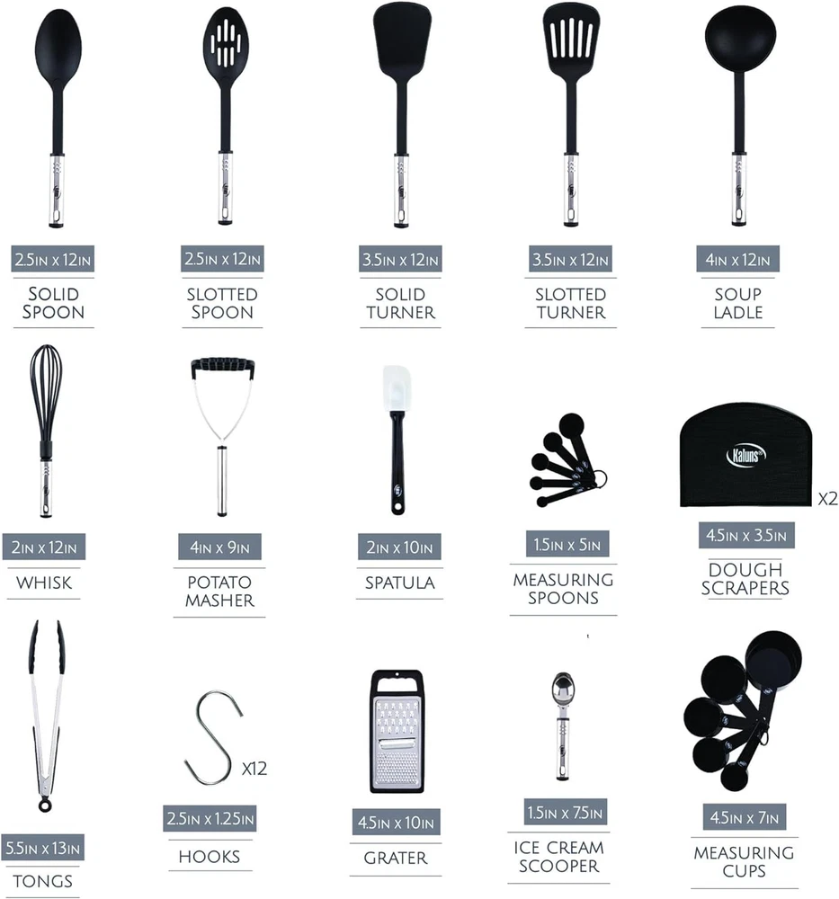 KALUNS KITCHEN UTENSIL SET: Our utensil set have everything you need for a perfect cooking experience! Kaluns kitchen gadgets and accessories are made of a combination of nylon and stainless steel to ensure no scratching or sticking. COOKING UTENSILS SET INCLUDES: Soup Ladle, Solid Spoon, Slotted Spoon, Solid Turner, Slotted Turner, Potato Pusher, Whisk, Grater, Spatula, Tongs, Ice scream Scooper, Measuring Cups, Measuring Spoons, 2 Dough Scrapers, 12 Hanging Hooks And a Beautiful Gift Box. HIGH QUALITY KITCHEN TOOLS DESIGNED TO LAST: No more worries about melting or rusty kitchen utensils. Our high-quality kitchen gadgets are polished with a special oil to prevent it from getting rusty. They are dishwasher safe, light weight and non-stick. Heat resistant is up to 350 F/180℃. GREAT VALUE NYLON AND STAINLESS STEEL UTENSIL SET: Don't spend a fortune buying each utensil individually. Buy yourself a complete kitchen tool set. Our 35 peice high quality set has everyting you need included. It is specifically designed to help you with all your food preparations, such as whisking, peeling, cutting, stirring, mixing, basting, baking, grilling, frying and serving up that perfect dish. GREAT GIFT IDEA: The Kaluns Kitchen Utensils set come in a classy box ready to gift! Great for House Warming gifts new home, wedding gift, mothers day, holiday and anyone else on your gift list apartment must haves, college dorm room essentials. Product Description