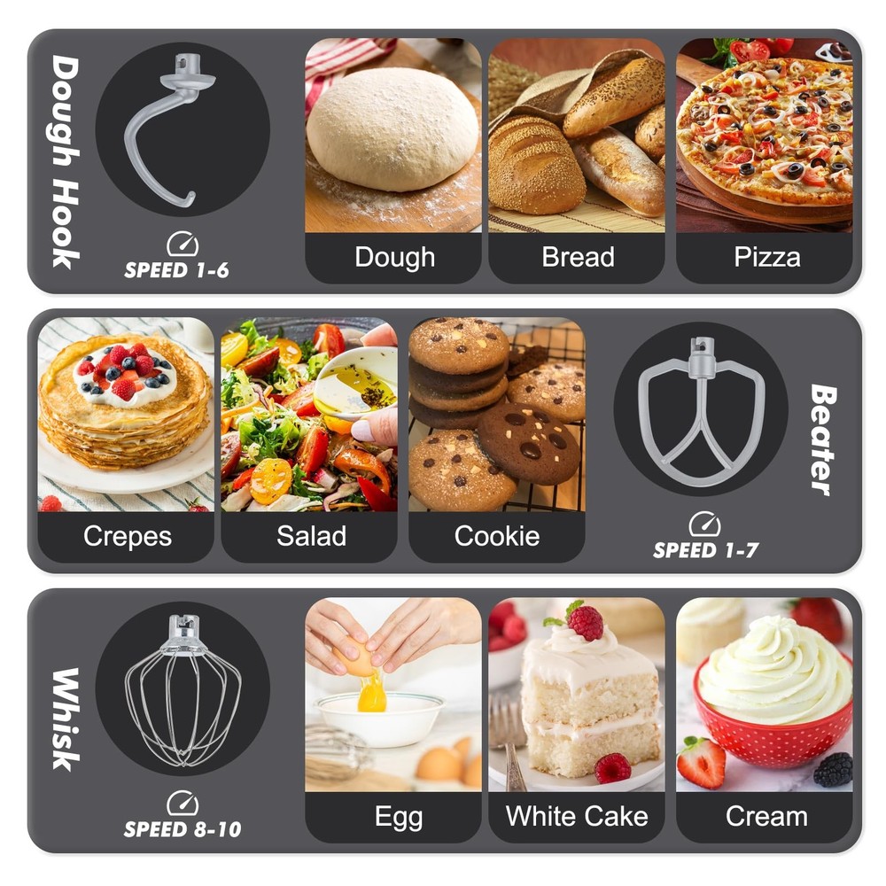 two bowls Stand Mixer,a best assistant of your kitchen.Equipped with3.5Qt Stainless steel bowl and 3.5QT mixing bowl, suitable for all your family baking need, nested bowl design can easy to storage in the cabinet,such a good helper for space-saving!Otherwise,kitchen mixer has many colors to choose,meet different aesthetic needs. As daily mixer,it is easy to operate and clean up,press the button to turn off the tilt head when mixer running,which is more safer.And transparent anti-splash lid could prevent the ingredient making a mess. This Kitchen Mixer has 10 different speed options,suitable for mixing bread dough, thick batters, meringues, and whipping cream, plus lower speeds for stirring and finessing your most delicate concoctions,could suit perfectly to different ingredients.Chassis 4 stronger suckers,can keep the machine steady and avoid moving or bounce during operation. More importantly,our electric mixer upgraded the multi attachments,aluminium dough hook and flat beater,stainless steel whisk,more sturdy and durable.And dishwasher safe. Feature 3.5Qt stainless steel bowl with dual Handles Extra 3.5QT plastic mixing bowl Planetary rotations for thorough mixing Transparent anti-splash lid without opening 10 speeds 4 anti-slip suction feet Upgraded aluminium dough hook and flat beater,stainless steel whisk Tilt-up head allows easy removing of bowl Low operation noise Parameter: 120V 60Hz 300W regular, 800W Max Package include: Machine unit Mixing beater Egg whisk Dough hook Scraping rod Anti-splash lid 3.5QT + 3.5QT Two Bowls: The small stand mixer includes a 3.5QT stainless steel bowl and a 3.5QT food-safe plastic bowl. Designed for small portions, suitable for new baker, 1-2 members family or couples, offering flexibility for different mixing and baking needs. The nesting design of the two bowls makes them easy to store. Compact Design and Matte Finish: The mini kitchen mixer weighs 5lbs with dimension 11.5*6.5*10.8 In, lightweight and easy to carry and store, which could help space-saving. Perfectly suitable for small kitchen, apartment, or limited storage space. This kitchen mixer comes in a variety of stylish colors with a sleek matte finish, adding a touch of style to any kitchen. 10 Speeds and Tilt Head Design - This small kitchen mixer has 10 different speed options,suitable for mixing bread dough, thick batters, meringues, and whipping cake cream, plus lower speeds for stirring and finessing your most delicate concoctions,could suit perfectly to different ingredients. Tilt-head design mixer allows access to install or uninstall bowls and accessories easily. Upgraded Accessories and Dishwasher Safe- Aluminium dough hook and flat beater with protection layer,stainless steel whisk are all easy to attach,more sturdy and durable. The stainless steel bowl and all accessories are dishwasher-safe for effortless cleanup. Excellent Gift and Support - The electric stand mixer is also an ideal gift for your family and friends. We have confidence in the quality of our products, if you have any questions when received or during your using, please feel free to contact us via Amazon. We provide 24/7 online after-sales service for you.