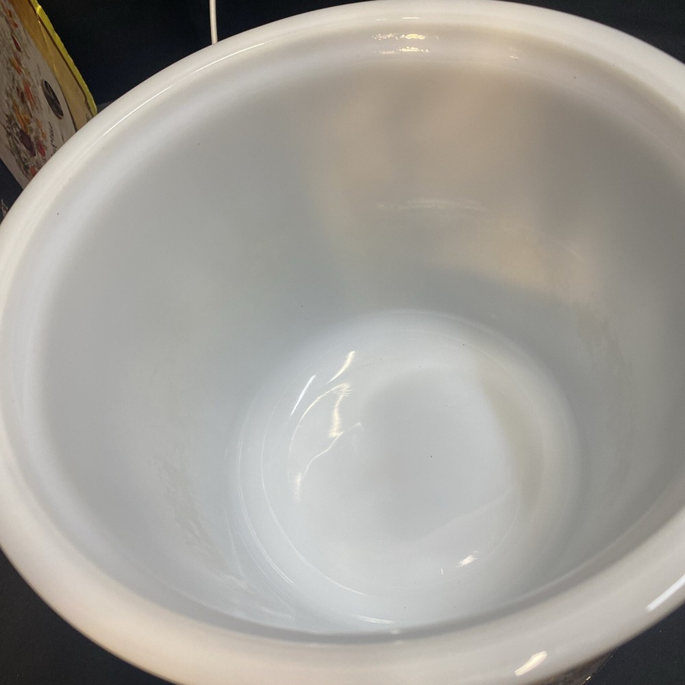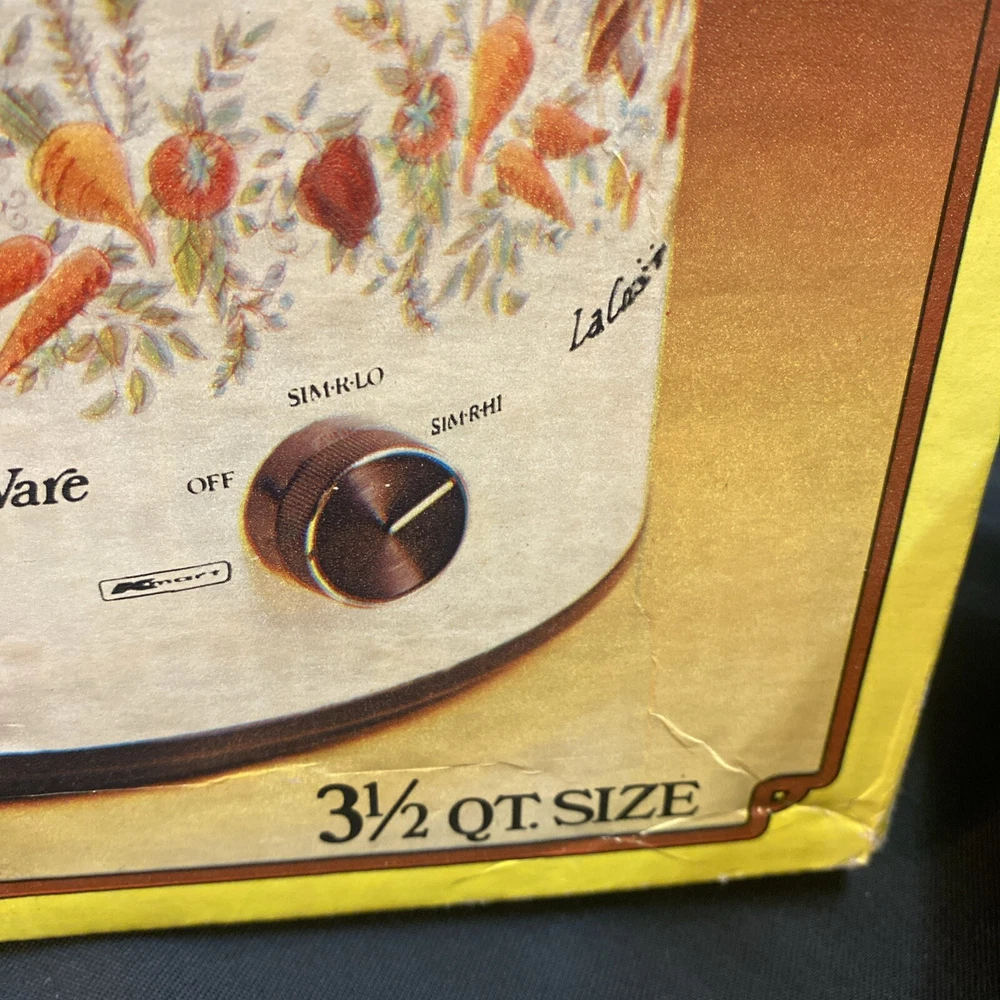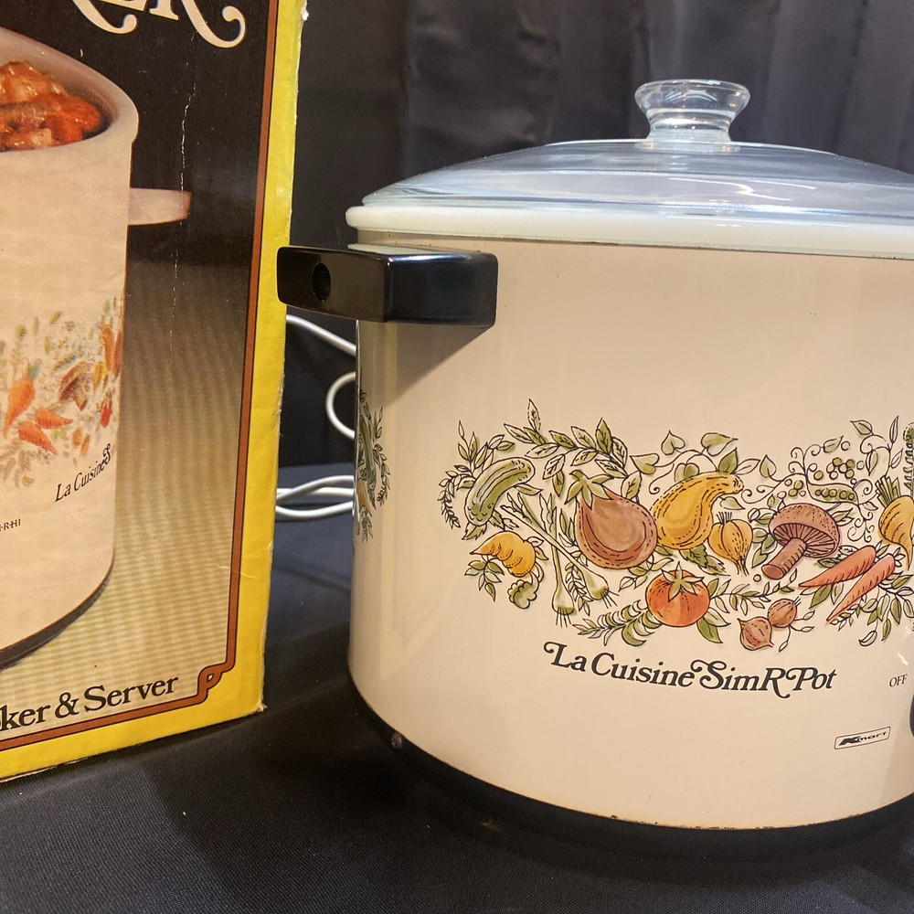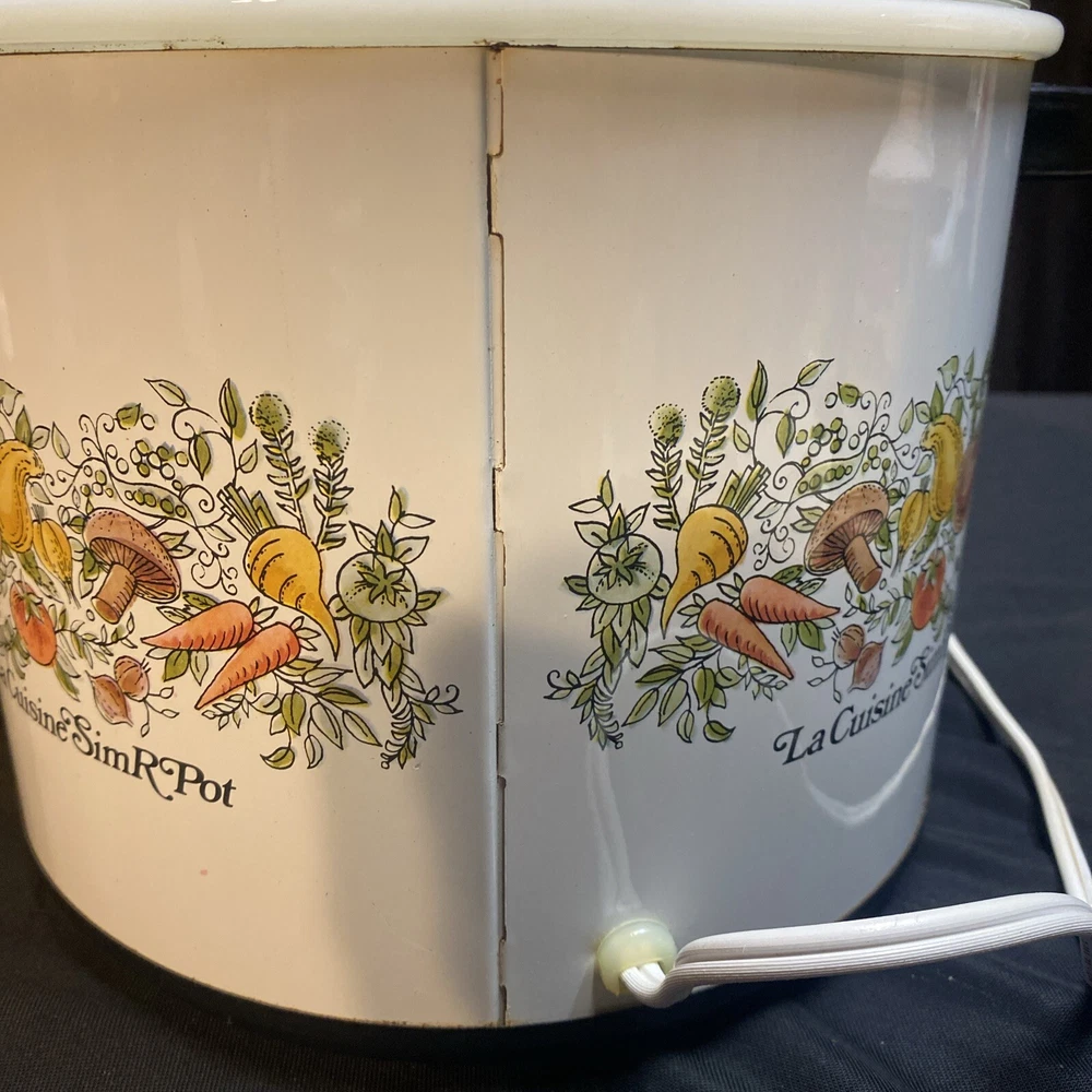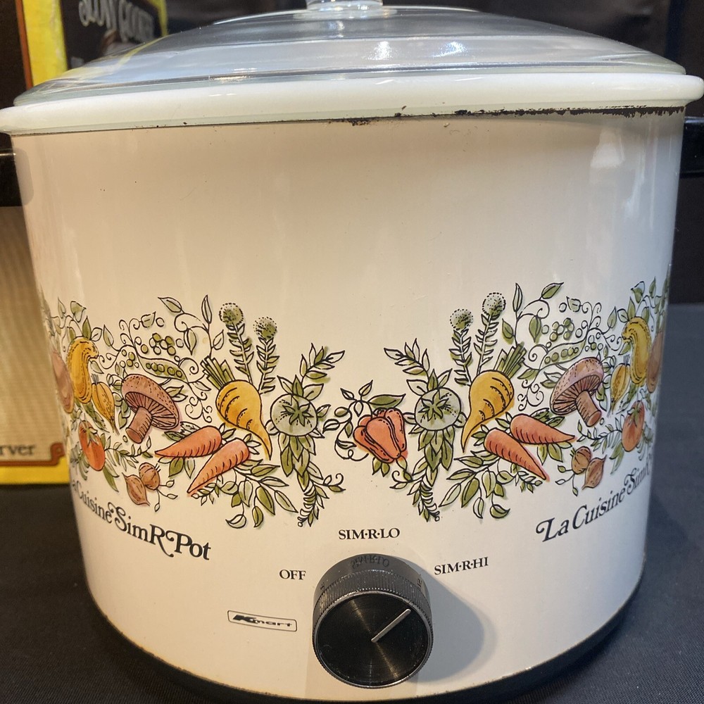 This vintage slow cooker is a must-have for any kitchen. With a 3.5 qt capacity, it's perfect for cooking up stews, soups, and more. The white milk glass material gives it a rustic look, while the veggies design adds a touch of mid-century charm. This K Mart slow cooker comes with a box and works perfectly. It's ideal for those who love to cook and want a stylish addition to their kitchen. Whether you're a beginner or an experienced cook, this slow cooker is easy to use and will save you time in the kitchen. Has some mild oxidation/wear around rim. Others in excellent condition. Works great.