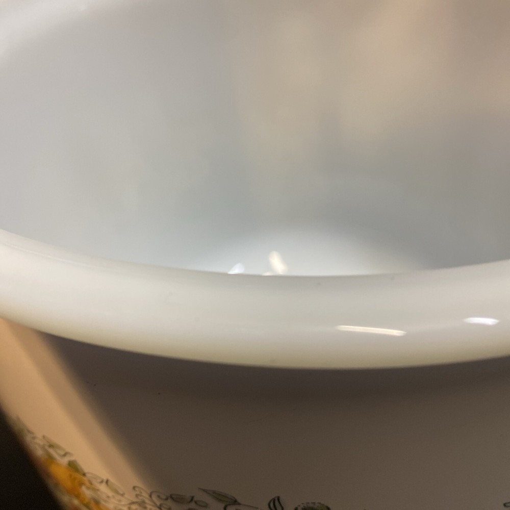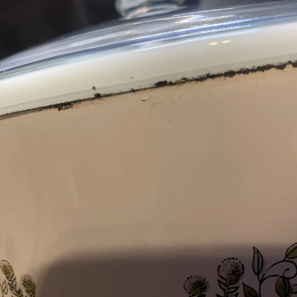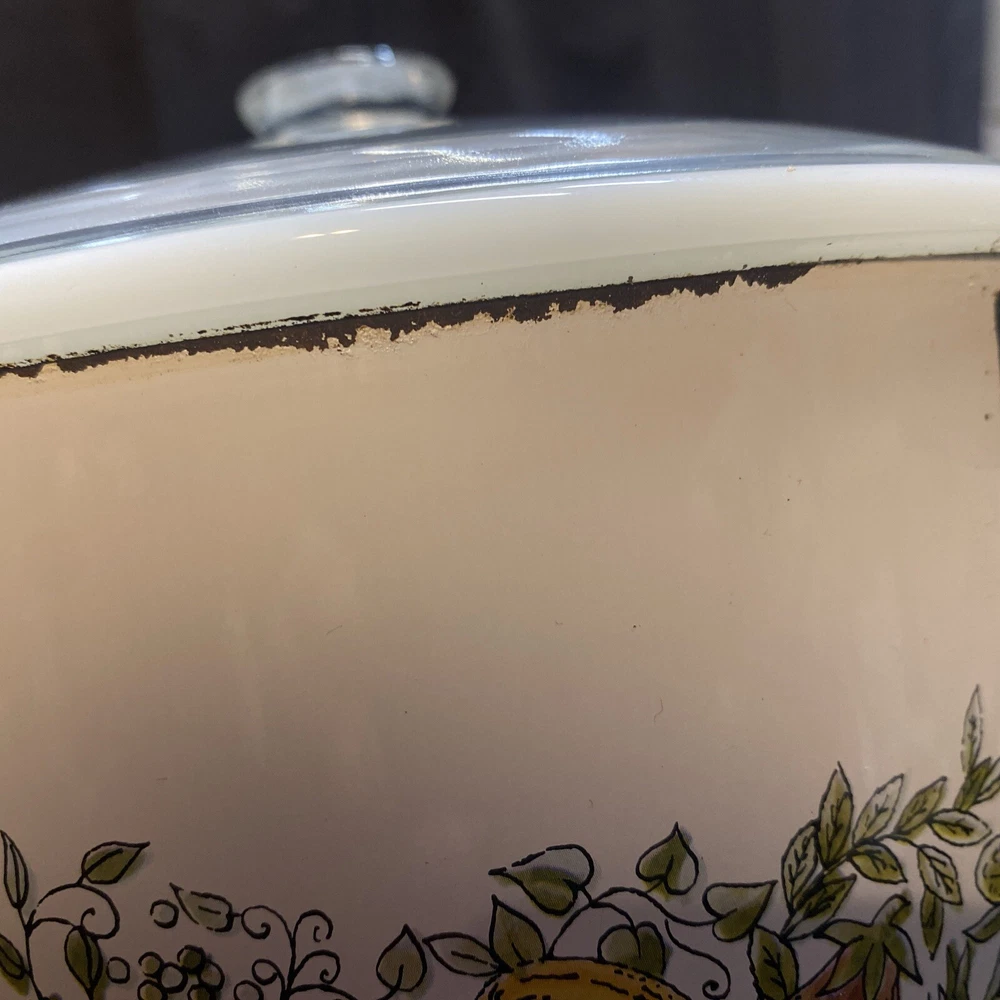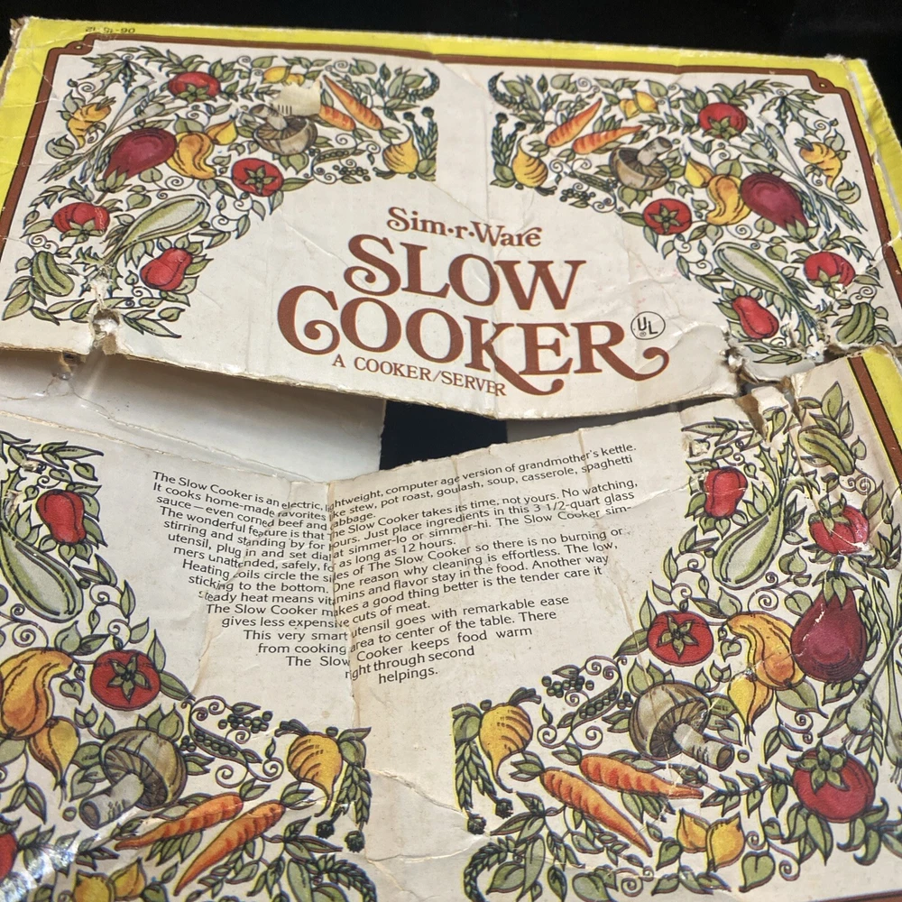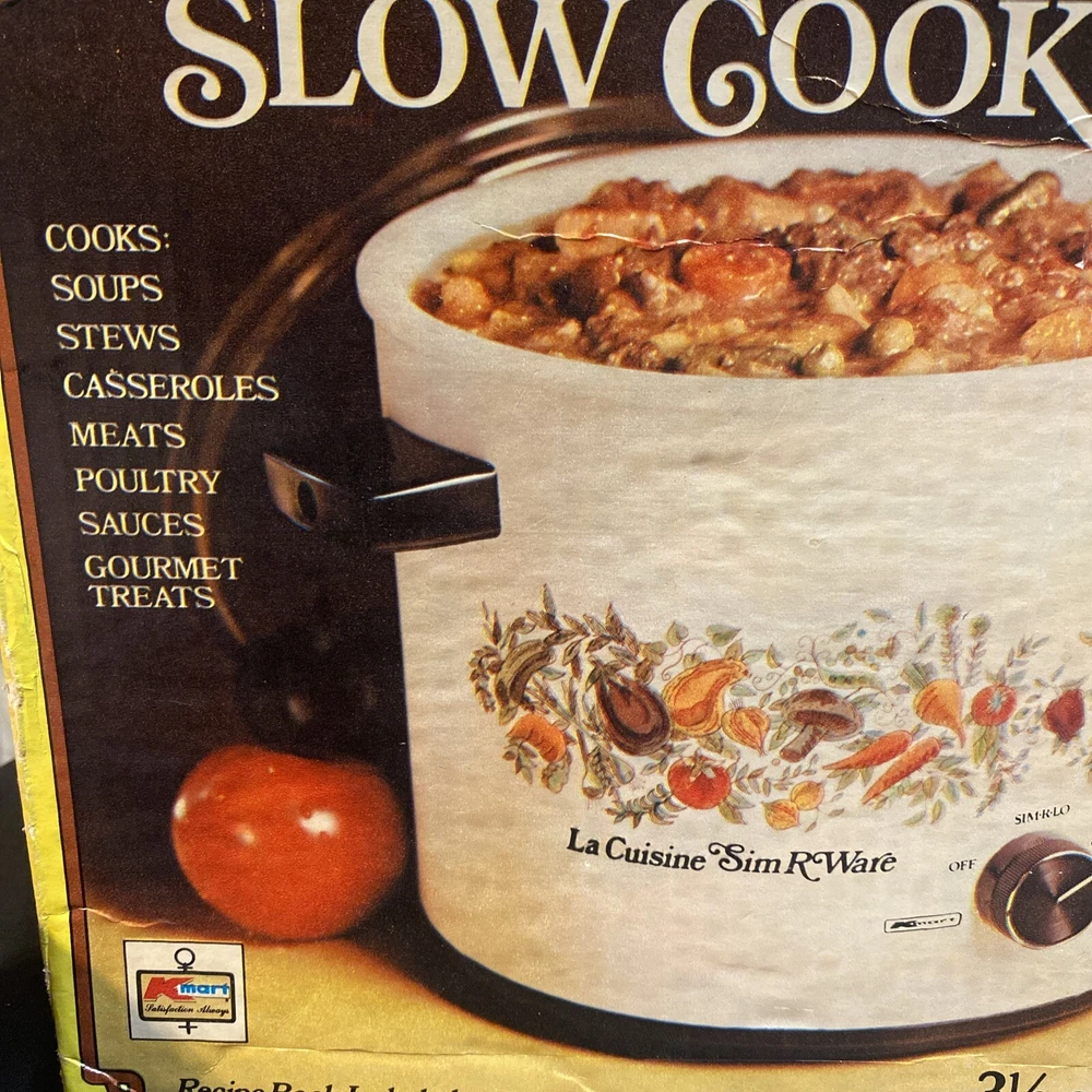 This vintage slow cooker is a must-have for any kitchen. With a 3.5 qt capacity, it's perfect for cooking up stews, soups, and more. The white milk glass material gives it a rustic look, while the veggies design adds a touch of mid-century charm. This K Mart slow cooker comes with a box and works perfectly. It's ideal for those who love to cook and want a stylish addition to their kitchen. Whether you're a beginner or an experienced cook, this slow cooker is easy to use and will save you time in the kitchen. Has some mild oxidation/wear around rim. Others in excellent condition. Works great.