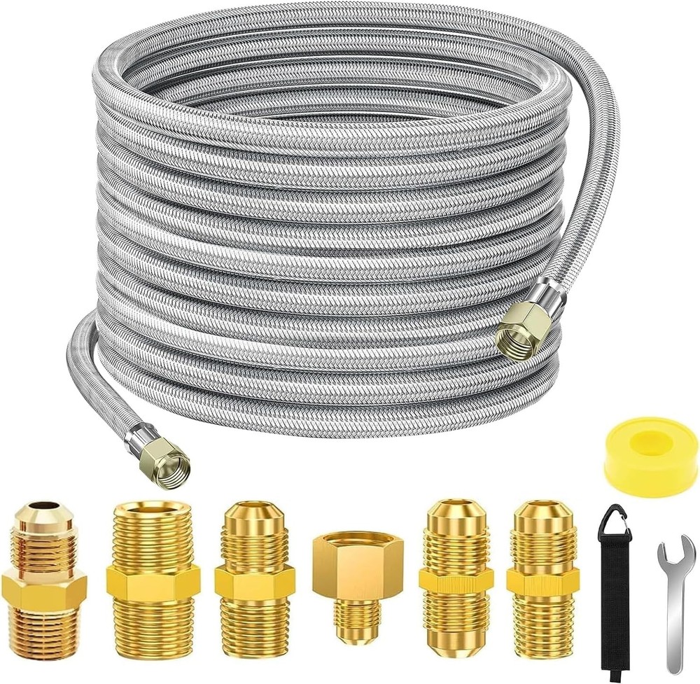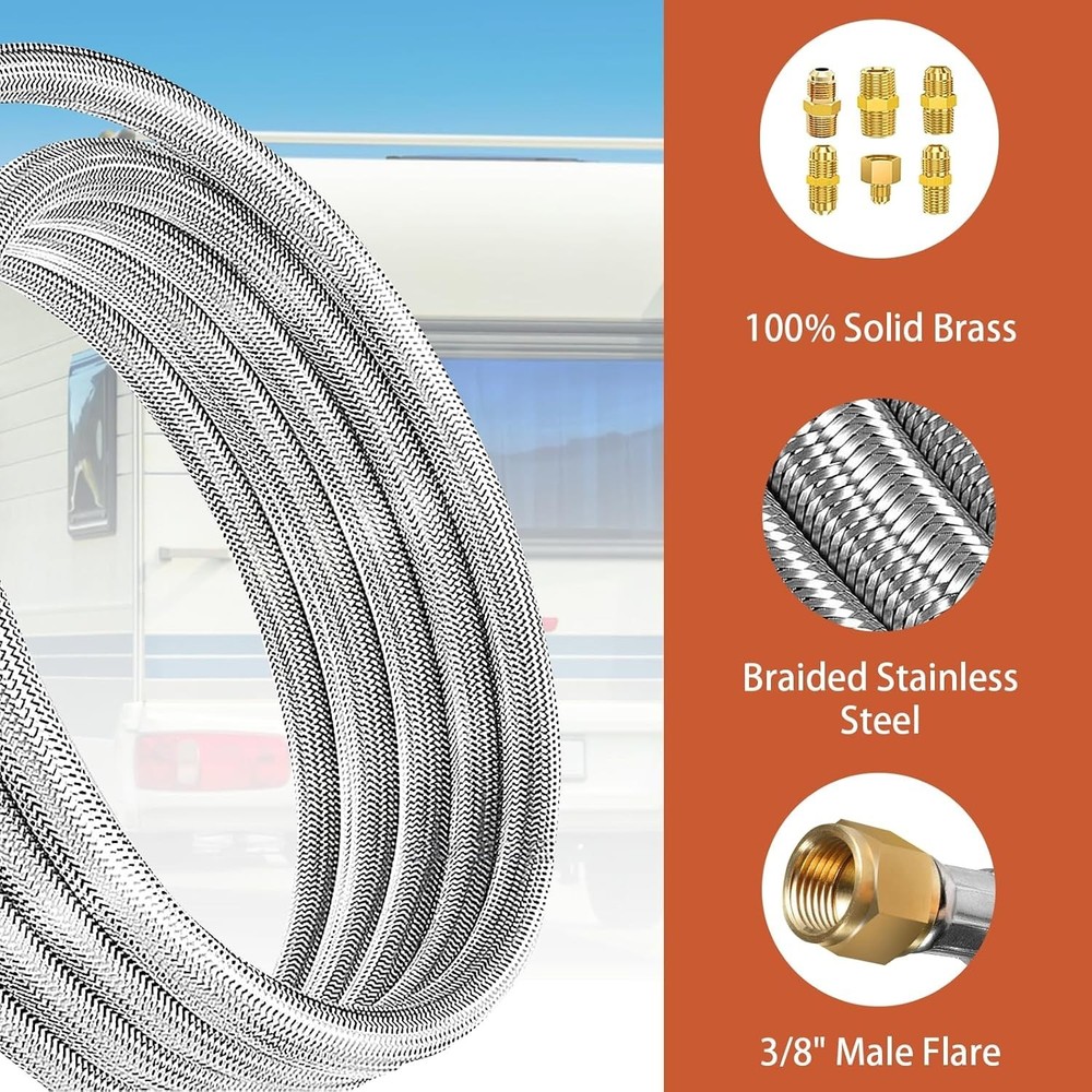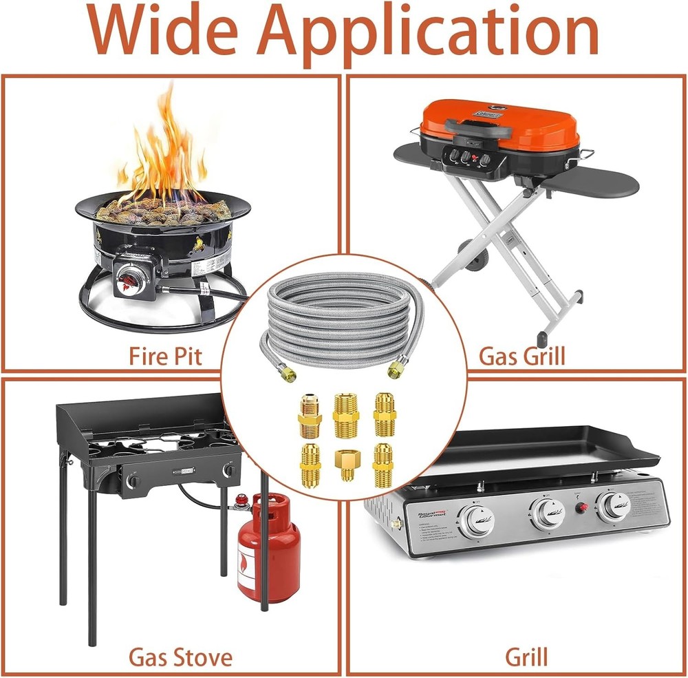 Upgrade Conversion Coupling: The propane hose extension upgrade to come with powerful 6 different couplings adapter fitting: 3/8" NPT Male x 3/8" NPT Male, 1/2" Female NPT x 3/8" Flare Male, 3/8" NPT Male x 3/8" Flare Male, 3/8" Flare Male x 3/8" Flare Male, 1/4" NPT Male x 3/8" Flare Male, 1/8" NPT Male x 3/8" Flare Male. Wide Application: This 3/8" propane conversion kit has female 3/8" ends on both sides, connecting an appliance equipped with a 3/8" male flare fitting. For extending the propane tank line on your LP appliance and fire pit table. Compatible with RV, portable fire pit, gas grill, stove, propane heater, griddle, propane smoker, propane generator, portable generator, burner, and more. Durable Construction: The propane gas line hose is made from high-quality rubber and brass fittings with 350 PSI high pressure, our propane hose extension is built to withstand the rigors of outdoor use. It is resistant to weather conditions, abrasion, and corrosion, ensuring long-lasting performance and durability. Easy and Safe Connection: This 36 FT braided stainless steel high-pressure propane hose with 6 different types of conversion coupling adapters. The propane hose extension features an easy-to-use hand-tightened swivel connector, allowing for a quick and secure connection to your propane tank or existing hose. The secure connection ensures a leak-free operation, providing peace of mind during outdoor activities. Extended Reach: Our 36 FT propane hose extension allows you to extend the reach of your propane appliances, No need to carry extra propane gas tanks, you can connect your stove/grill directly to the Low-pressure propane supply on the RV, giving you the flexibility to set up your grill, heater, or other outdoor equipment at a greater distance from your propane source.