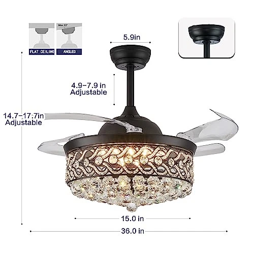 Menu 1. We require immediate payment. 2. We currently accept payment via eBay managed payments only. 3. Once payment is cleared, we will dispatch your shipment within 1-3 business days. Please refer to the "Shipping" tab for more information regarding shipping speed to your destination. 36" Modern Black Retractable Blades Ceiling Fan with Lights, Dimmable Fandeliers, Crystal Chandelier Fan Light Kit for Bedroom Kitchen Island Product description 【Ceiling Fan With Lights】The lampshade is made of K9 crystal, Make it very STUNNING, Acrylic transparent retractable ,High quality polished metal lamp body, Great choice for bedroom dining room living room. 【Dimmable Chandelier Ceiling Fan】Retractable blades ceiling fan, Dimmable fandelier crystal ceiling fans with lights and remote. Color temperature can be changed and adjusted from 2700K (Warm white) to 4500K (Daylight) and end with 6000K (Cool White). 【APP Remote Control】Control this crystal chandelier ceiling fan by using the mobile App. This APP allows for a memory function that remembers your lighting settings. Infinitely dimmable, color changeable, adjust the brightness and color you need to protect your eyes from damage. 【2-Hanging Rods&Size】Diameter 36" when retractable blades extended 15" when blades retracted, Includes two down rods, 4.9 inch and 7.9 inch for adjustable hanging with strong wind and long service life. is a professional lighting manufacturer, We provide the most abundant category of lighting products, If you are not satisfied with our products, Please kindly let us know, Enjoy your purchase. PLEASE MESSAGE US IF YOU HAVE ANY OTHER QUESTIONS, AND MANY THANKS FOR READING ALL OF THIS. Copyright ©#. All Rights Reserved.