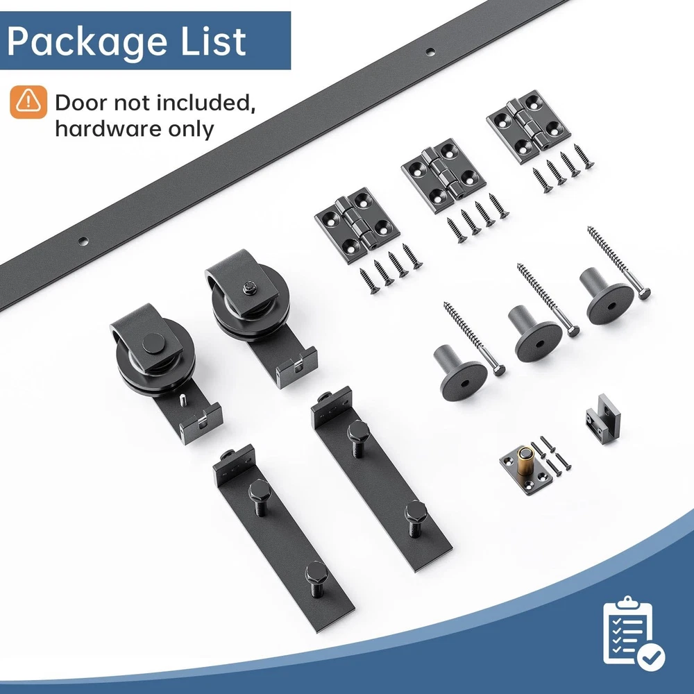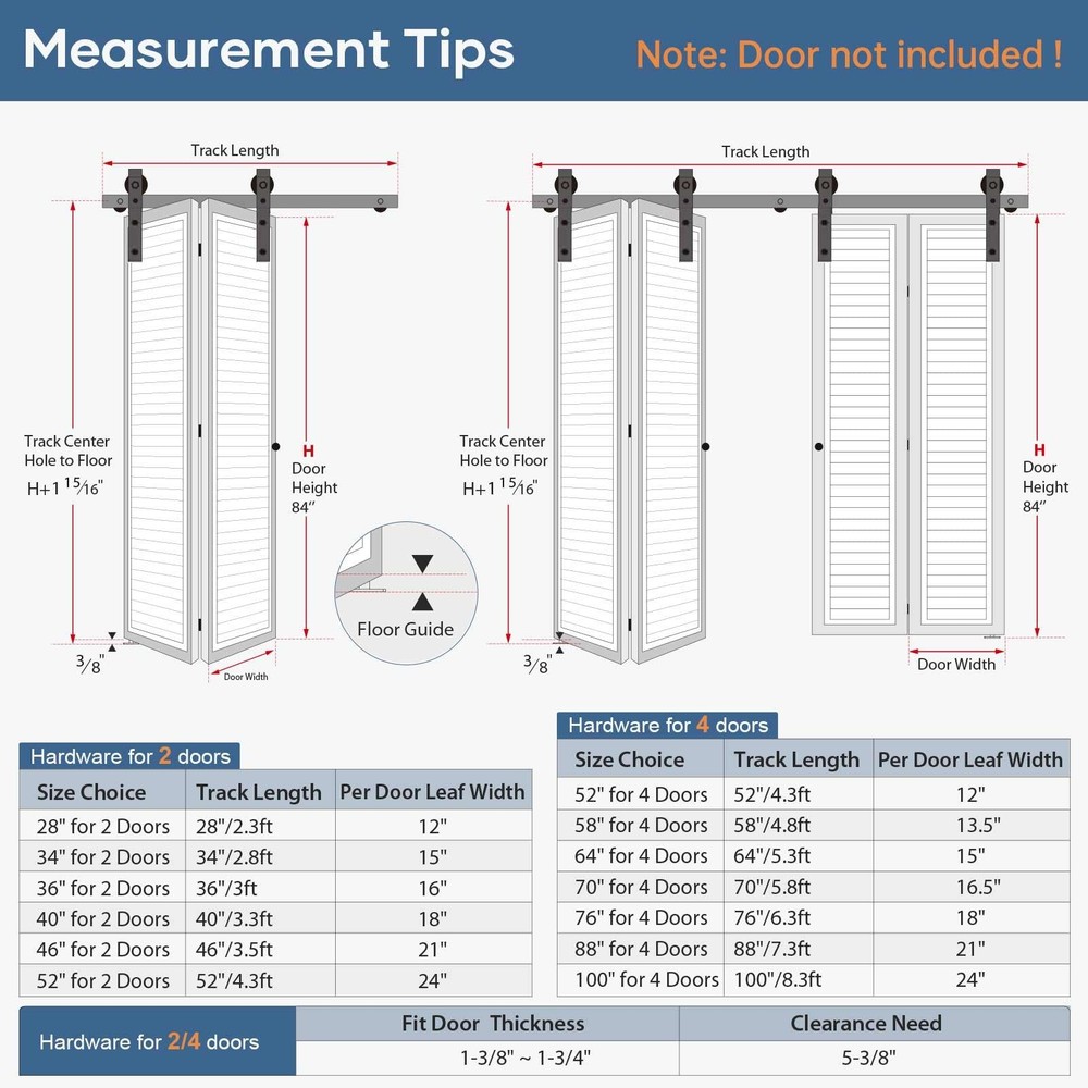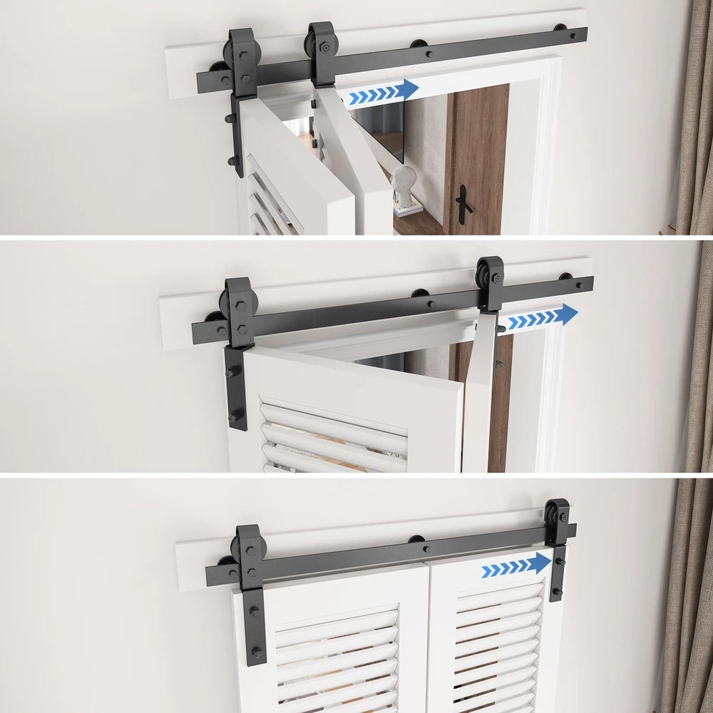 heavy-duty bifold door hardware system revolutionizes space efficiency with its innovative folding mechanism. Crafted from industrial-grade solid steel with a corrosion-resistant black powder coating, this hardware withstands daily use while maintaining its sleek appearance for years. The precision ball bearing rollers have been rigorously tested over 100,000 cycles, ensuring buttery-smooth, whisper-quiet operation that outperforms standard sliding door systems. Space-Saving: The door panel folding design takes up minimal space when opened,making it ideal for small homes,narrow hallways,or compact areas to maximize room efficiency.Can be partially or fully opened,allowing customizable ventilation and natural light control.More flexible than traditional sliding or swing doors,perfect for balconies,wardrobes,kitchen partitions,and more Smooth Gliding Like Butter: Crafted from steel with a fine black powder-coated finish,our bifold barn door hardware resists corrosion for lasting durability.Features high-precision bearing rollers tested over 100,000 cycles for buttery-smooth,silent operation-rigorously inspected for reliability Reminds: Fits up to double 16" wide bifold doors (1-3/8"~1-3/4" thickness; 180lb weight capacity). Track length = door opening + 4" (100mm). Requires 5-3/8" ceiling clearance Complete Hardware Kit: Includes 1x36" Rail,2x Rollers,2x Roller Rotating Base,1x Roller Fixator,3x Rail Support,3x Hinge,1x Floor Guide,1x Sealing Strip. DOOR NOT INCLUDED! Backed by 's 24/7 assistance,let us know for missing/defective parts,we will prompt solutions Hassle-Free Installation: Includes a step-by-step installation manual with detailed diagrams and text instructions.Get soft copy and professional installation guide from our online service