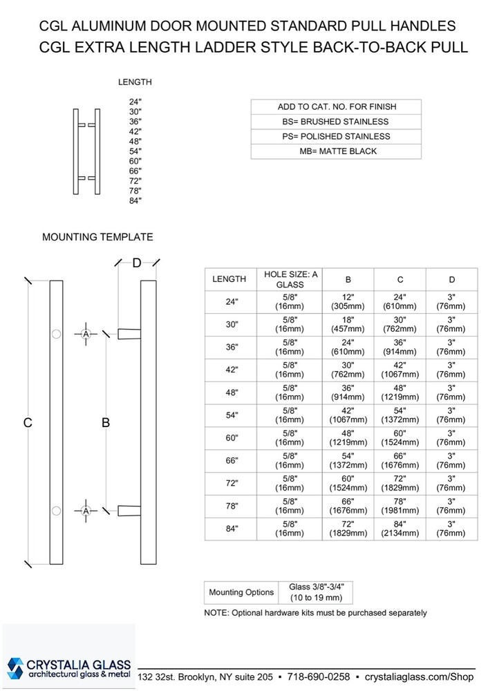 Polished Stainless 36″ Extra Length Ladder Style Back-to-Back Pull Handle Catalog Number: CG1256PS Sold By the: Each Minimum Order: 1 Each Ranging from 24" to 72" Overall Height in Several Finishes Custom Lengths, Designs, and Finishes Available on Special Made Of 304 Grade Stainless Steel Weight: 96 oz Dimensions: 36 x 6.375 x 1.25 in Metal Thickness: 2mm (12 Gauge) Glass Thickness: 3/8" to 3/4" (10 to 19mm) Thick Tempered Glass Finish: Polished Stainless Overall Length: 36" (914mm) Mounting Holes: Center-to-Center 24" (605mm) Glass Fabrication required: Two 5/8 (16mm) Diameter Holes