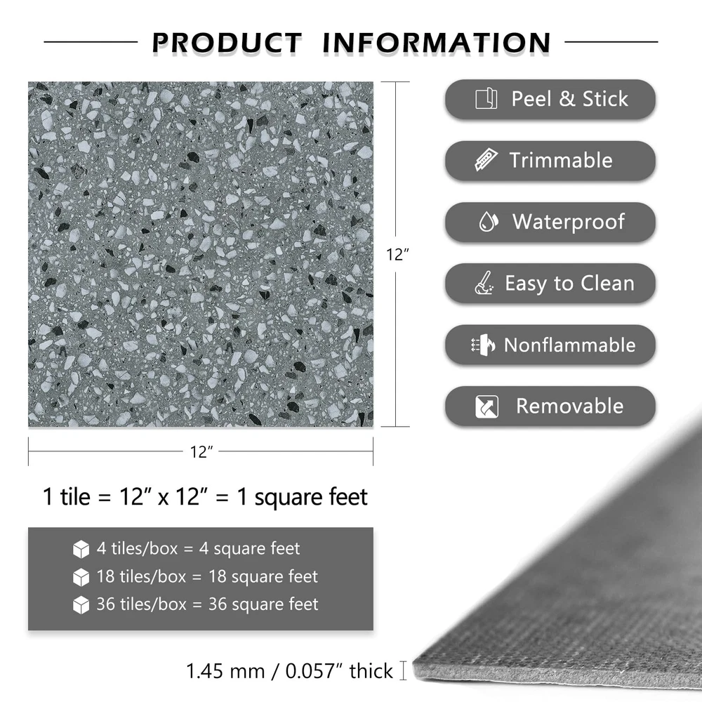 [SIZE] Length: 12 inch; Width: 12 inch [THICKNESS] 0.057 inch [MATERIAL] Vinyl Floor Tiles [COLOR] Black White Grey Peel and Stick Floor Tile [STYLE] Terrazzo Peel and Stick Floor Tile [DESIGN CONCEPT] Natural terrazzo look brings timeless charming for your floor! [ADVANTAGES] 1. Terrazzo Peel and Stick Floor Tile Waterproof: peel and stick floor tile, self adhesive floor tiles, no extra glue needed. 2. Terrazzo Peel and Stick Floor Tile Waterproof: removable floor tiles without sticky residue, great temporary flooring for renters. 3. Terrazzo Peel and Stick Floor Tile Waterproof: 12 x 12 peel and stick floor tile, vinyl floor tiles, vinyl laminate flooring, linoleum flooring. 4. Terrazzo Peel and Stick Floor Tile Waterproof: Waterproof flooring, stain resistant, moisture-proof, anti-slip, easy to clean. 5. Terrazzo Peel and Stick Floor Tile Waterproof: This peel and stick tile floor can be used as bathroom floor tile, shower floor tile, kitchen floor tile, it also can stick on bedroom floor tiles, living room floor tiles, this sticky floor tiles are suitable for dinning room, laundry, nursery, dollhouse, playroom, cubicle, farmhouse, garage, basement, attic, kitchenette, gym, dorm, classroom, apartment, office and rv flooring. [PRO TIPS] 1. Measure the size of the floor surface before purchase, buy enough rolls at one time to avoid color difference. 2. Clean the surface before pasting. The adhesion will be the best if the surface is clean, smooth, dry and flat. 3. We recommend to avoid leaving too much water on the floor tiles while cleaning within two days after installation, which helps to maintain great adhesion for a long time. ➤ SIZE & MATERIAL: Each terrazzo floor tile measures 12"x12" and 0.057" thick. 36 tiles per box, totally can cover 36 square feet. The sticky floor tiles are made of superior vinyl, wear resistant and nonflammable, safe for your family. ➤ EASY TO INSTALL: Self adhesive vinyl floor tiles, just peel and stick floor tiles to your room, readjust if you need, cut with utility knife or scissors to fit small space, no grout or special tools needed. ➤ EASY TO CLEAN: This grey terrazzo peel and stick floor tile is waterproof and washable, oil proof and stain resistant, easy to clean with a wet mop. ➤ REMOVABLE: Just remove the vinyl flooring tiles if you want. It's perfect removable floor tiles and temporary flooring for renters! ➤ MULTI-USE: Stick on floor tiles to any dry, clean and flat floor, such as for bathroom flooring, kitchen flooring, rv flooring, bedroom, living room, laundry room, dining room, basement, entryway, foyers, gym, garage, office, apartment, classroom, etc. ➤ 24/7 SERVICES: Any questions about peel and stick floor tiles, please feel free to contact us or "Ask a Question". Get the gray terrazzo tiles for floor, and start to enjoy your DIY time!