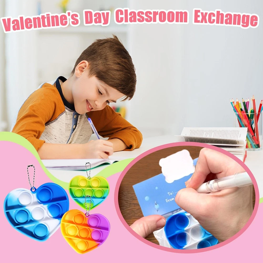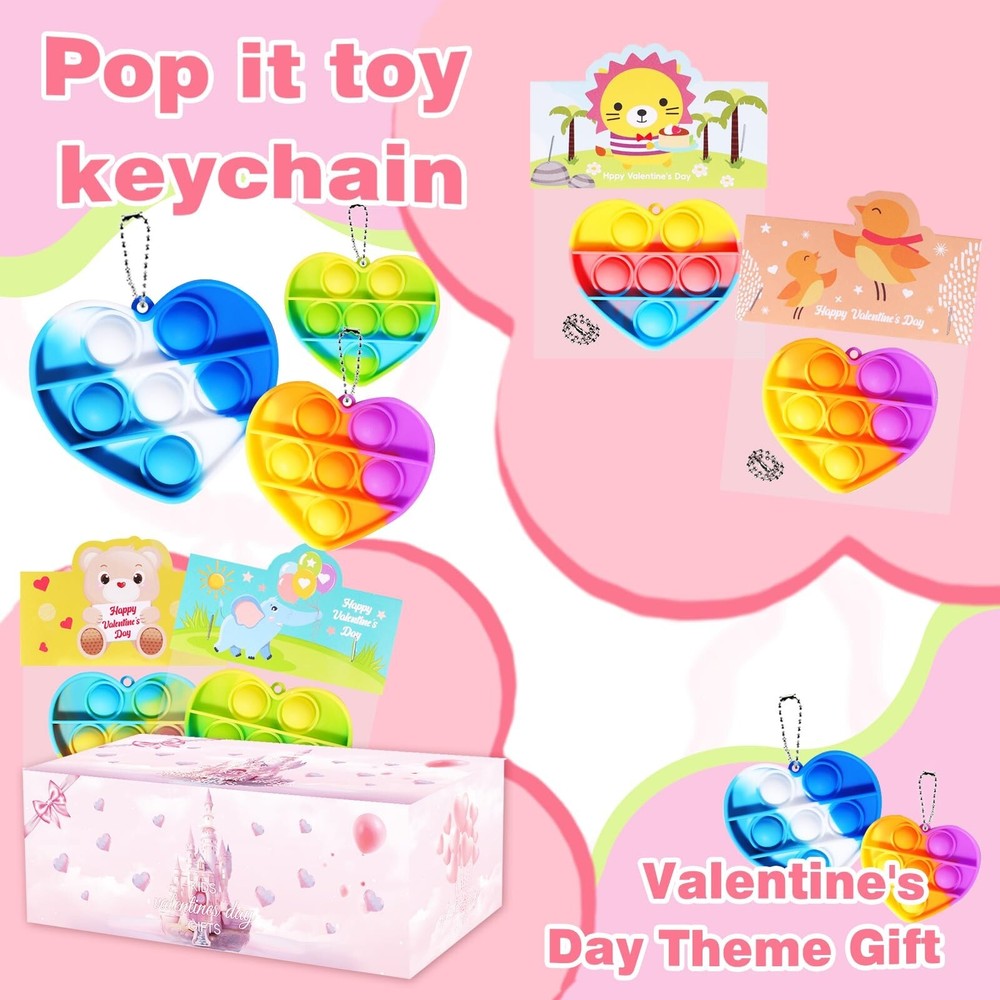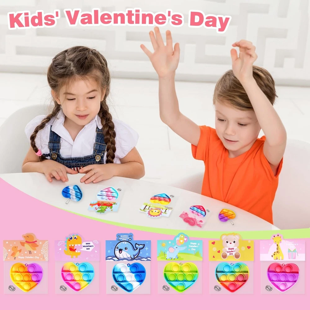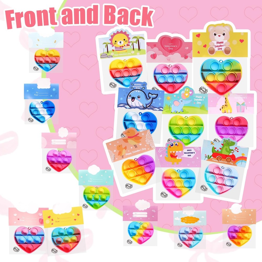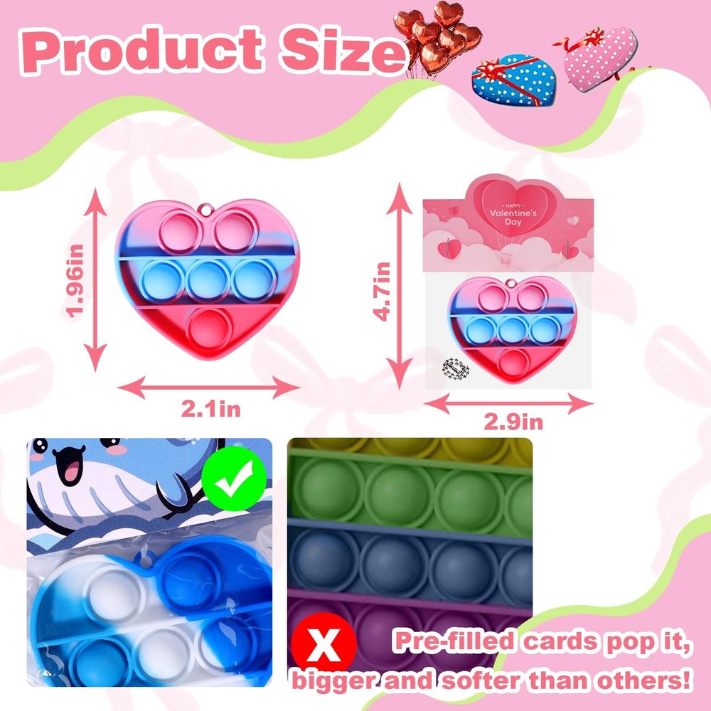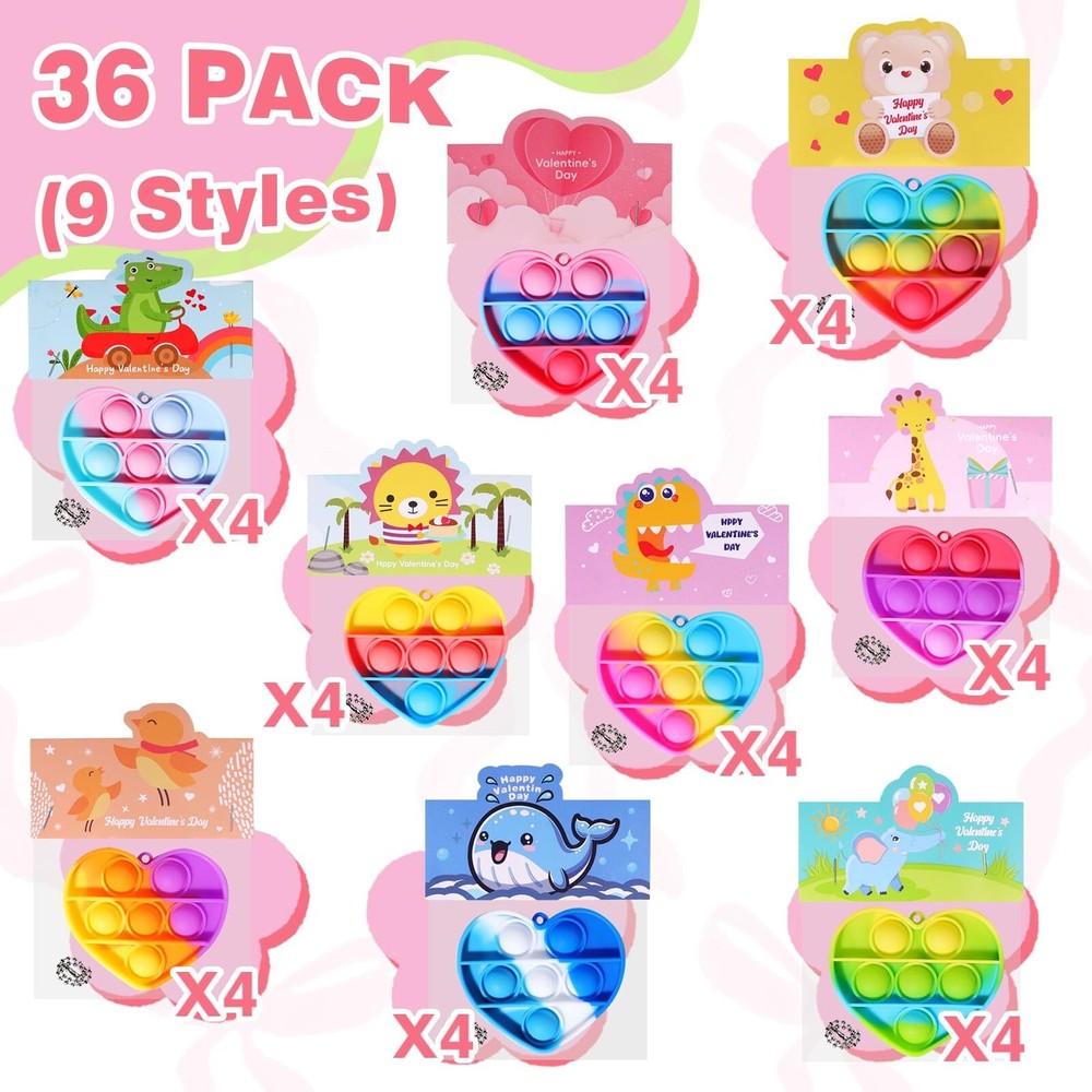 36 Pack Valentines Day Gifts for Kids - Prefilled Valentines Day Party Favors Heart Pop It Toys, Valentines Day Cards Bulk for Toddlers Kids School Classroom Exchange Product Details Product Dimensions: 5.1 x 3.1 x 8.4 inches Item Weight: 12.6 ounces Country of Origin: China Item model number: QR-12 Manufacturer recommended age: 12 years and up Manufacturer: APROAT 36PCS Valentines Day Gifts for Kids: Our product contains 36 pre-filled heart pop it toy cards in 9 style designs. The toys are color-mixed, and their bright and varied color palette is a great way to capture children's attention. Kids-safe Materials: All of these Valentine's Day party favors are nationally CPC safety certified and meet U.S. children's toy safety standards. Make Valentine's Day a safe and joyful experience for children. Valentines Day Party Card Design: Each Valentine's Day gift card is designed with a "FROM" & "TO" section for children to write their name and the name of the person they are giving the gift to, which is a great way to personalize the card and increase the children's involvement in the holiday. Pre-filled Valentines Day Party Favors: Our Valentine's Day party favors are pre-filled and require no secondary wrapping, which greatly saves you time in preparing Valentine's Day gifts for the kids. Suitable for A Variety of Occasions: This heart pop it set is suitable for Valentine's Day gifts for kids, class Valentine party, teacher classroom prizes, Valentines bag stuffing. Offer children a special Valentine's Day atmosphere!