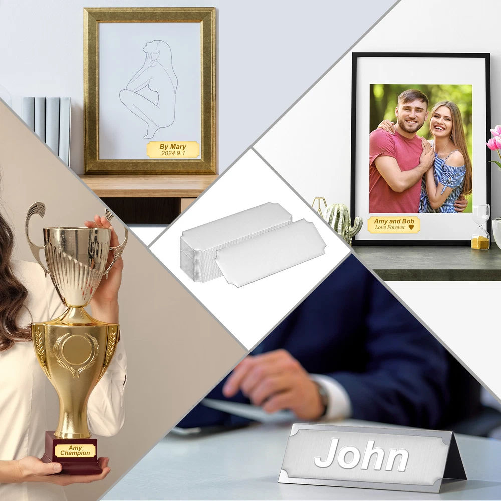 Document Our engraved nameplates are perfect for mounting on plaques, picture frames, sweaters, trophies, bags, display boxes, flag cases, and anything else.SpecificationMaterial: Stainless SteelColor: Silver ToneSize: 7.6 x 2.5 cm/3 x 1 Inch(L*W)Thickness: 0.4 mm/0.02 InchPacking List: 36 Pcs x Engraved NameplateAdvantageOur engraved nameplates are made of brushed stainless steel which is durable, stable, not easy to fade, rust, or break, and can be used for a long time. With a smooth surface, it will not scratch your skin.The right thickness makes the plate stronger and allows for deeper engraving. These elegant nameplates have a beautiful luster and a simple design. Suitable for various crafts to add brilliance.The protective film design can effectively prevent scratches. The adhesive backing design allows you to stick this nameplate anywhere without any tools and it can be firmly on the objects.InstructionPlace a metal workbench block underneath the blank stamping tags for better stamping.NOTE:1. There may be light scratches and blemishes due to shipping, but they can be polished.2. Only for laser engraving, not suitable for mechanical engraving.3. Please remove the protective film before use. 36 Pcs 3" x 1" Engraved Name Plate Picture Frame Label Art Tag, SiLver Tone Our engraved nameplates are perfect for mounting on plaques, picture frames, sweaters, trophies, bags, display boxes, flag cases, and anything else. Specification Material: Stainless Steel Color: Silver Tone Size: 7.6 x 2.5 cm/3 x 1 Inch(L*W) Thickness: 0.4 mm/0.02 Inch Packing List: 36 Pcs x Engraved Nameplate Advantage Our engraved nameplates are made of brushed stainless steel which is durable, stable, not easy to fade, rust, or break, and can be used for a long time. With a smooth surface, it will not scratch your skin. The right thickness makes the plate stronger and allows for deeper engraving. These elegant nameplates have a beautiful luster and a simple design. Suitable for various crafts to add brilliance. The protective film design can effectively prevent scratches. The adhesive backing design allows you to stick this nameplate anywhere without any tools and it can be firmly on the objects. Instruction Place a metal workbench block underneath the blank stamping tags for better stamping. NOTE: 1. There may be light scratches and blemishes due to shipping, but they can be polished. 2. Only for laser engraving, not suitable for mechanical engraving. 3. Please remove the protective film before use. Hot Item Payment 1.We accept eBay payment . 2.Payment must be received within 7 business days of auction closing. Shipping 1.We ship to your eBay or Paypal address. Please make sure your eBay and Paypal address is correct before you pay. 2.Items will be shipped within 1-3 business day when we received payment. 3.Delivery time depends on destination and other factors. Description Policy 36 Pcs 3" x 1" Engraved Name Plate Picture Frame Label Art Tag, SiLver Tone Our engraved nameplates are perfect for mounting on plaques, picture frames, sweaters, trophies, bags, display boxes, flag cases, and anything else. Specification Material: Stainless Steel Color: Silver Tone Size: 7.6 x 2.5 cm/3 x 1 Inch(L*W) Thickness: 0.4 mm/0.02 Inch Packing List: 36 Pcs x Engraved Nameplate Advantage Our engraved nameplates are made of brushed stainless steel which is durable, stable, not easy to fade, rust, or break, and can be used for a long time. With a smooth surface, it will not scratch your skin. The right thickness makes the plate stronger and allows for deeper engraving. These elegant nameplates have a beautiful luster and a simple design. Suitable for various crafts to add brilliance. The protective film design can effectively prevent scratches. The adhesive backing design allows you to stick this nameplate anywhere without any tools and it can be firmly on the objects. Instruction Place a metal workbench block underneath the blank stamping tags for better stamping. NOTE: 1. There may be light scratches and blemishes due to shipping, but they can be polished. 2. Only for laser engraving, not suitable for mechanical engraving. 3. Please remove the protective film before use. Hot Item Payment 1.We accept eBay payment . 2.Payment must be received within 7 business days of auction closing. Shipping 1.We ship to your eBay or Paypal address. Please make sure your eBay and Paypal address is correct before you pay. 2.Items will be shipped within 1-3 business day when we received payment. 3.Delivery time depends on destination and other factors.