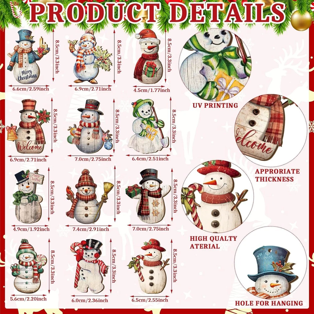 AutoDS Template Store New Arrivals Add to Favorite View Feedback Contact 36 Pcs Snowman Ornaments for Christmas Tree Snowman Christmas Decorations Snowma 36 Pcs Snowman Ornaments for Christmas Tree Snowman Christmas Decorations Snowma Package Includes: our package includes 36 pieces of wooden Christmas tree ornaments, with 12 different styles, 3 pieces of each style, the quantity is enough to meet your Christmas decoration needs Quality Materials: vintage Christmas decorations are made of quality wood, with clear printing, smooth surface and edges, exquisite cutting, wear resistant, not easy to deform or fade Suitable Size: the size of our snowman Christmas decorations is about 3.35 x 2.91 inches/ 8.5 x 7.4 cm, suitable for your various hanging needs, helping to create a joyful Christmas atmosphere Christmas Theme: our rustic Christmas ornaments feature snowman shapes wearing festive scarves and hats, holding iconic Christmas items such as candy, brooms, Christmas gifts, and so on, adding a strong Christmas atmosphere to your home Wide Applications: these vintage Christmas decor can be hung on doors, shelves, fireplaces, Christmas trees, windows, and so on; They are great decorations for home, office, farmhouse, helping to create a Christmas atmosphere Features: These snowman Christmas tree ornaments are suitable for offices and farmhouses, creating a joyful atmosphere of Christmas. This Christmas ornaments set contains 36 Christmas snowman ornaments in different styles, enough to meet all your home or party decoration needs, decorate your Christmas tree or share with others. Specifications: Material: wood Package includes: 36 x Christmas ornaments Notes: Manual measurement, please allow slight errors on size. The color may exist a slight difference due to different screen displays. Item model number SHY--367 Style Rustic Country of Origin China Item Weight 7 ounces Package Dimensions 9.61 x 9.02 x 0.83 inches Product Dimensions: 9.02 inches x 9.61 inches x 0.83 inches. Weight: 7.0 oz About Us Welcome to our eCommerce shop. We're dedicated to providing you with high-quality products at unbeatable prices. Our professional customer support team is more than happy to help with anything that you need. We’re proud to serve you and bring a smile to your face with our top-notch service and products. Please visit our eBay store for a full list of products on sale, and don’t miss what we have to offer. Payment policy We only accept payments made by PayPal. Please make sure that your PayPal and eBay shipping addresses match. Immediate payment is required before we send out your package. Shipping policy We are always working hard to ensure your package arrives as soon as possible. Please understand that some factors like weather, high postal traffic, and the performance of shipping companies are outside of our control. In most cases, your package will arrive before due time as it is a high priority for us. If there are any unexpected delays, please let us know and we will take care of it immediately. We have multiple locations in the US; residents of these states will be charged tax according to the state they reside in. Tax information is available at checkout. Returns We are committed to your happiness. That’s why we offer a 30-Day Return Policy on items that you are not completely satisfied with. You have the option for a refund or an exchange of the item. No returns are available on items shipped outside of the USA.