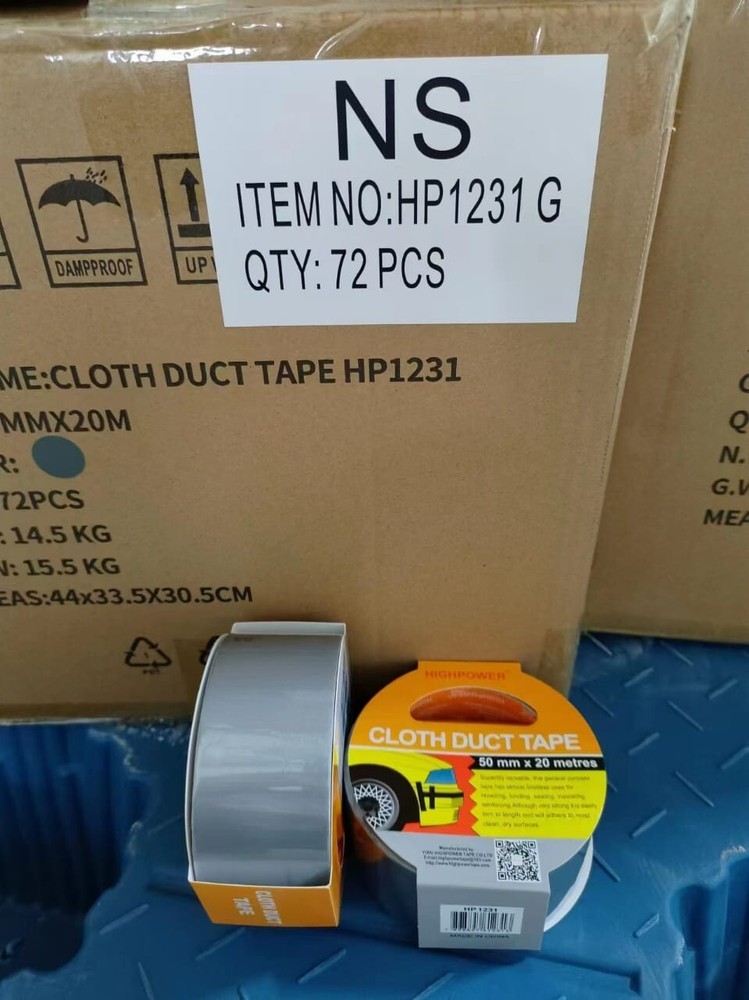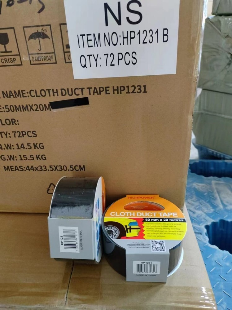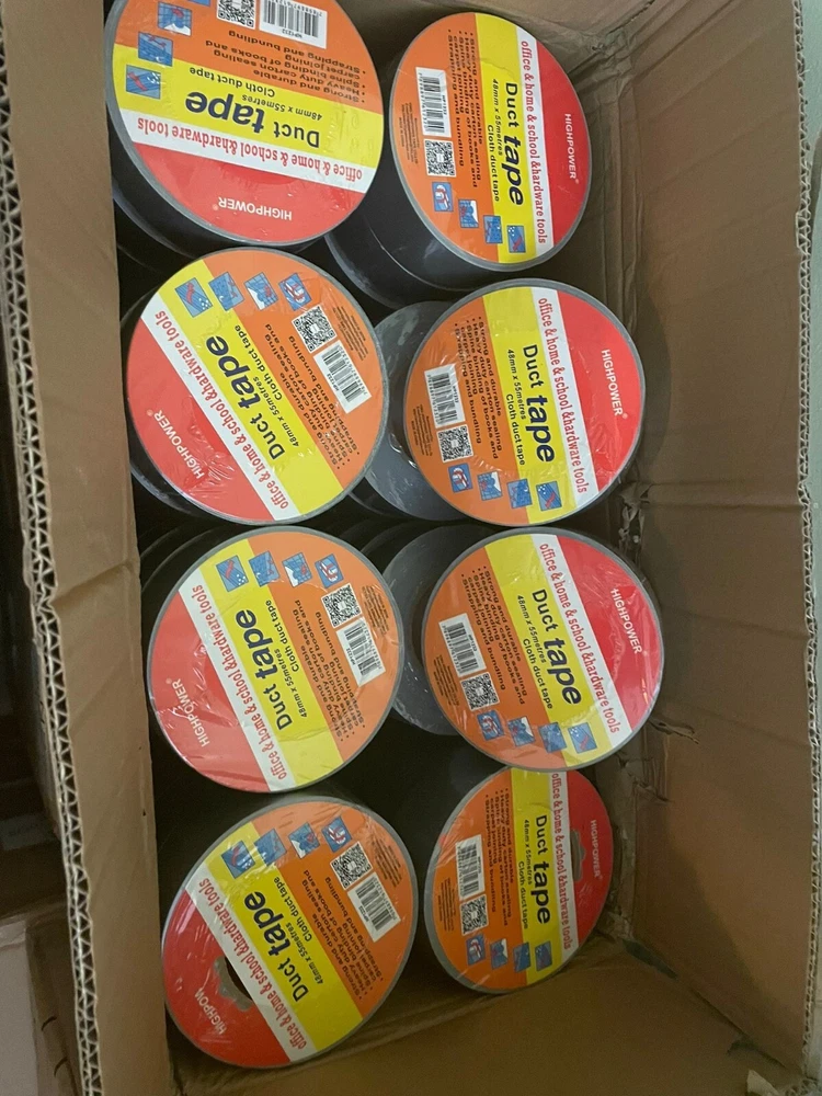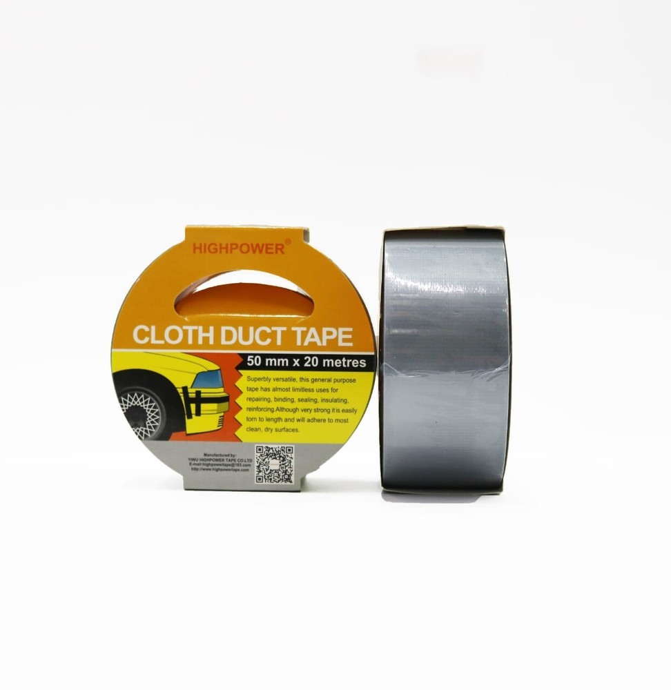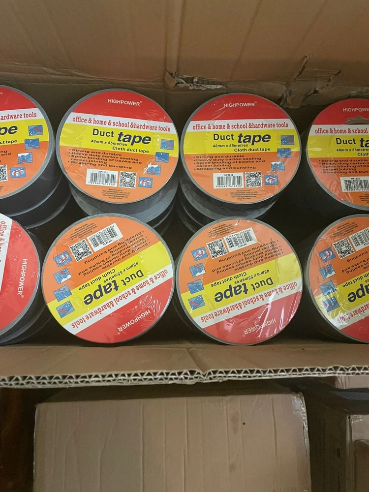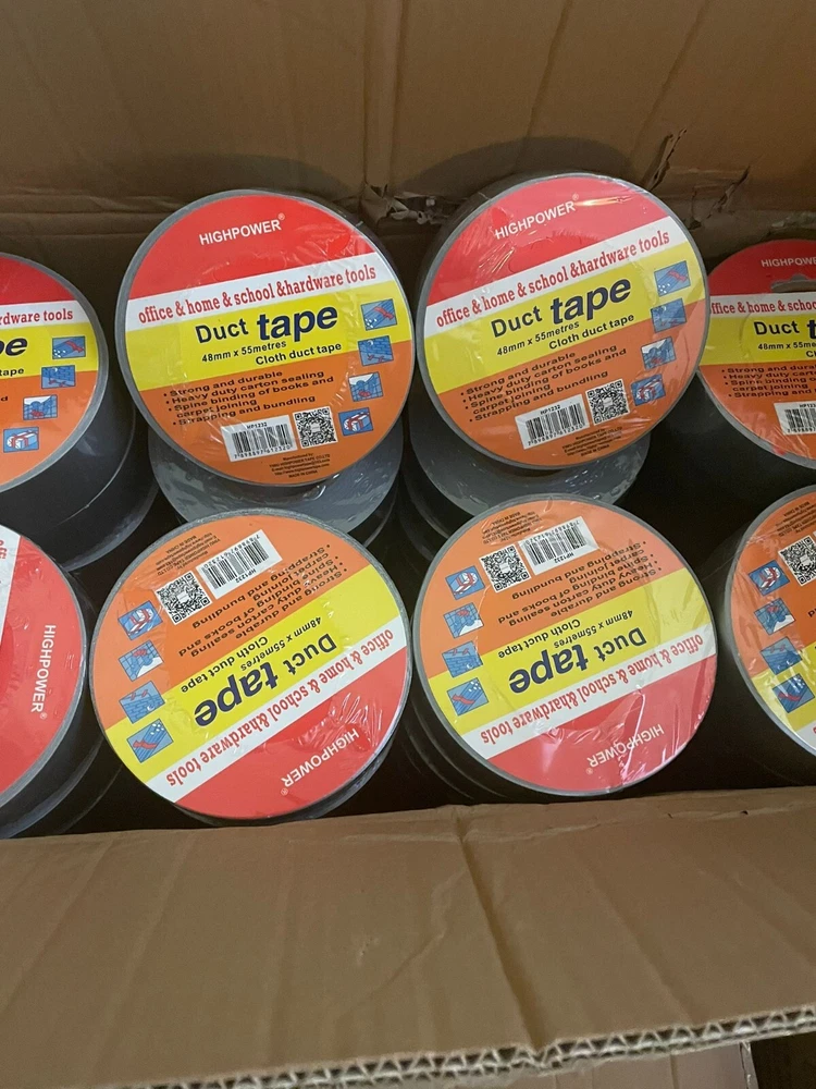 Utility Grade Duct Tape Economy grade polyethylene-coated cloth with a natural rubber adhesive. Good tensile strength, hand tearable, excellent moisture resistance. Conforms well to irregular surfaces. Used for bundling, heavy carton sealing, general maintenance, pipe wrapping, carpet fixing, AC duct seaming and joint sealing. 3" neutral core. Physical Properties: Total Thickness: 7.2 Mils Adhesion to Steel: 44 oz/in Tensile Strength: 31lbs/ in Elongation: 19% Temperature Range: -4 F to 140 F AVAILABLE IN LARGE QUANTITY Size : 50MM (2 in) X 20M (66 Fts) . Quantity : 36 Rolls Available : Silver & Black Color