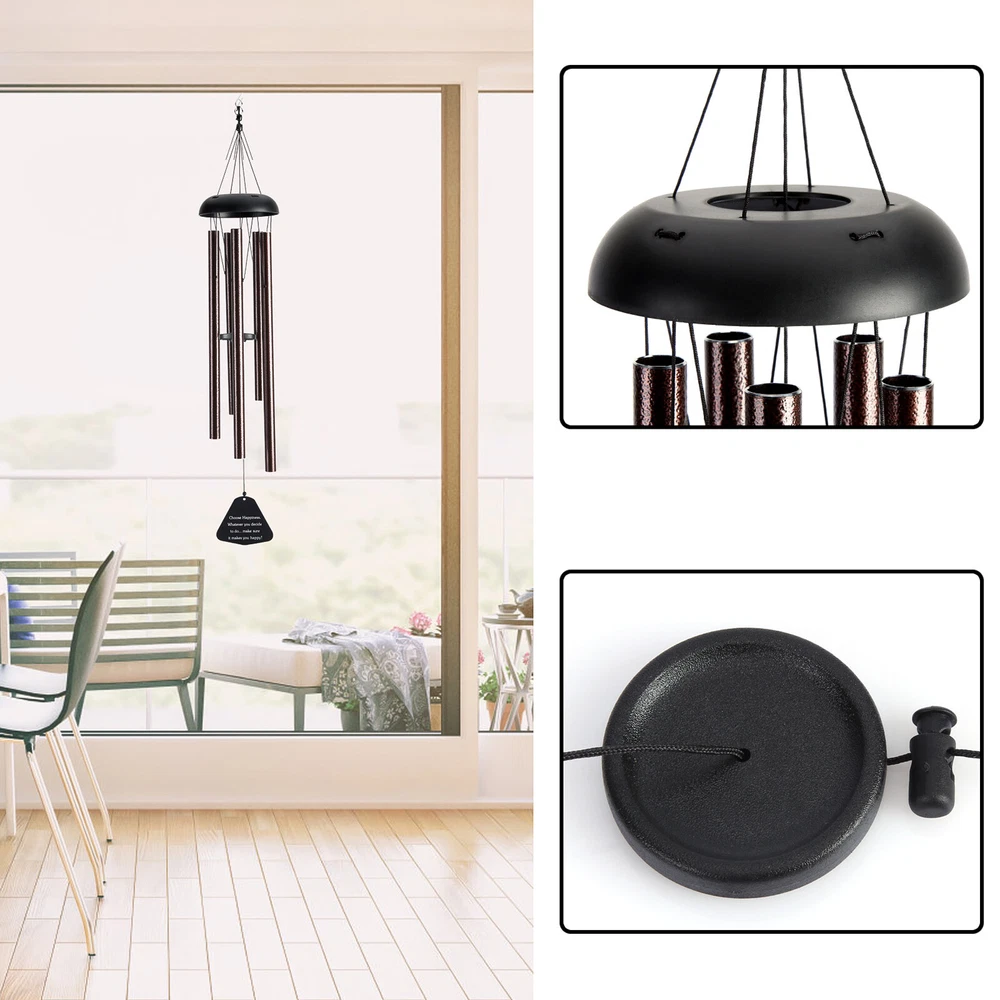 Features Premium Aluminum Construction Crafted from high-quality aluminum with a vintage bronze finish, rust-resistant and durable. Each large metal tube is hand-tuned by professional experts for clear, melodious tones. Equipped with heavy-duty nylon cording and a high-density striker for stable resonance. Adjustable Sound & Smooth Edges Adjust the bell position to change scales and create different melodies. Polished smooth tube edges ensure safe handling without scratching fingers. 5 Large Decorative Tubes 5 tubes of varying lengths with unique patterns, designed for distinct appearance and long-lasting stable sound. Ideal for patios, gardens and outdoor spaces. Lucky Lucky Pendant Decor Bottom lucky pendant swings with the wind, creating a gentle, harmonious atmosphere. Reflective surface shines in sunlight, serving as an eye-catching yard and home decoration. Meaningful Gift Option Perfect as a sympathy gift, housewarming, wedding, anniversary, birthday or hospitality present. Suitable for friends, mom, neighbors and family to express care and blessings. Product Specifications Item Details Material Aluminum Color Bronze Cap Diameter 5.3 inch Total Length 36 inch Number of Tubes 5 Tube Lengths 11.6 / 12.5 / 13.7 / 14.9 / 15.9 inch Tube Diameter 0.79 inch Tube Thickness 1/25 inch Pendant Size 4.5 x 3.9 inch Package Includes 1 x Wind Chime After-Sale Guarantee We offer free return and exchange service for quality-related issues within 30 days of delivery. One-year after-sales support is provided for product defects and abnormal use problems. If you have any questions about insta llation or use, please feel free to contact us, we will reply and solve your problem within 24 hours.