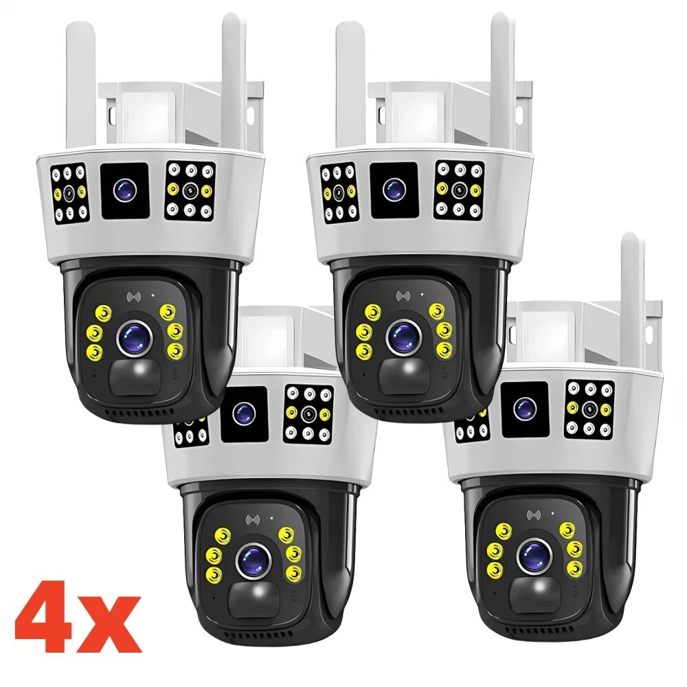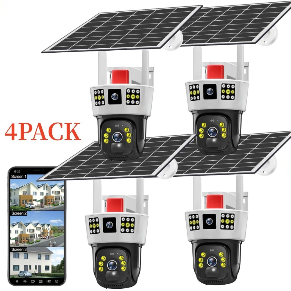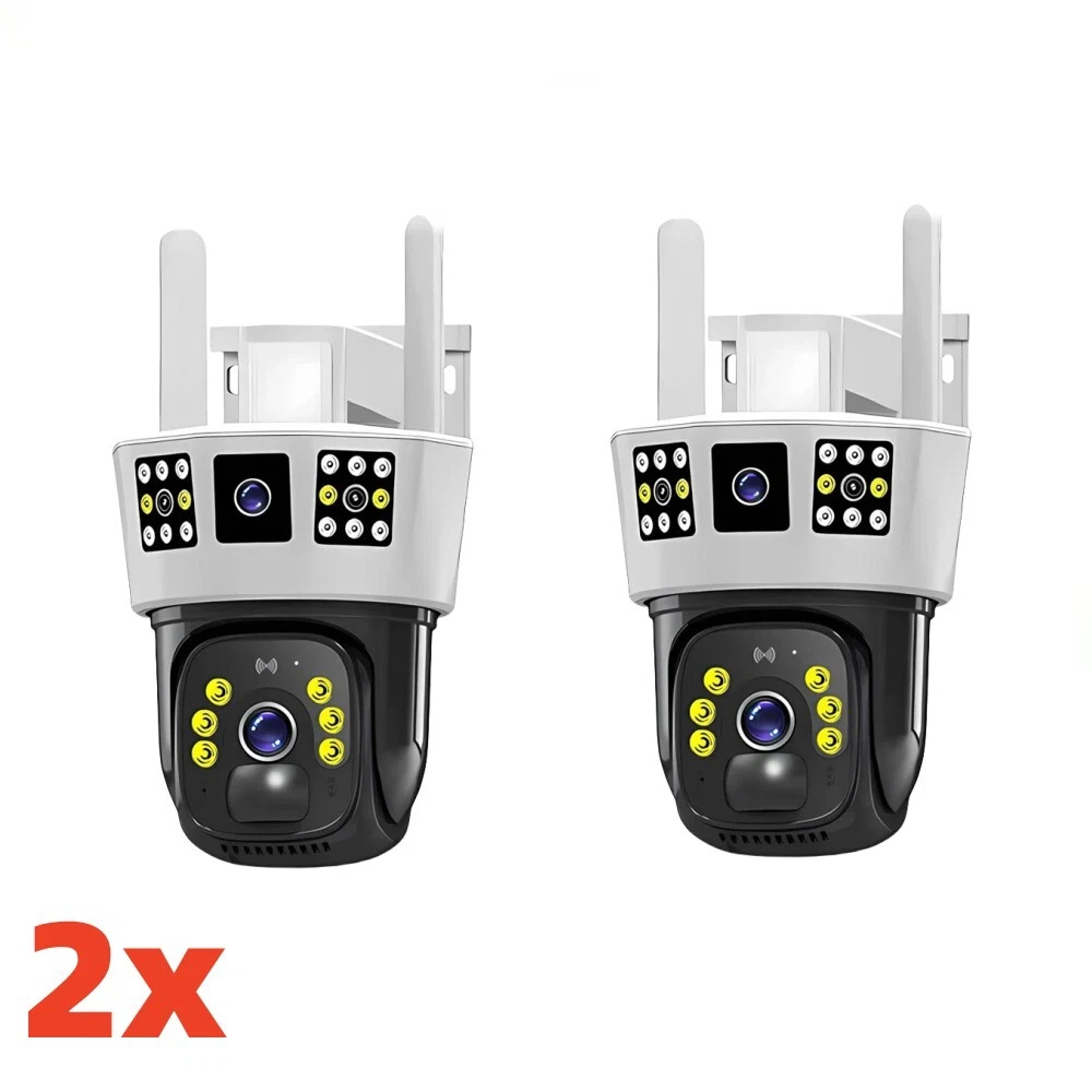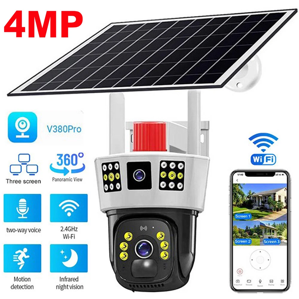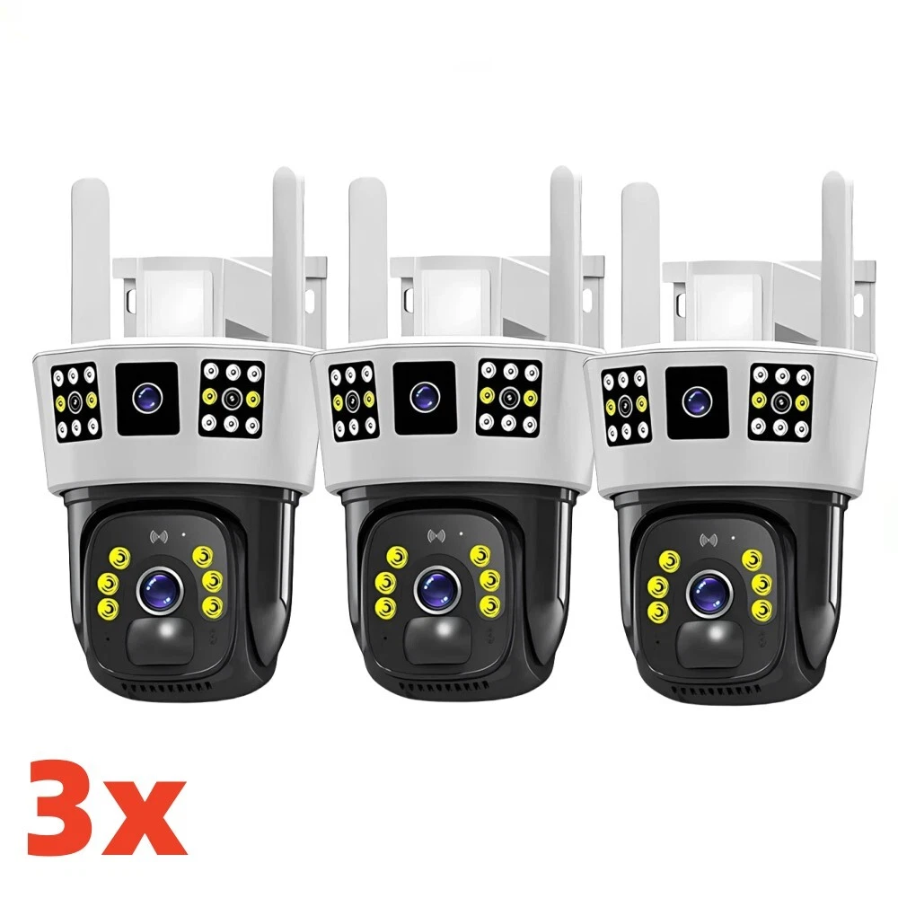 3 screens shows on the V380 app Three images can be viewed simultaneously, and each image can be individually enlarged. Real time alerts Set up monitoring areas in advance, conduct actual testing, and promptly push alarm information. IP66 Waterproof / Dustproof The camera is equipped with IP66 case , which is waterproof, sun-proof and dust-proof. It is suitable for any environment. Clear Two Way Audio Built-in microphone and speaker / Customized new speakers with loud volume; You could talk to anyone nears the camera ( Warn someone to leave your house ). Advanced H.265 Video Compression H.265 (HEVC) doubles the coding efficiency compared with its predecessor H.264. H.265 video saves around 50% of the bit rate at the same quality of coding.H.265 only need less bandwidth,faster loading speed,more smooth video,Lower bite rate,higher image quality! 10X Zoom(Both 3 cameras support zoom) you can switch from 1X to 10X zoom instantly;it can fast zoom in or zoom out without lag;watch far and near images Simultaneously through Picture in Picture,don't miss a detail. Full Color Night Vision: When the white LED light is on, the camera will display colorful vision at night, and there are three night modes for you to choose. Ai Human Detect Alert Quickly finds human targets and immediately sends a notification to your phone, letting you see what happens anywhere. It only detects the human shape and will not trigger falsely for objects such as cars and trees. PTZ Control by APP Rotates 355° Horizontally and 90° Vertically.You can control it in the APP directly whenever you want and wherever you are.