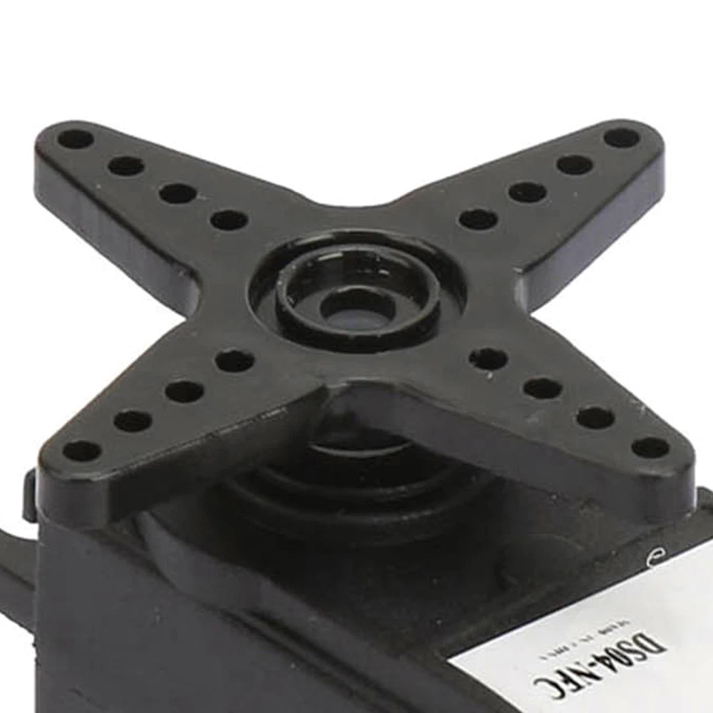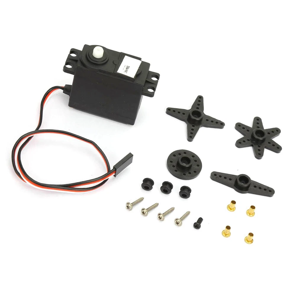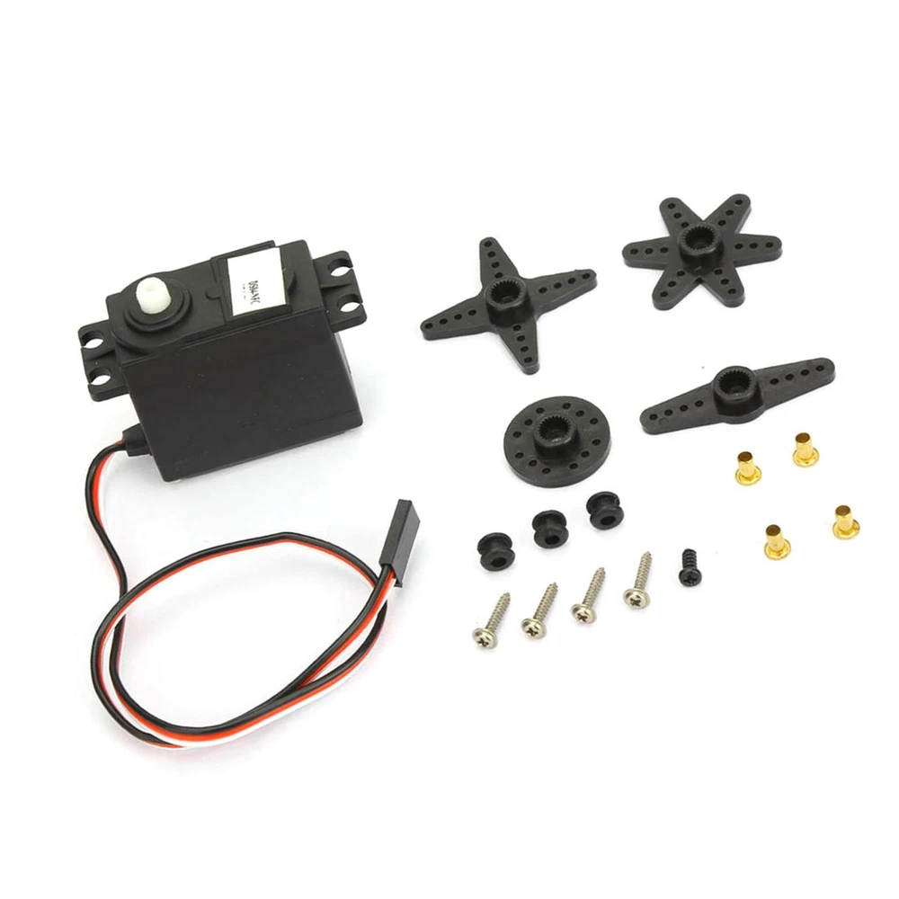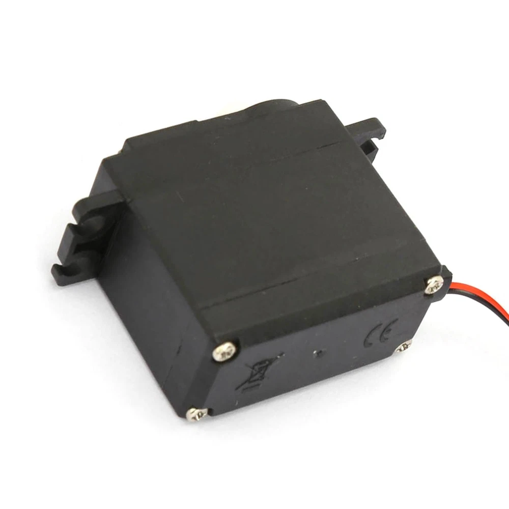 Description: The signal terminal needs to be input with one 50 HZ wave, then the duration of high level pulse, which is used to control signal cycle, can control and forward/backward rotation as well as stalling. The duration of high level corresponds to a. When high level is 1ms - 1.5ms, servo rotates forward(the rotate is the fastest when it is 1ms, the higher the lower, servo will stop rotating when reaching 1.5ms). When high level is 1.5 - 2ms, the servo rotates backward(The servo stops rotating when reaching 1.5ms, when the duration is closer to 2ms, the closer, the faster. The backward rotation, the fastest when reaching 2ms) This servo carries meso-position adjustment potentiometer(it can only be seen by peeling off the outer cover and circuit board). We can set high level pulse at 1.5ms to observe that whether servo stops rotating. If it doesn't stop rotating, we keep adjusting the potentiometer until it does. Features: 1. High quality and fine workmanship, rust-proof, durable and practical. 2. Easy to install, used to model aircraft / Cars / Robots. 3. Smooth edge design, good performance, stable and sturdy. 4. Compact & Save Space: Reasonable size and lightweight, portable for carrying and using. 5. The steering gear with a median adjustment potentiometer (open shell to pry the circuit board to see), debugging can be high pulse is set at 1.5 ms to observe the steering gear stall, if you stop and turn on the regulation potentiometer until the stall so far, so the zero. Specification: Condition: Brand New Item Type: 360 Degree Continuous Rotation Servo Motor Material: Metal + Plastic Color: Black Product Size: Approx. 40.8*20*39.5mm / 1.6*0.8*1.6inch Weight: Approx. 52g / 1.8oz Uses: Aircraft models, Car models, Robots, etc. Operating Temperature: 0°C - 60°C Current Usage: <1000mA Wiring Method: As can be seen from the figure, the steering gear has three lines: red line, black line, and white line. 1. The red line is the positive pole of the power supply, connected to the positive pole of the 5V-6V DC power supply. 2. Black wire is connected to the negative pole of the power supply. 3. White line signal input, which is the 50HZ signal input line mentioned. Package list: 1 x 360 Degree Continuous Rotation Servo Motor 4 Arm 4 Arm 4 x Rat-tail Screw 4 x Flat Tail Screw 1 x Black Flush Tail Screw Notes: 1. The actual product color may deviate from the photo due to light. 2. There may be a slight deviation in the measurement of product.