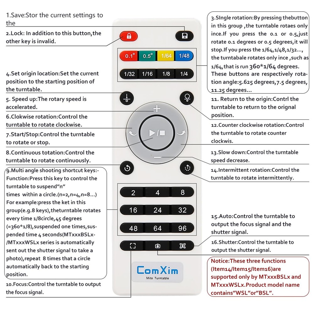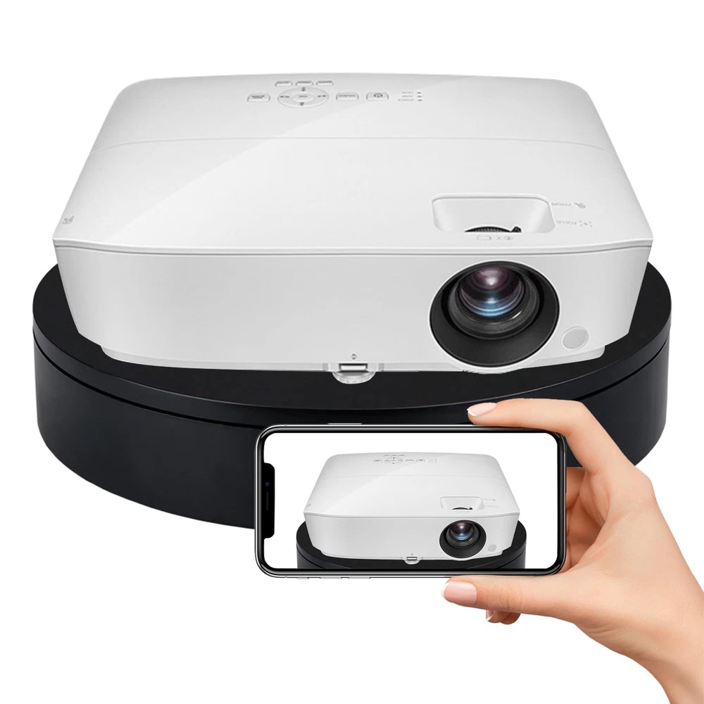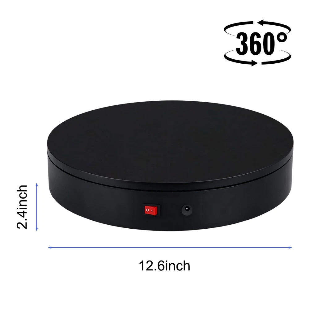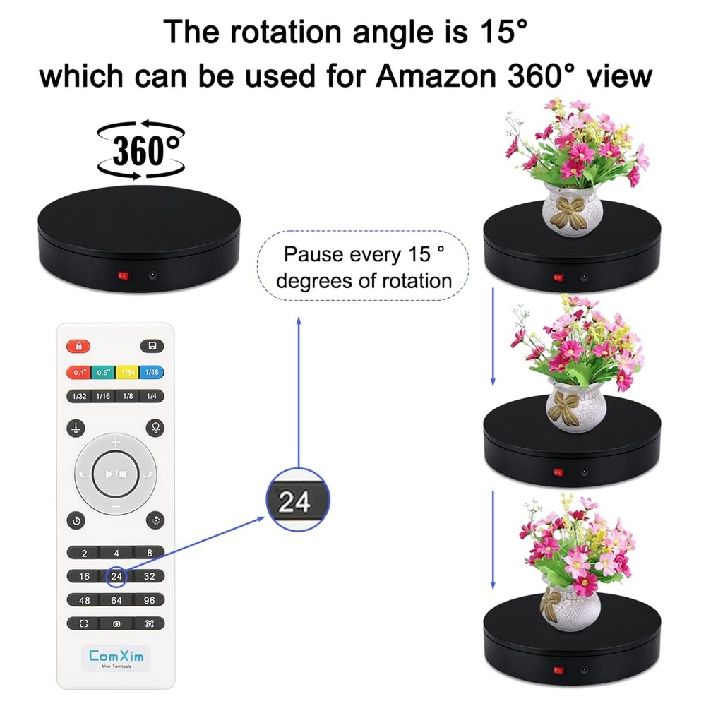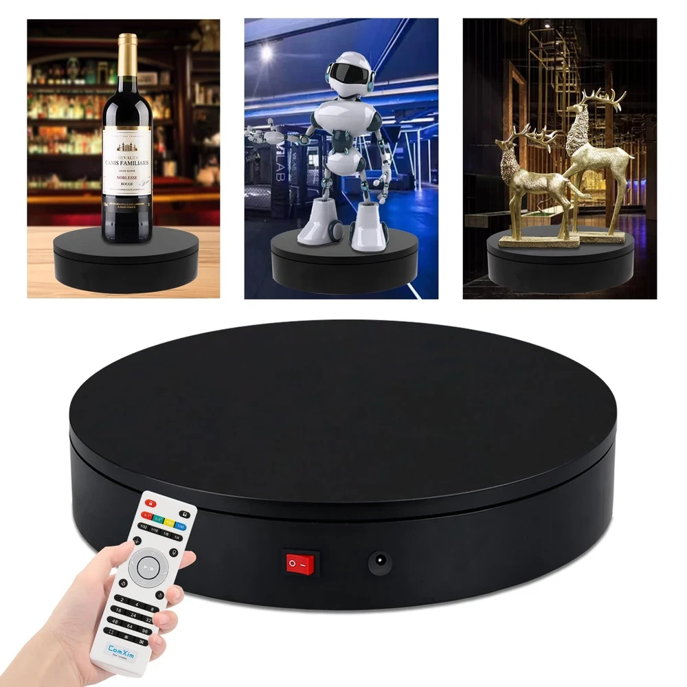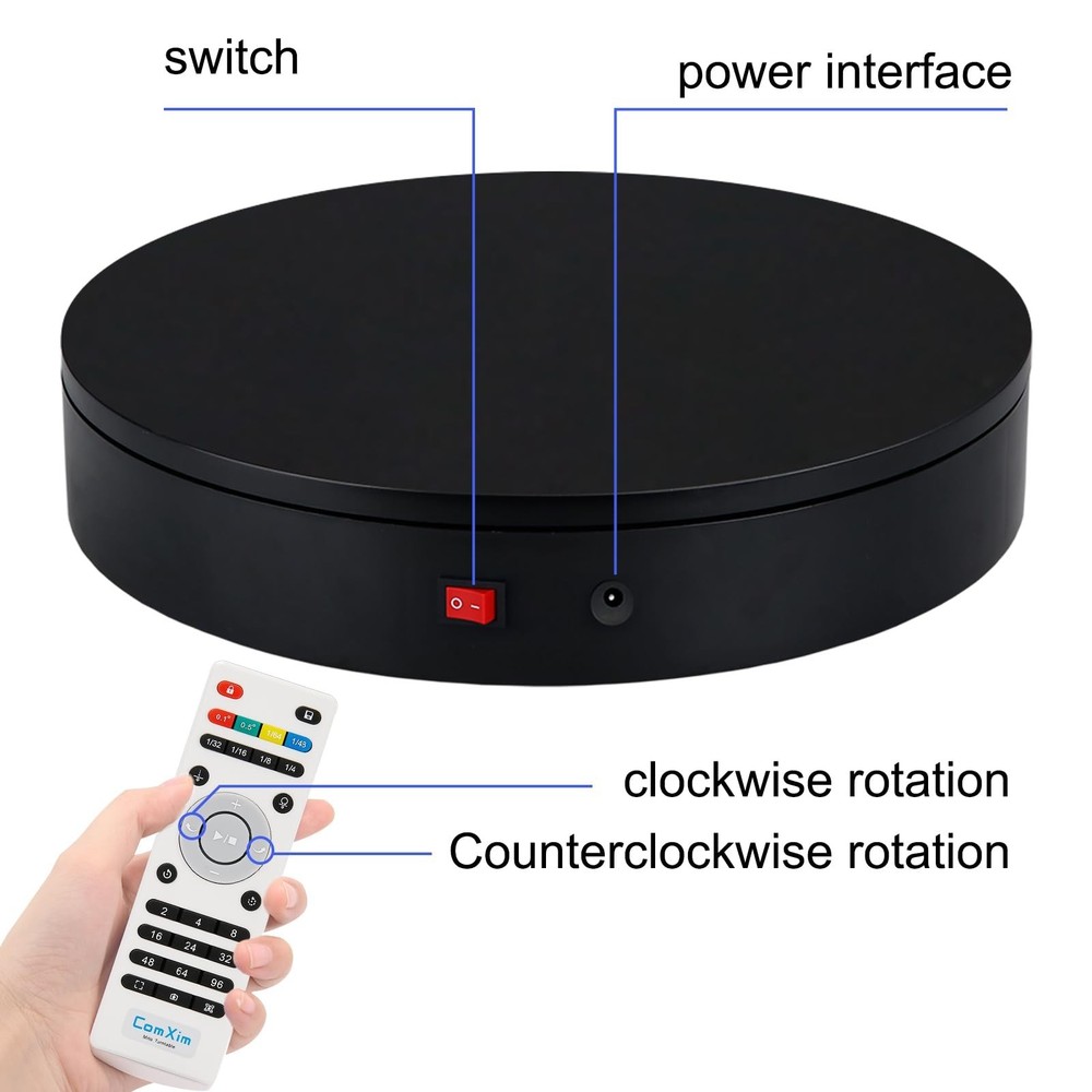 360 Degree Motorized Rotating Display Stand for Display,Automatic Electric Turntable with Remote Control 88-200Lbs Load,12.6in, Photography Lazy Susan to Control Angle, Speed and Direction - Buy Now with Fast Shipping! 360 Degree Motorized Rotating Display Stand for Display,Automatic Electric Turntable with Remote Control 88-200Lbs Load,12.6in, Photography Lazy Susan to Control Angle, Speed and Direction Product Details Brand: ComXim Material: Acrylonitrile Butadiene Styrene (ABS) Color: Black Maximum Weight Recommendation: 200 Pounds Item Diameter: 32 Centimeters Item Weight: 3.86 pounds Manufacturer: Shenzhen ComXim Technology Co., Ltd. Country of Origin: China Item model number: MT320RL40FU-B Is Discontinued By Manufacturer: No Diameter: 32 Centimeters Fabric Type: Plastic Maximum recommended load: 200 Pounds Batteries required: No Key Features ✅ Plastic ✅ Convenient Remote Control: The remote control adopts advanced infrared technology to experience the convenience of a contactless turntable. The remote control uses two AAA batteries, which are not included. You can freely control the angle, speed, and rotation mode at a distance of 5 meters from the turntable. ✅ Three Rotation Modes: connect the power, turn on the switch, and if you want to save the already set mode, you can press the save button. Continuous rotation, intermittent rotation, and one stop per angle are three rotation modes that can be switched freely. ✅ Reasonable Design: The rotation speed of the motorized electric turntable is in the range of 27-72 seconds, which can be fast or slow, and can be adjusted through the remote control. Using a pure copper motor and the load-bearing range of this Rotating display stand is between 88-200 pounds. In continuous rotation mode, the load-bearing capacity can reach 200 pounds. If rotated by angle, it involves rotation accuracy, and the load-bearing capacity is 88 pounds. It can meet the needs of indoor display and outdoor shooting. ✅ Excellent Material: The photography turntable is made of high-quality raw materials, and the frosted tabletop and bottom are covered with foot pads, which have anti slip and fixing effects. ✅ Widely Used: This rotating display stand can be used for product details introduction and display, exhibitions, 3D scanning, product display, video shooting, product photography, 360-degree photography, Cosmetics display, arts and crafts display, antique display. ✅ What You Get: ComXim 12.6 inch turntable, 59 inch power cable (150cm), 31 key multifunctional remote control (not include battery) , user guide and friendly customer service. Product Description